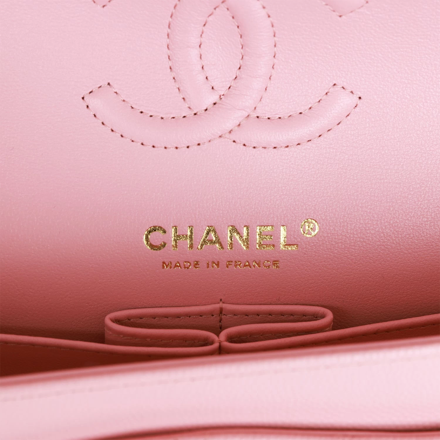 The interior is lined in pink leather with the “love letter” zipper compartment underneath the first flap, an “outer” slit pocket under the second flap, and an interior compartment with two open pockets separated by a “lipstick” compartment.
