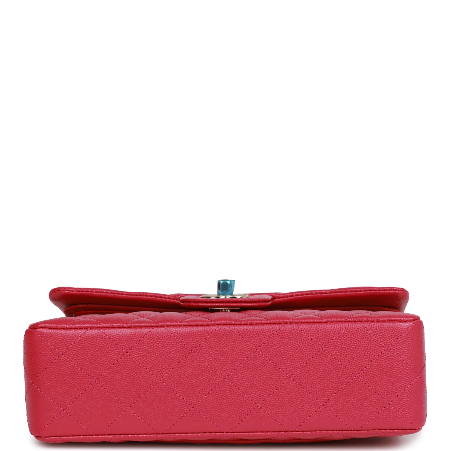 This Small Classic Double Flap bag is in fuchsia caviar leather with light gold tone hardware and features a front flap with signature CC turnlock closure, half moon back pocket, and adjustable interwoven light gold tone chain link and fuchsia leather shoulder strap.