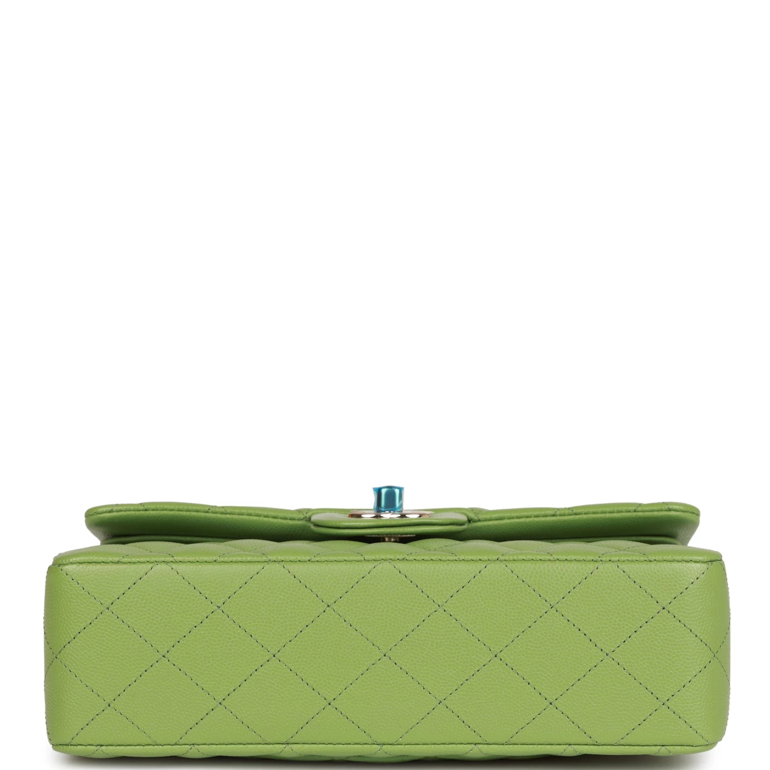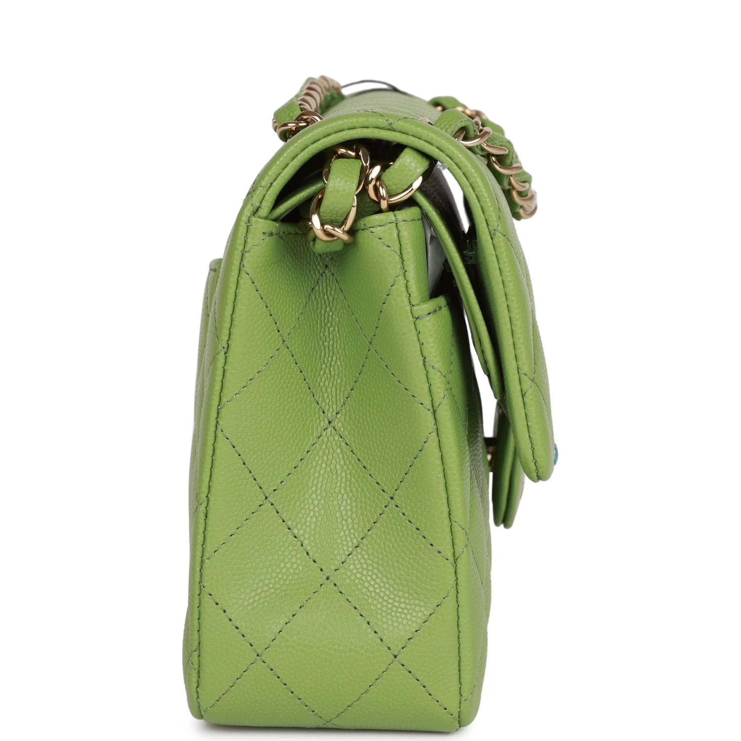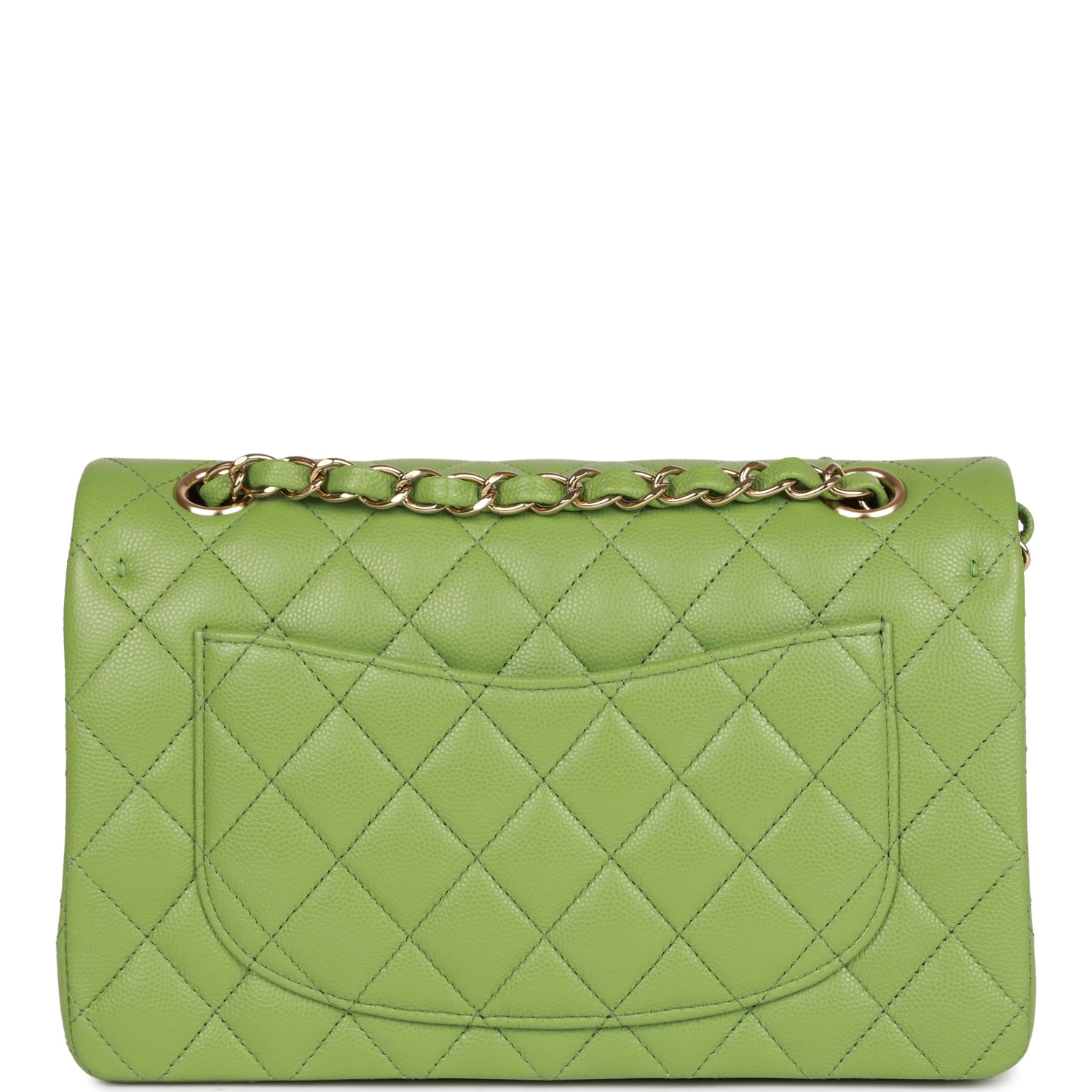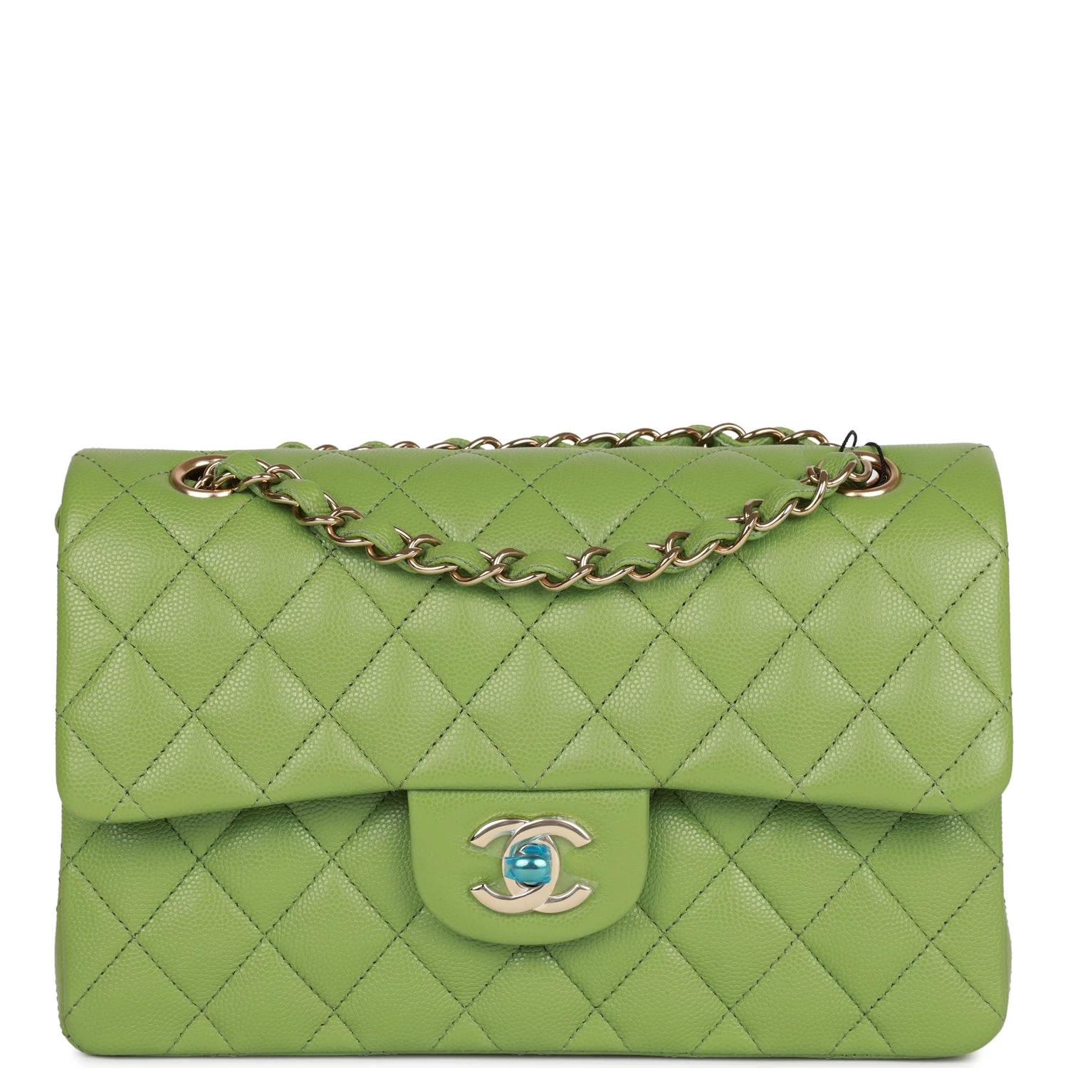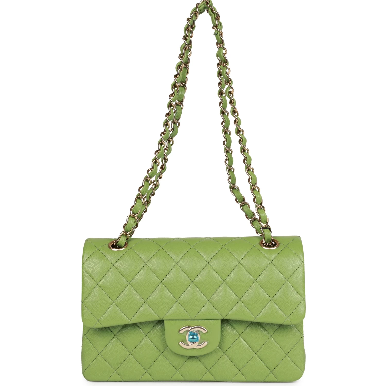 This Small Classic Double Flap bag is in Green caviar leather with light gold tone hardware and features a front flap with signature CC turnlock closure, half moon back pocket, and adjustable interwoven light gold tone chain link and green leather shoulder strap.