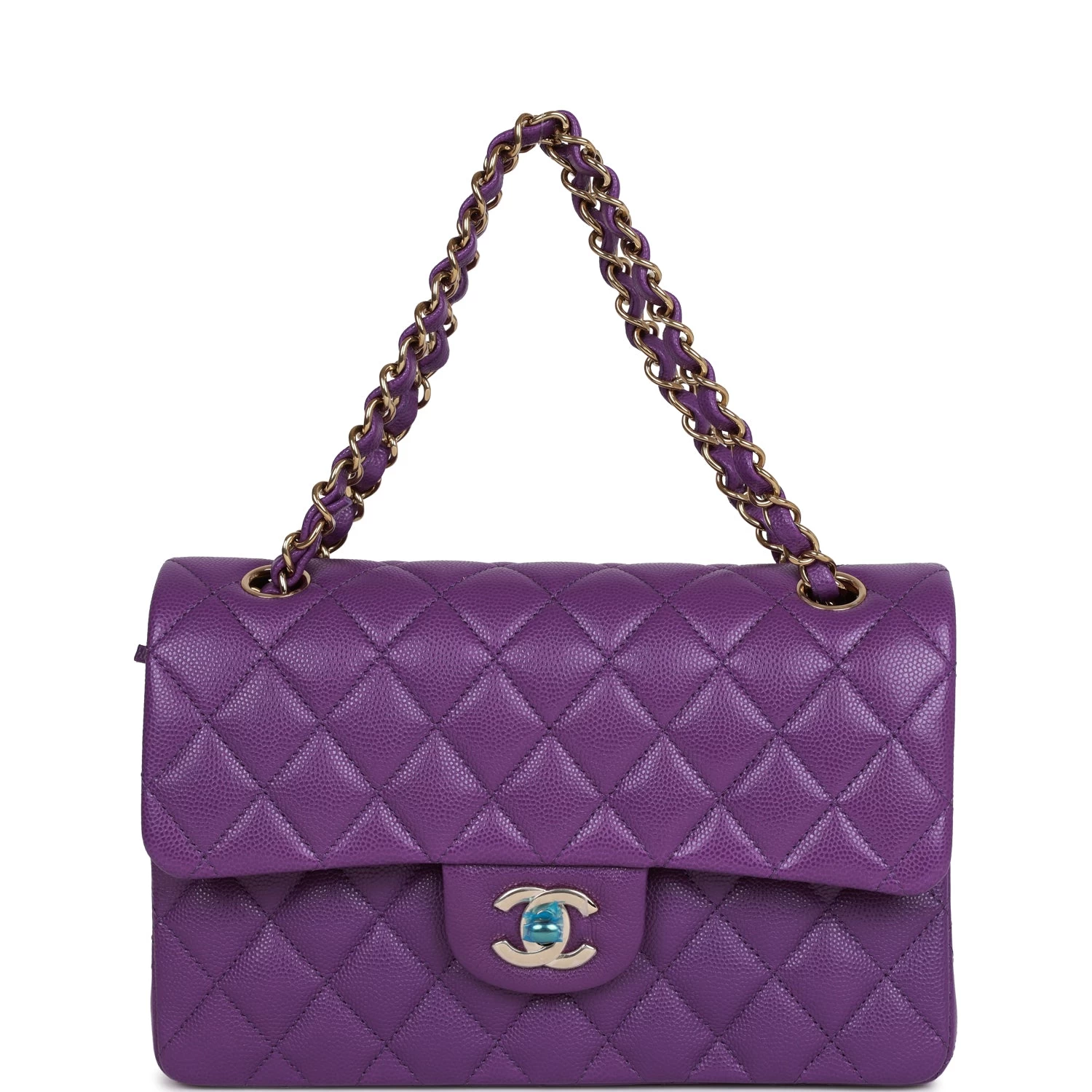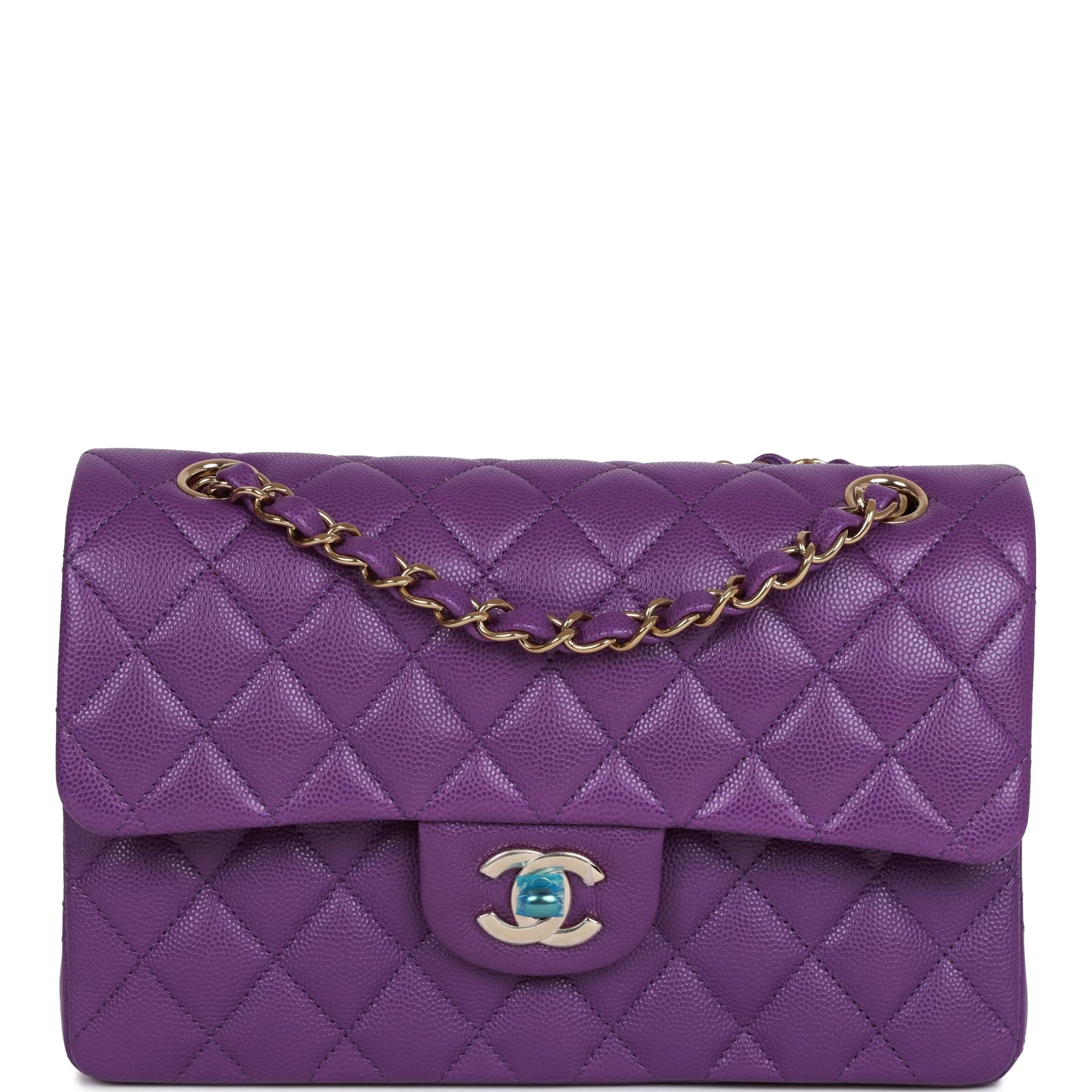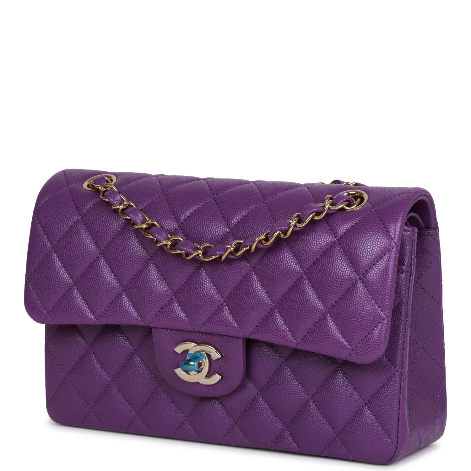 This Small Classic Double Flap bag is in purple caviar leather with light gold tone hardware and features a front flap with signature CC turnlock closure, half moon back pocket, and adjustable interwoven light gold tone chain link and purple leather shoulder strap.