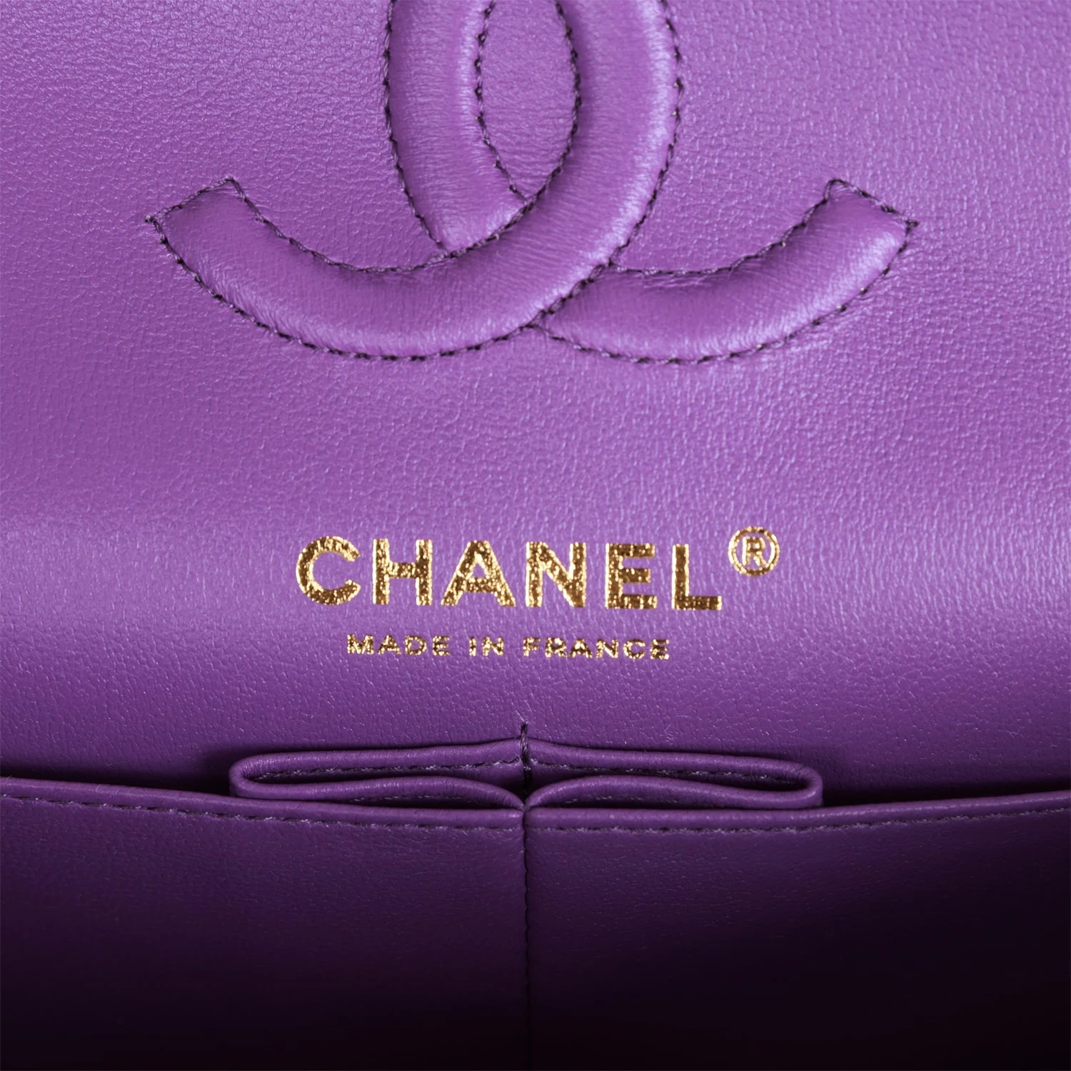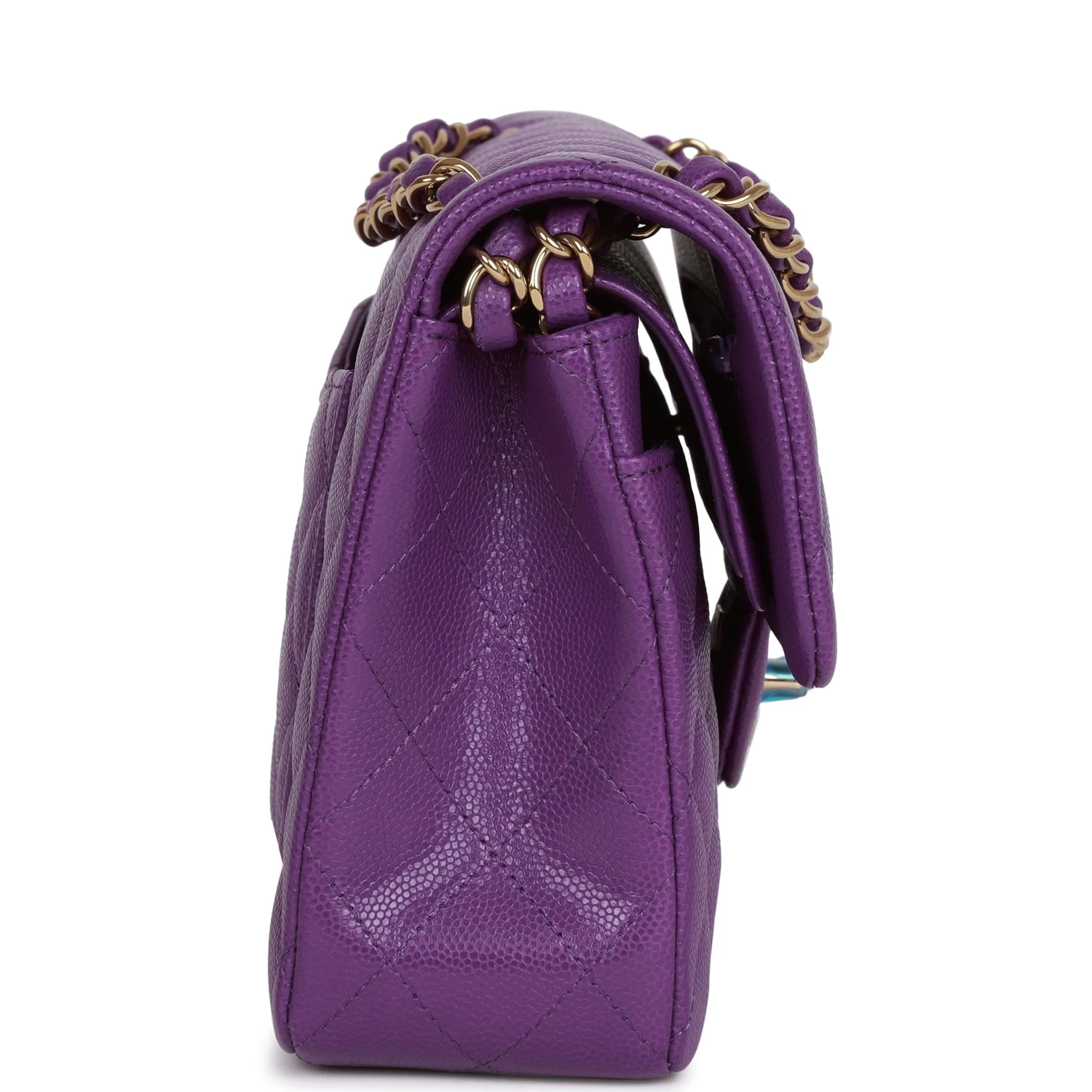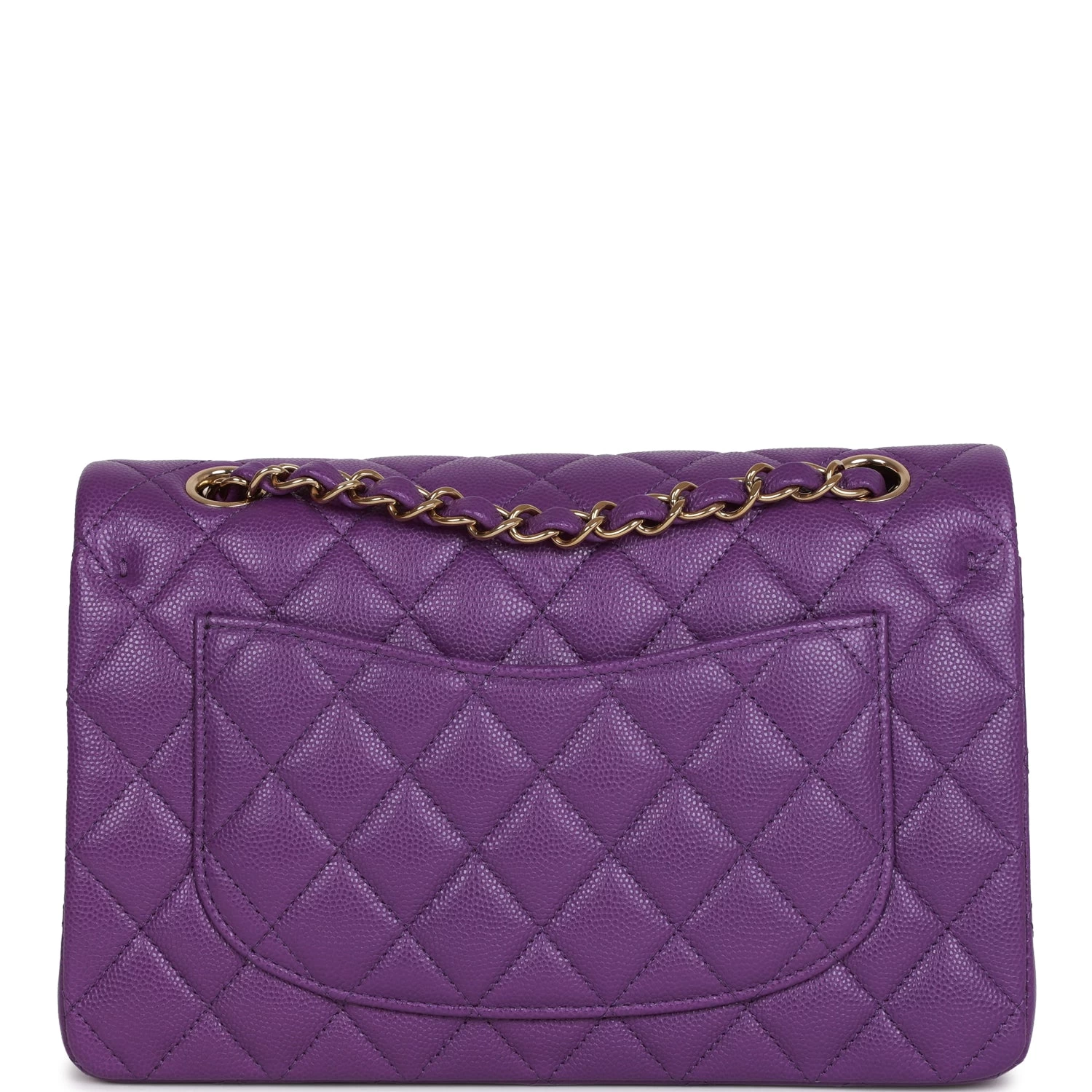 This Small Classic Double Flap bag is in purple caviar leather with light gold tone hardware and features a front flap with signature CC turnlock closure, half moon back pocket, and adjustable interwoven light gold tone chain link and purple leather shoulder strap.