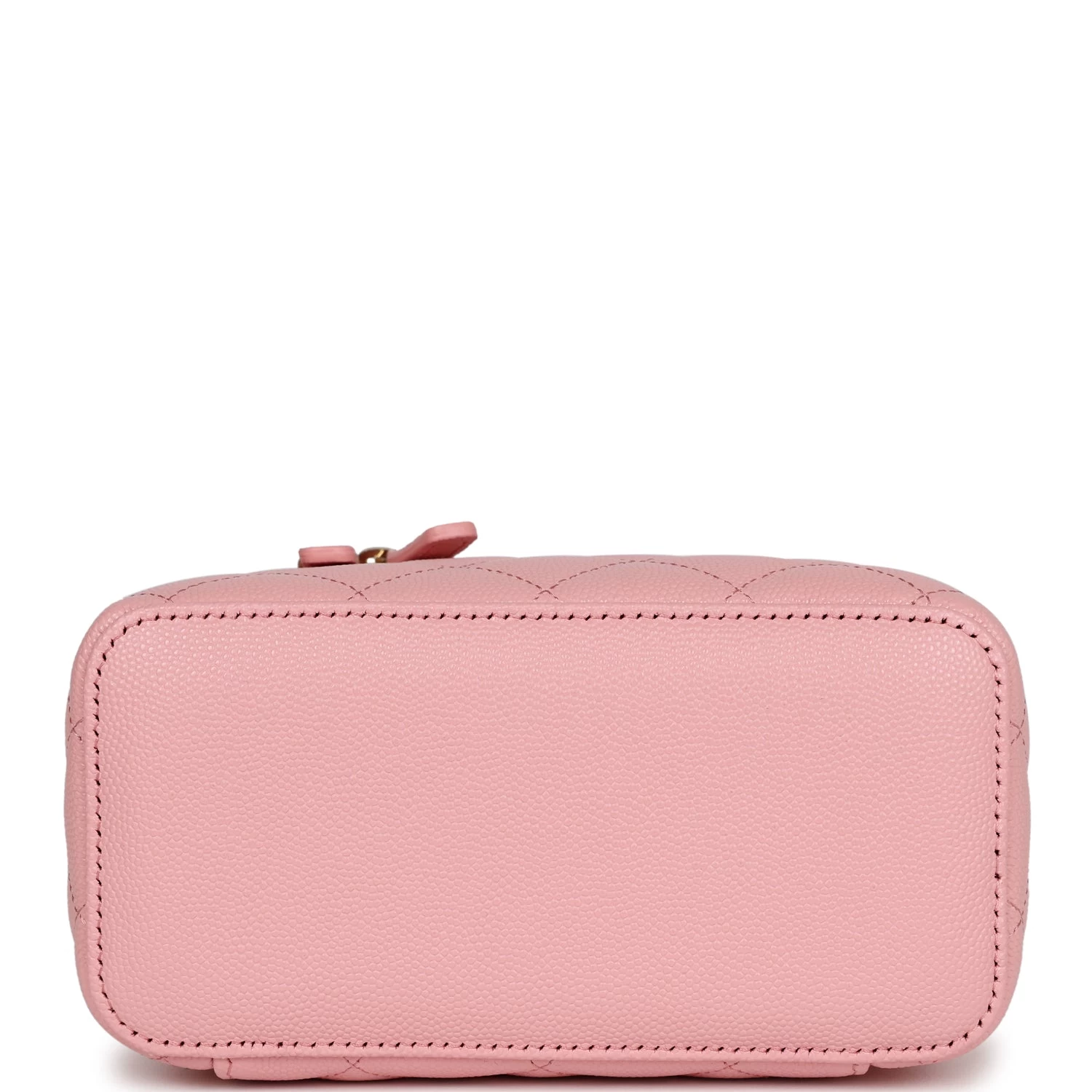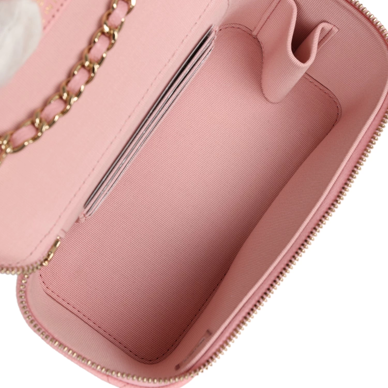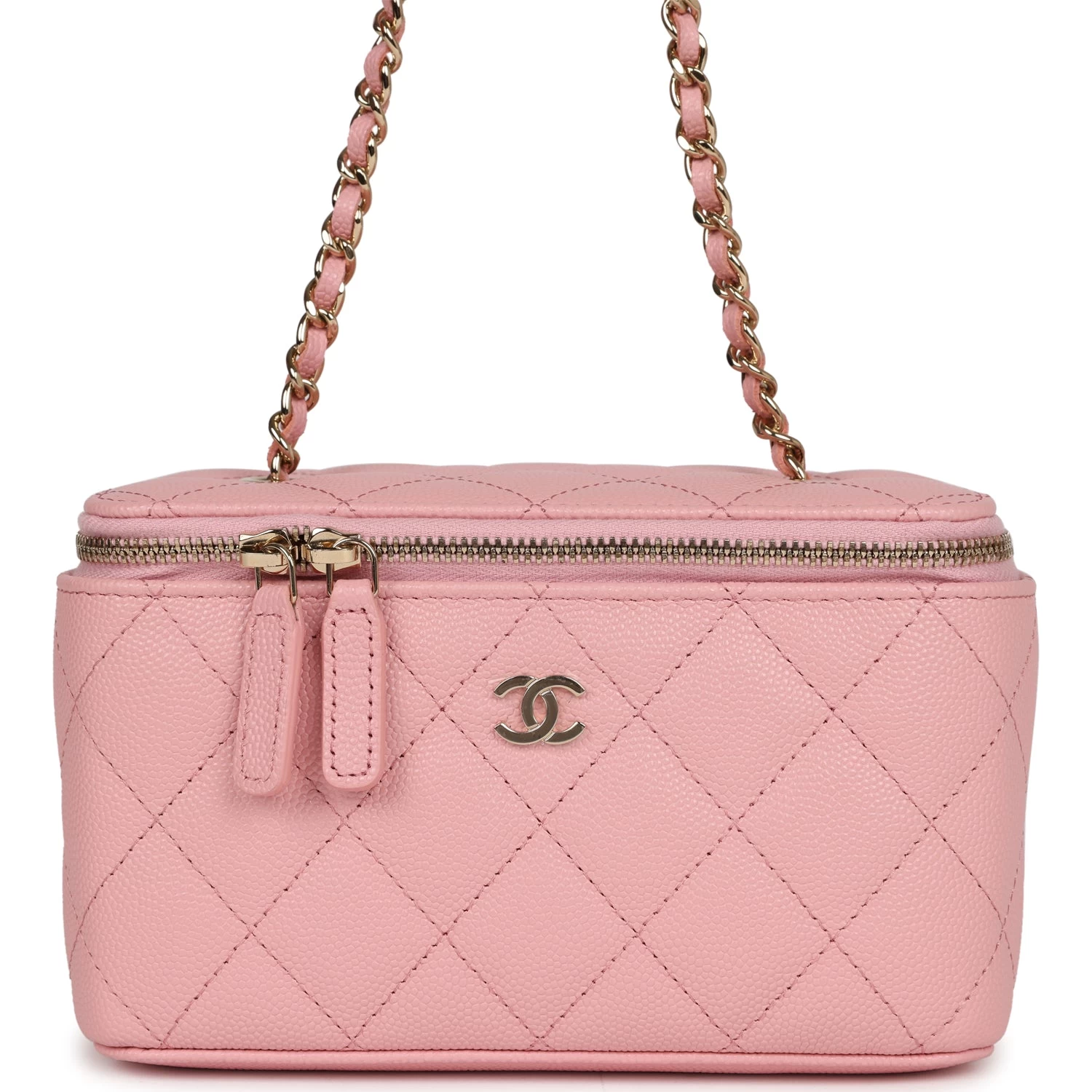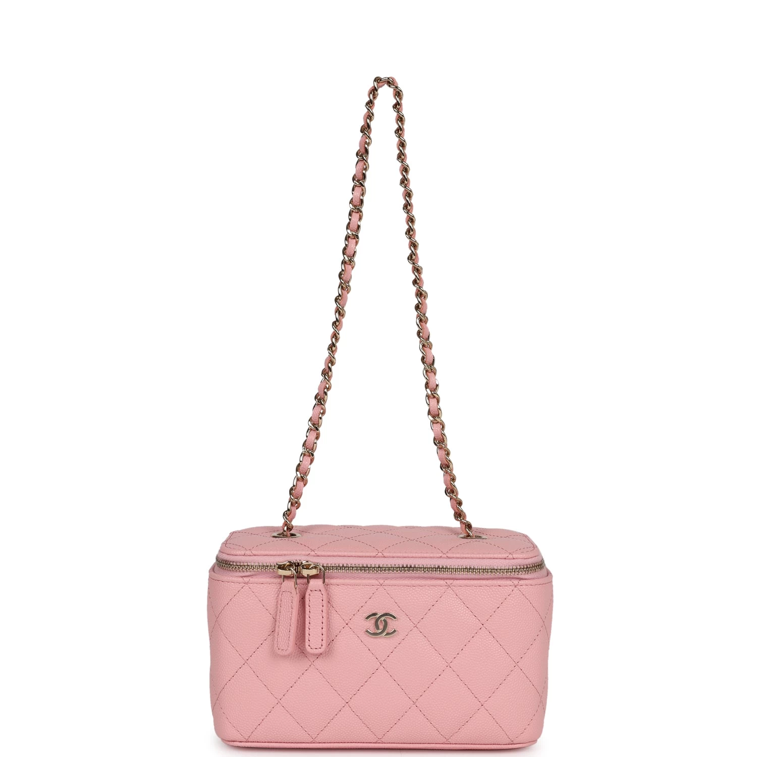 This Small Rectangular Vanity Case is in Pink Quilted Caviar leather with light gold hardware, tonal stitching, CC logo on front of vanity case, top zip around closure with leather pull, 3 interior card slots and a long crossbody/shoulder light gold interwoven with pink leather chain strap.
