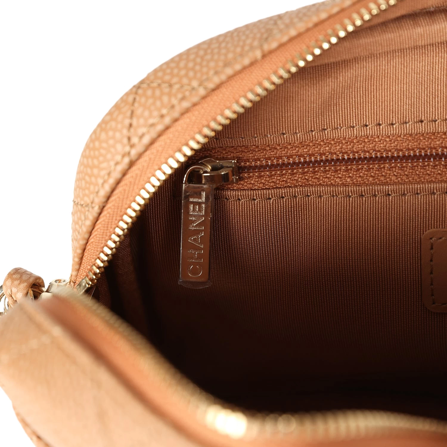 This Chanel camera case bag is of Dark Beige Matte caviar leather with Gold hardware, features tonal stitching, flat quilt, front pocket on front of camera bag with CC logo at the top center, zipper closure with zip tassel pull, has a long Gold tone crossbody/shoulder strap with interwoven Dark Beige leather.Â