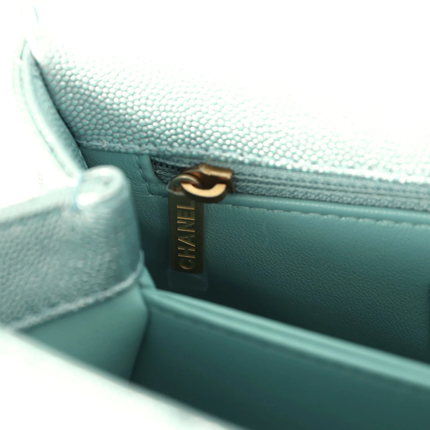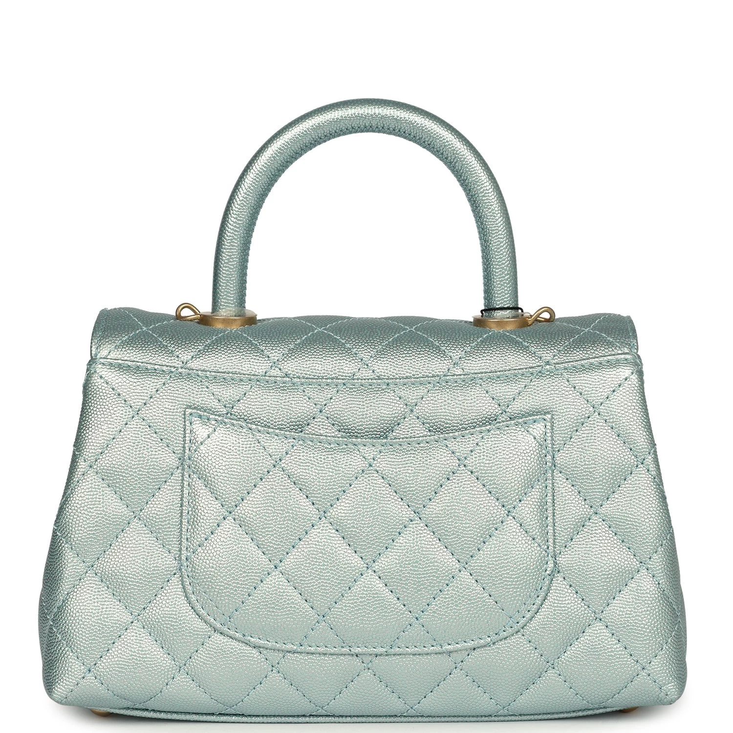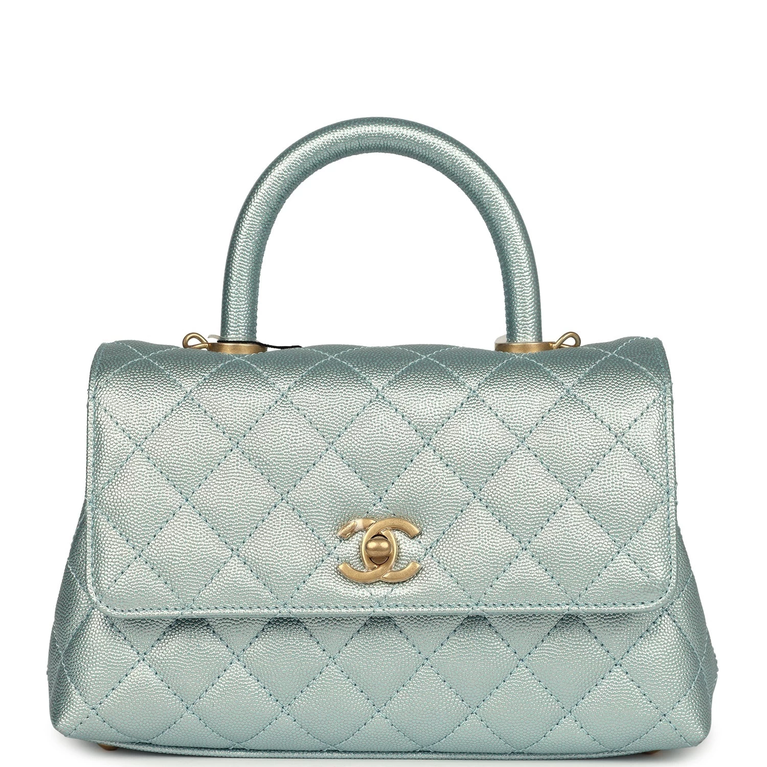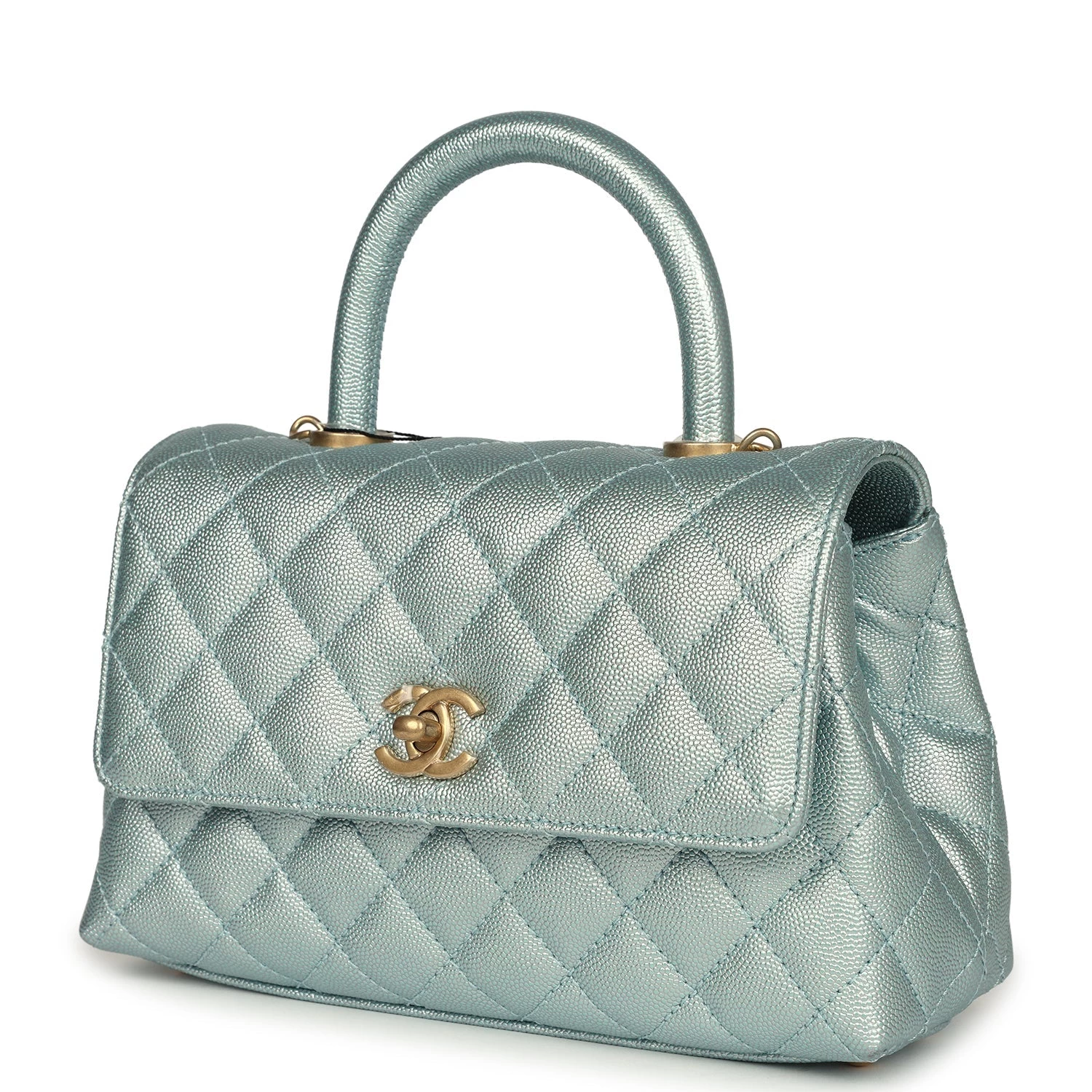 This small coco handle flap bag is of iridescent Light Blue caviar with aged gold hardware and has the signature diamond quilting in a trapezoidal shape with signature CC interlocking closure in rainbow metal, top handle, and long silver tone and light blue leather chain.