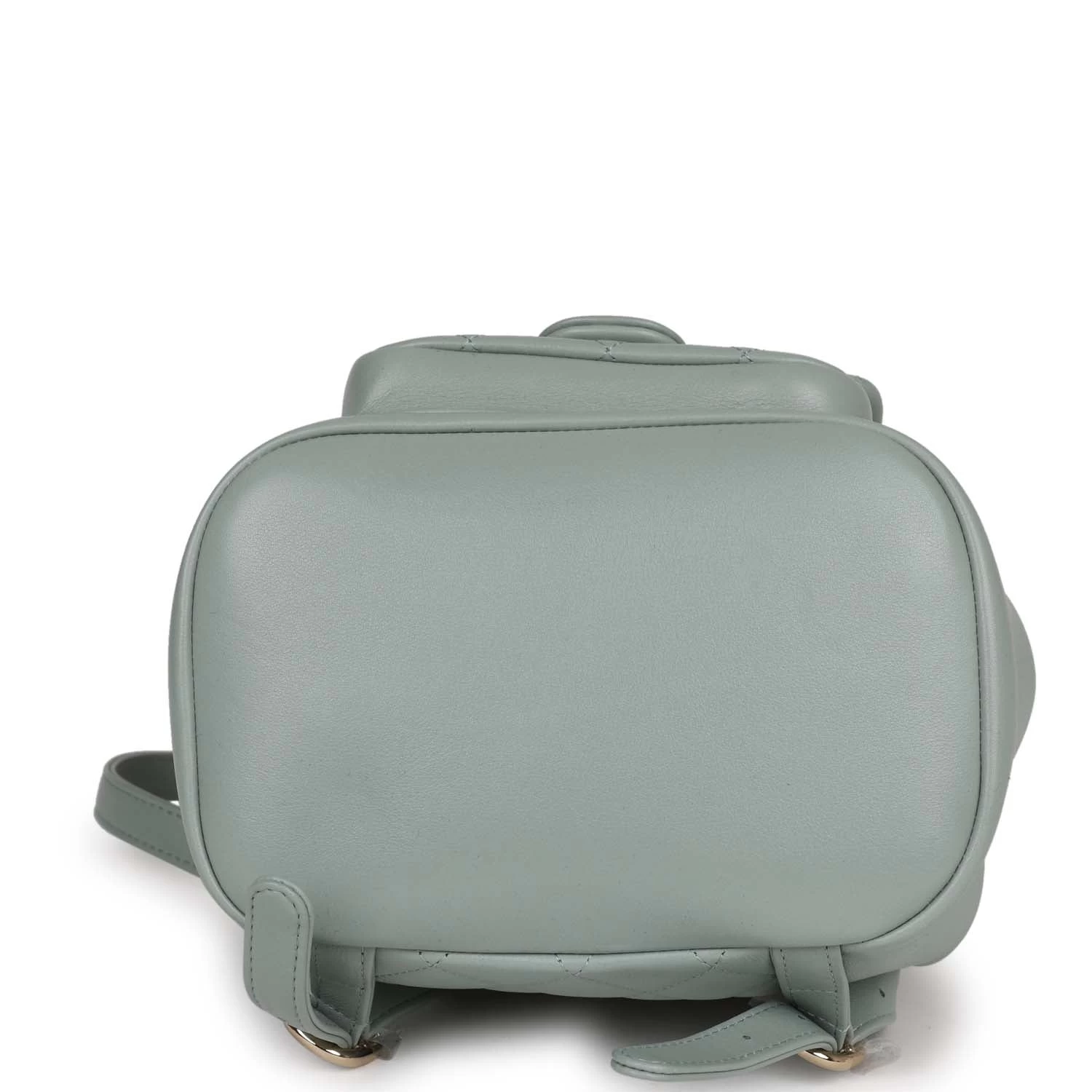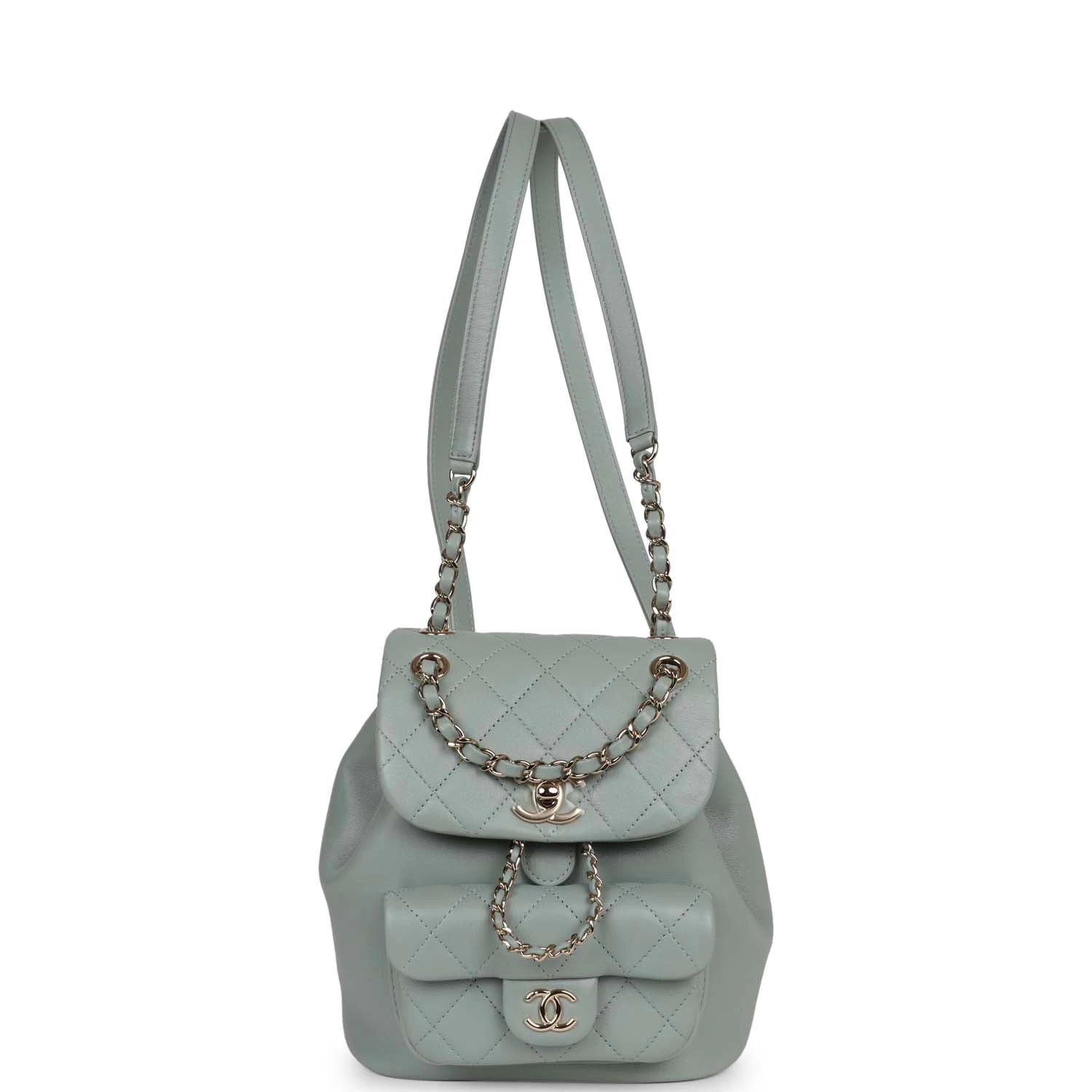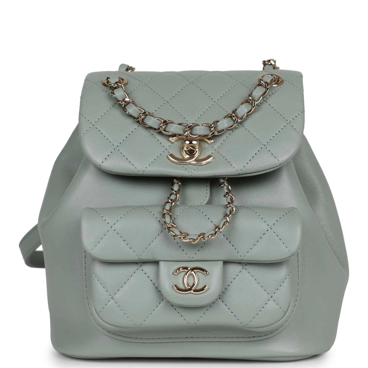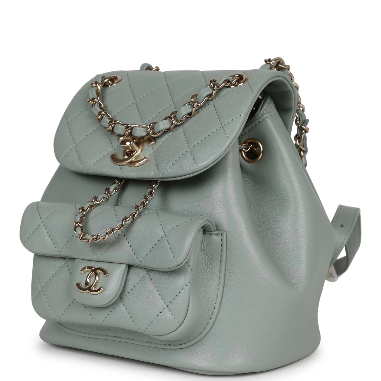 This Small Duma Backpack is in Light blue lambskin leather with light gold tone hardware and has a front flap with signature CC logo, front pocket, single light blue leather top handle and adjustable straps.