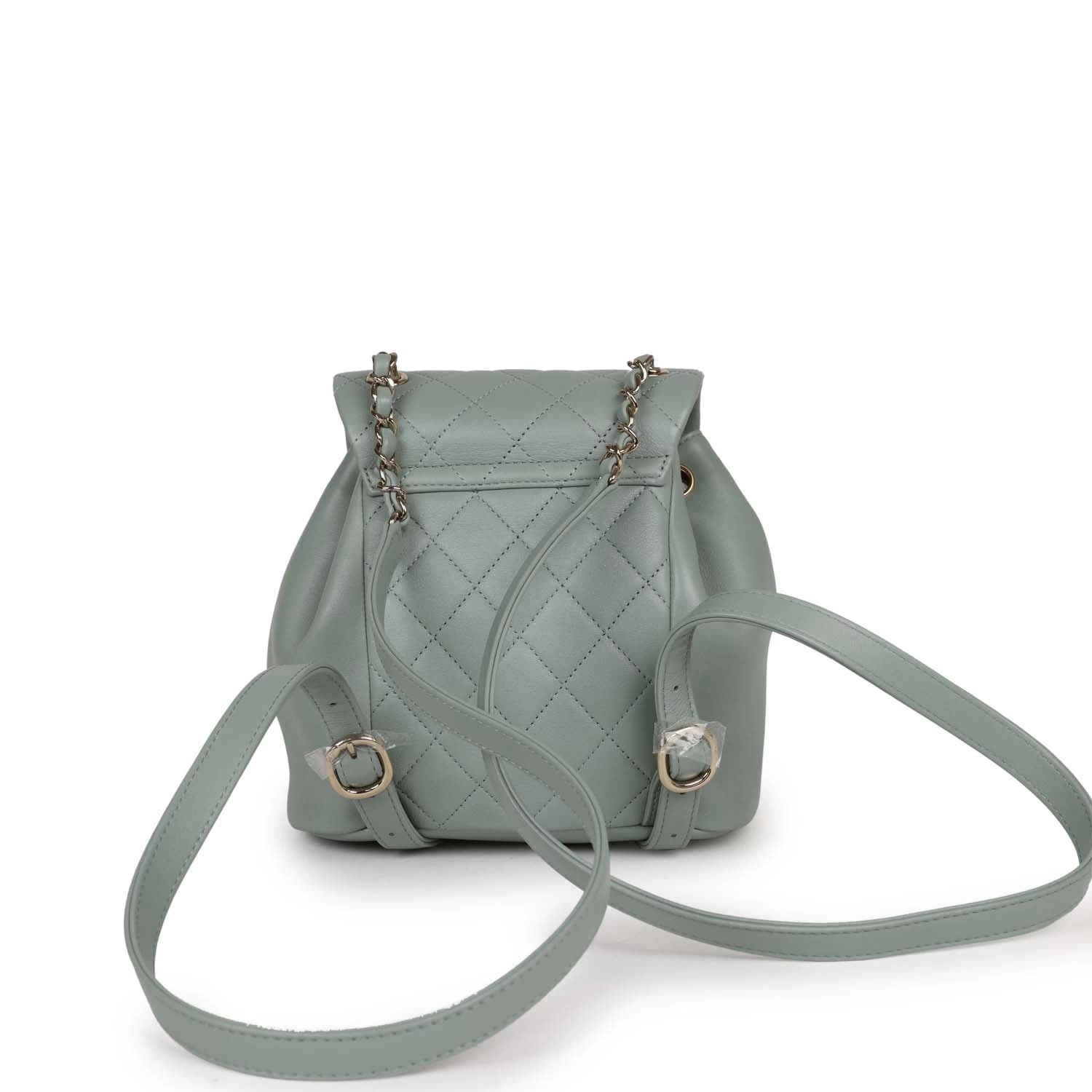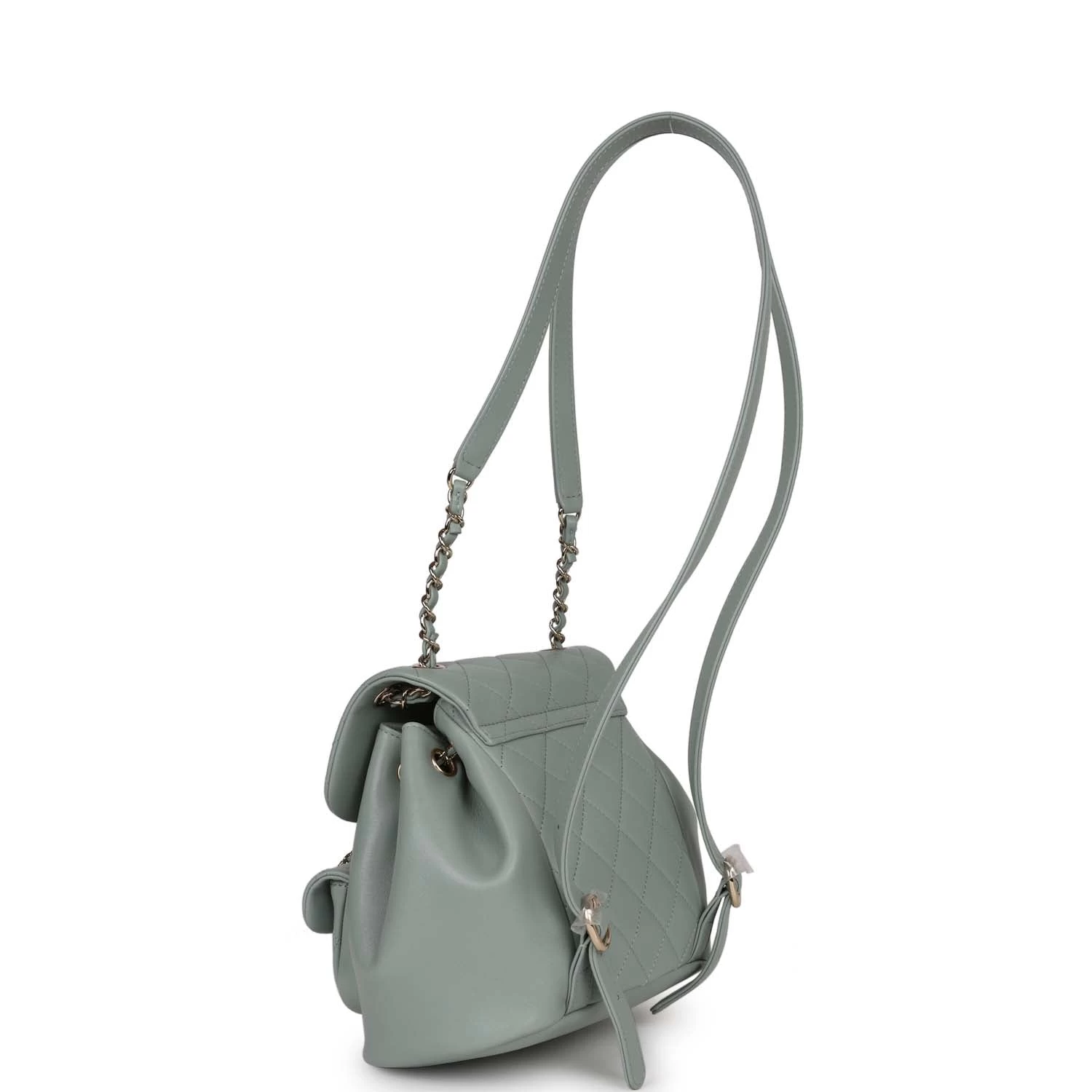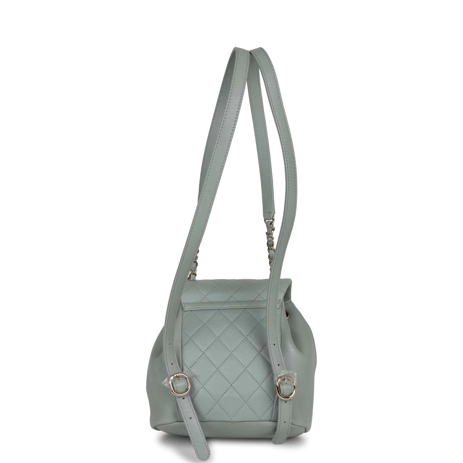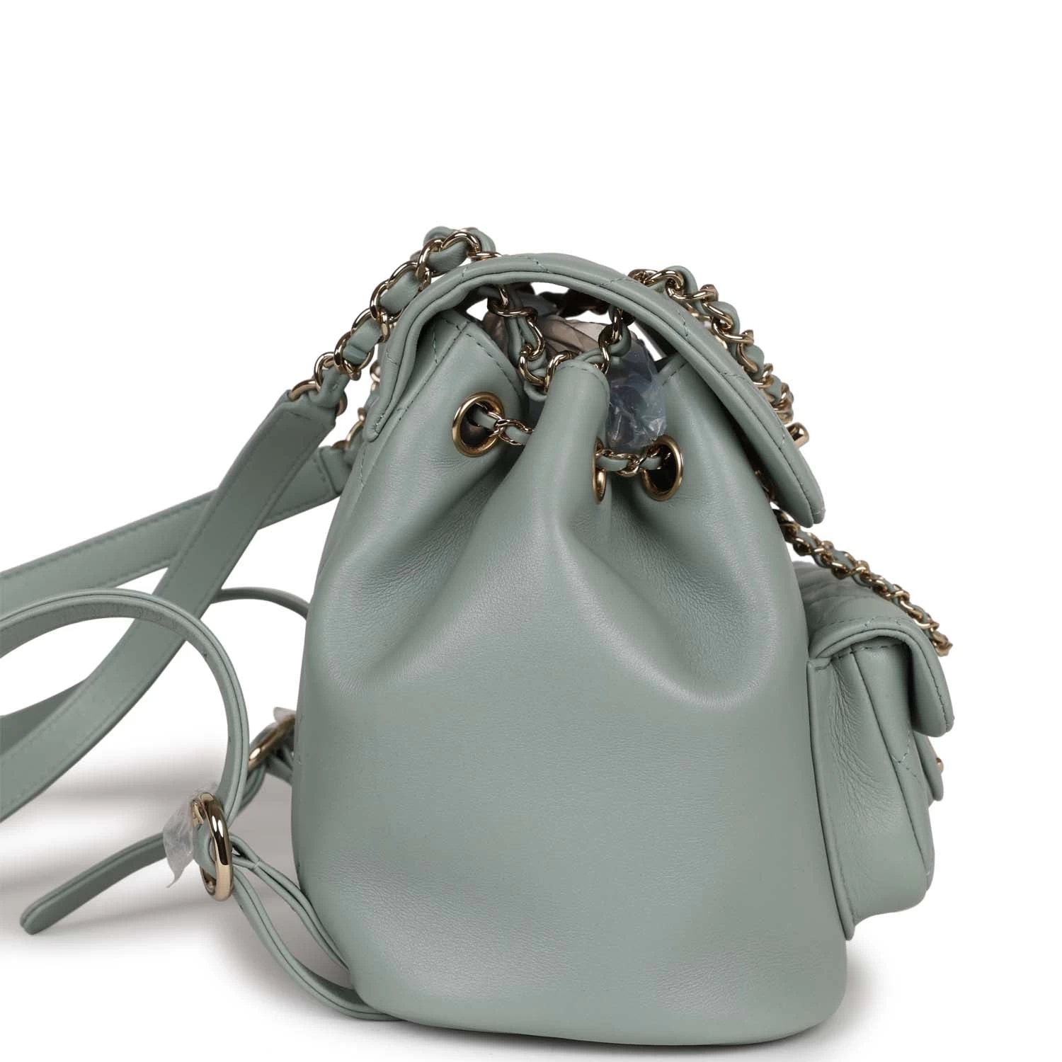 This Small Duma Backpack is in Light blue lambskin leather with light gold tone hardware and has a front flap with signature CC logo, front pocket, single light blue leather top handle and adjustable straps.