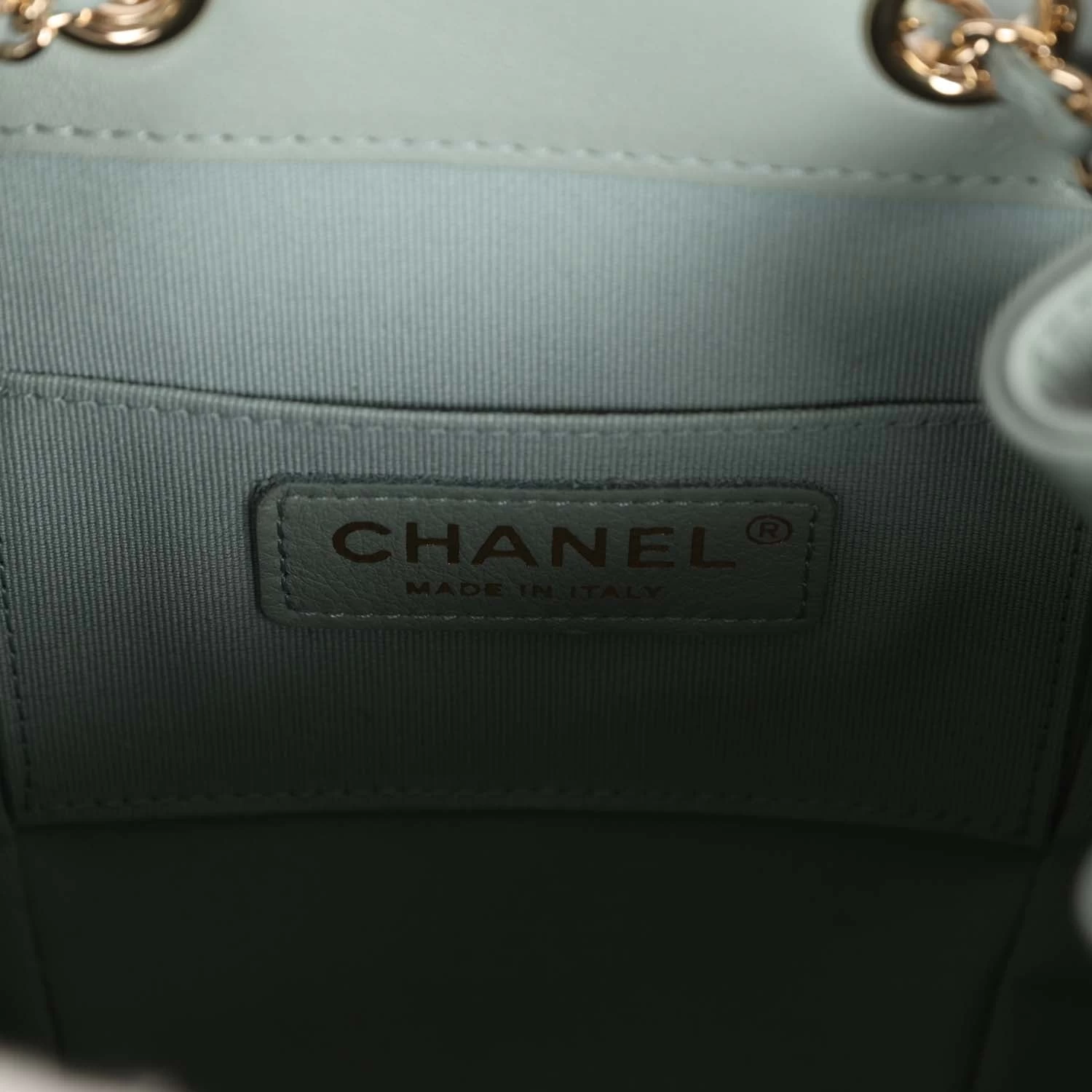 The interior is lined in light blue fabric and features a zipper pocket with Chanel pull.