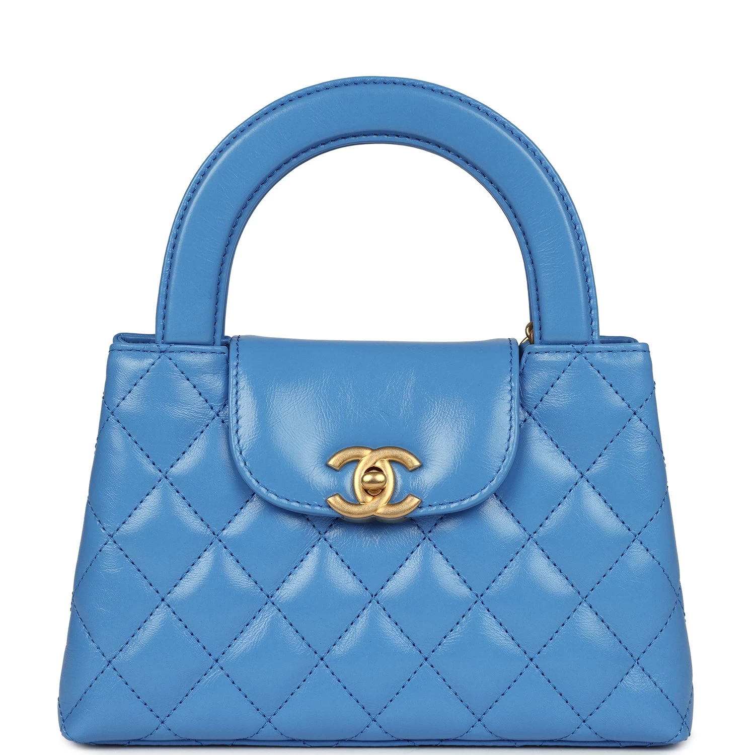 This Small Kelly is in blue shiny aged calfskin with brushed gold hardware, tonal stitching, two flat back top handles and an interwoven brushed gold with blue leather shoulder strap, and CC turnlock closure.