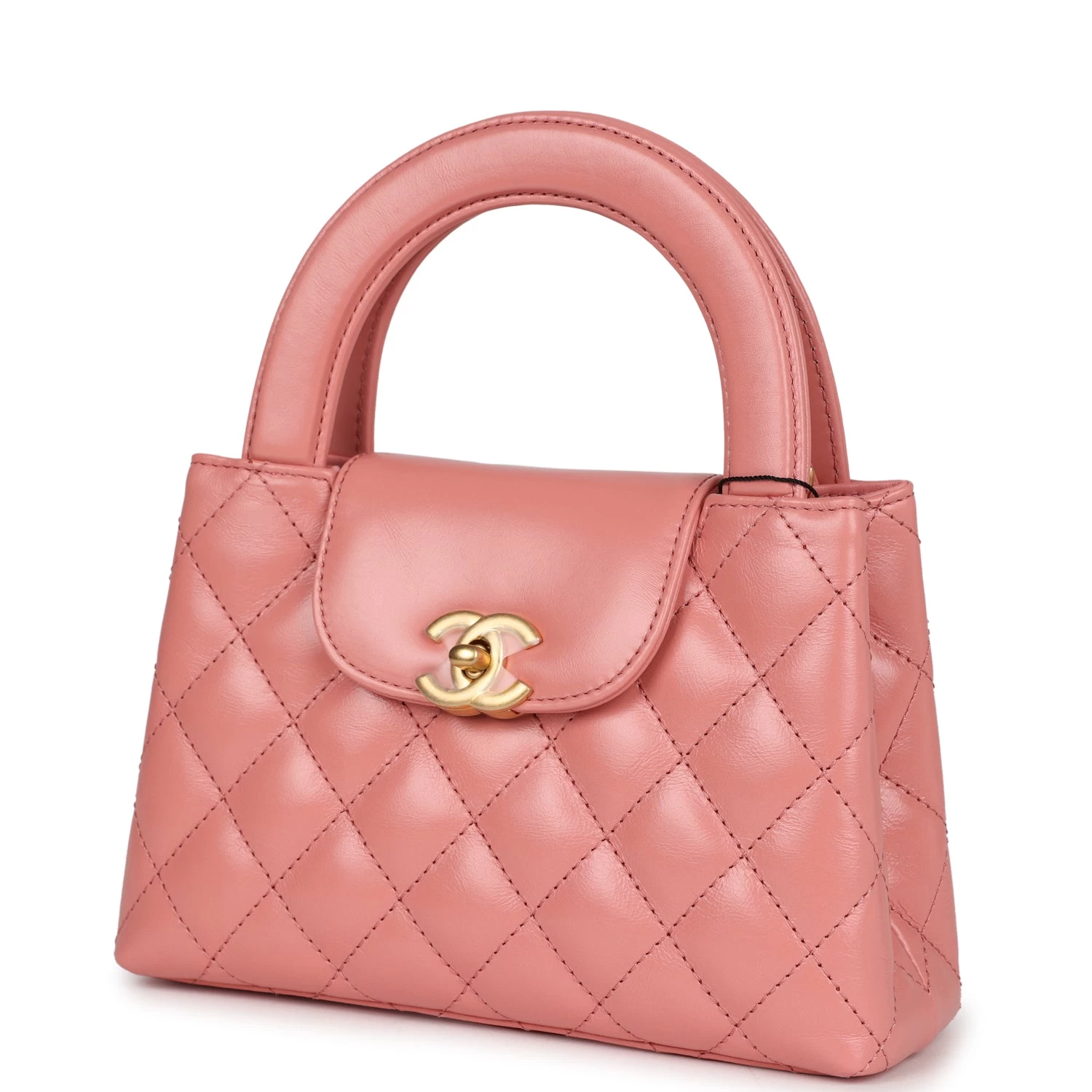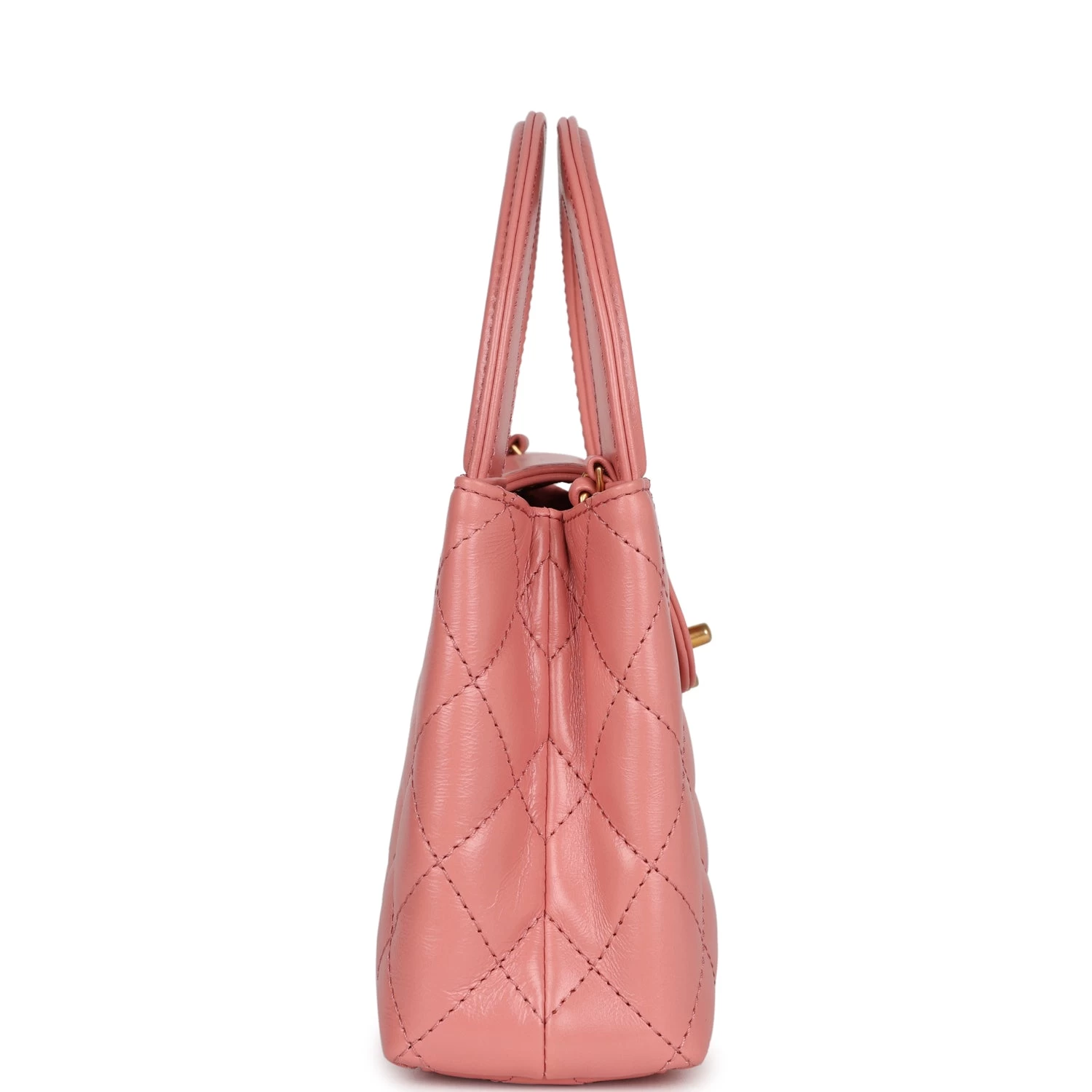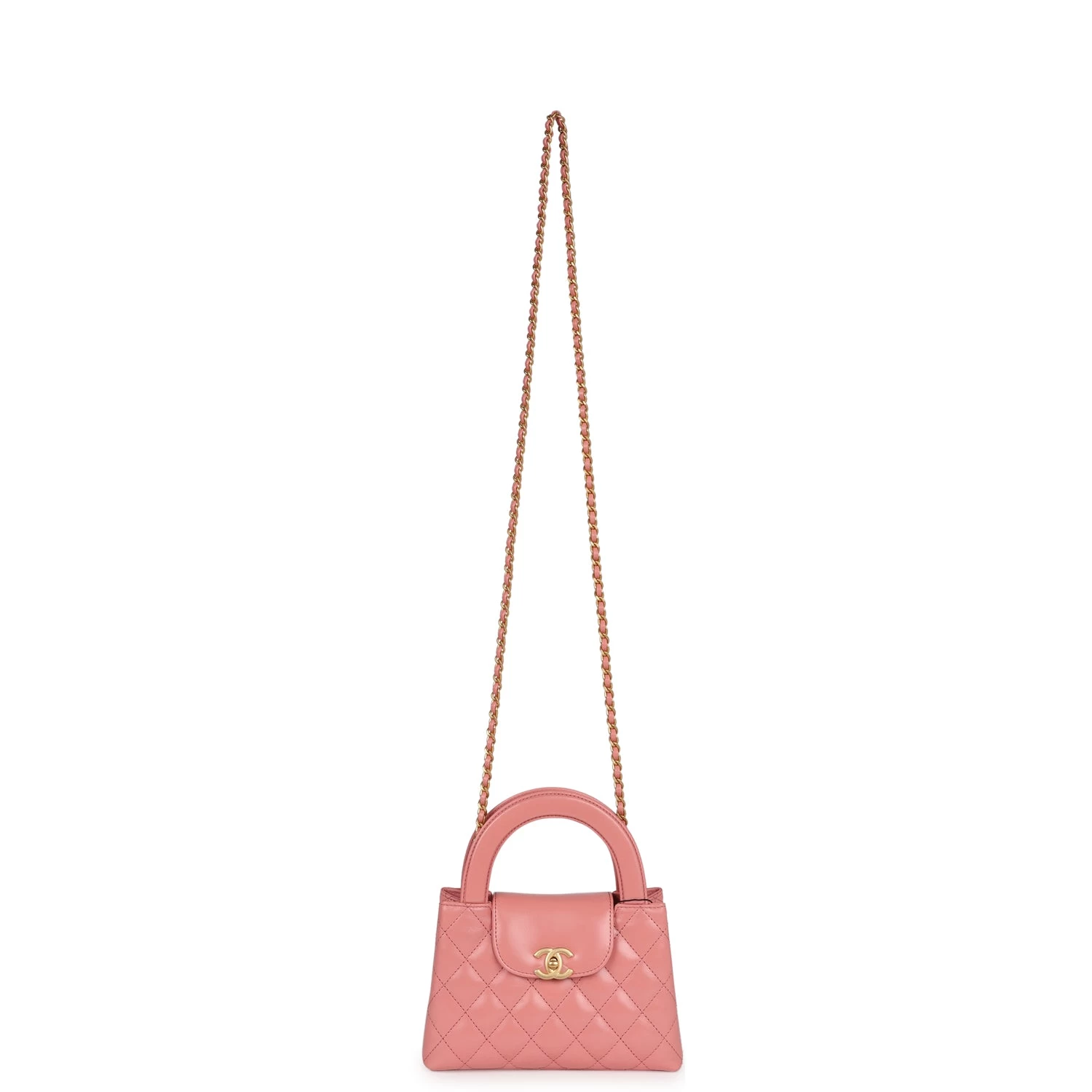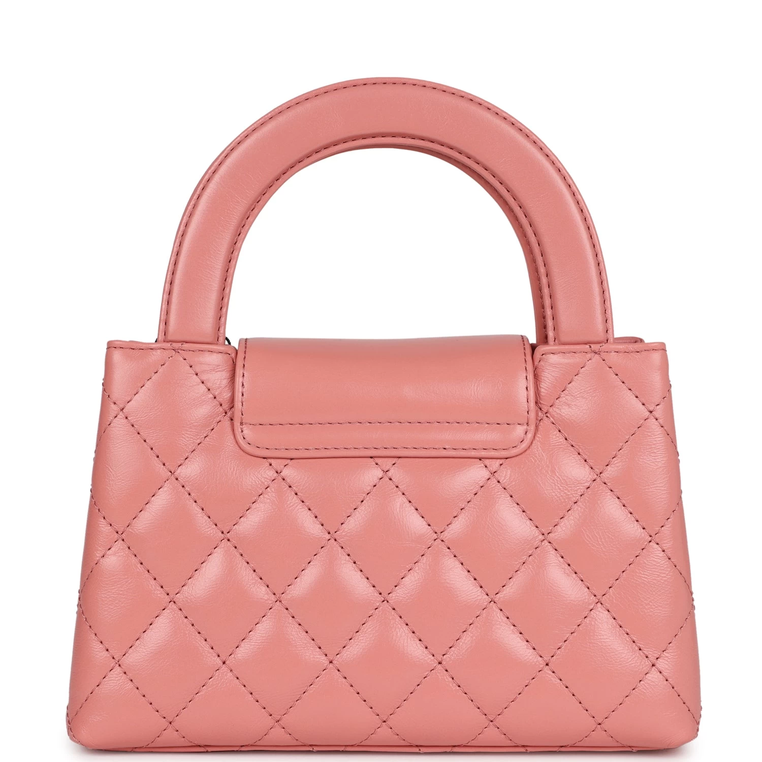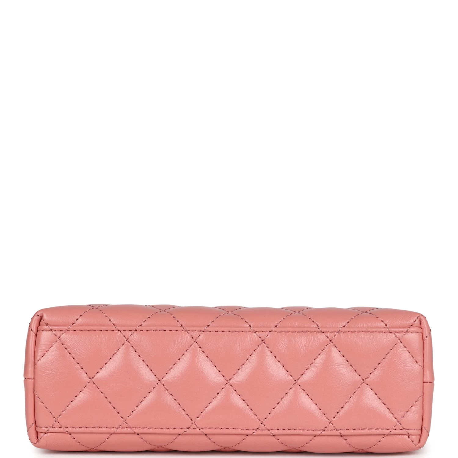 This Small Kelly is in Pink Shiny Aged Calfskin with Brushed Gold Hardware, tonal stitching, two flat back top handles, interwoven brushed gold and pink leather shoulder strap, and the signature CC turnlock closure.