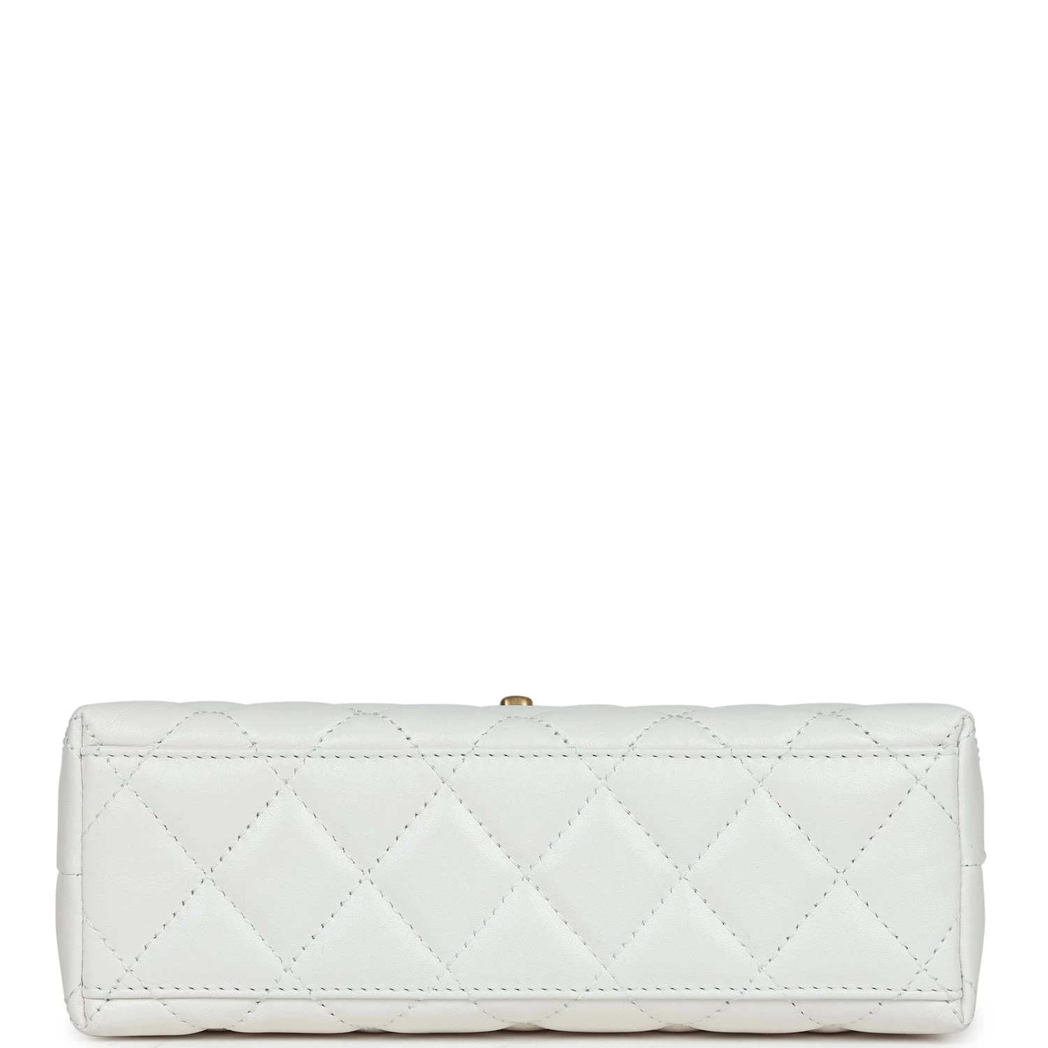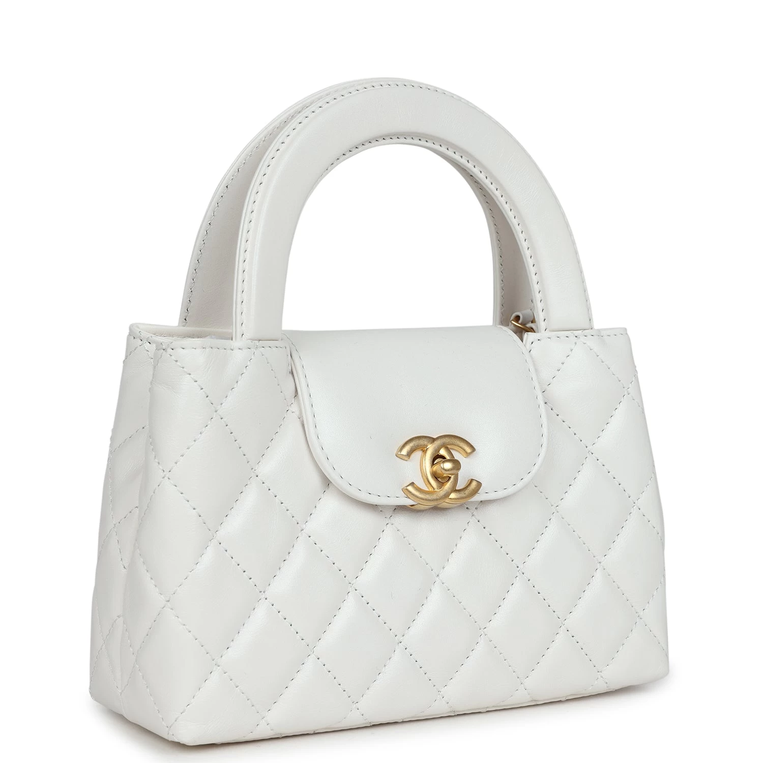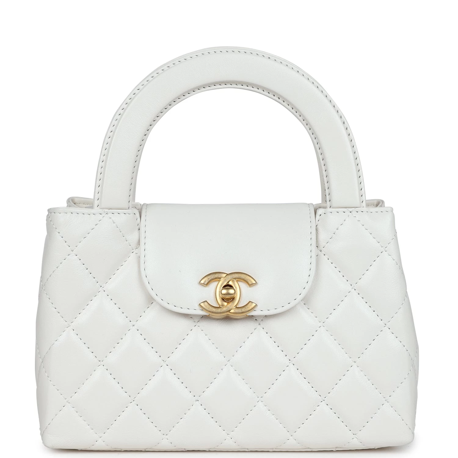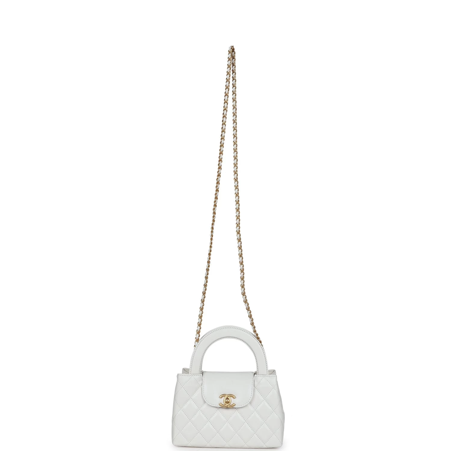 This Small Kelly is in white shiny aged calfskin with brushed gold hardware, tonal stitching, two flat back top handles, interwoven brushed gold and white leather shoulder strap, and the signature CC turnlock closure.