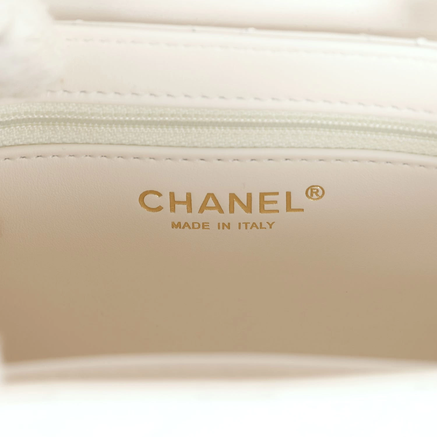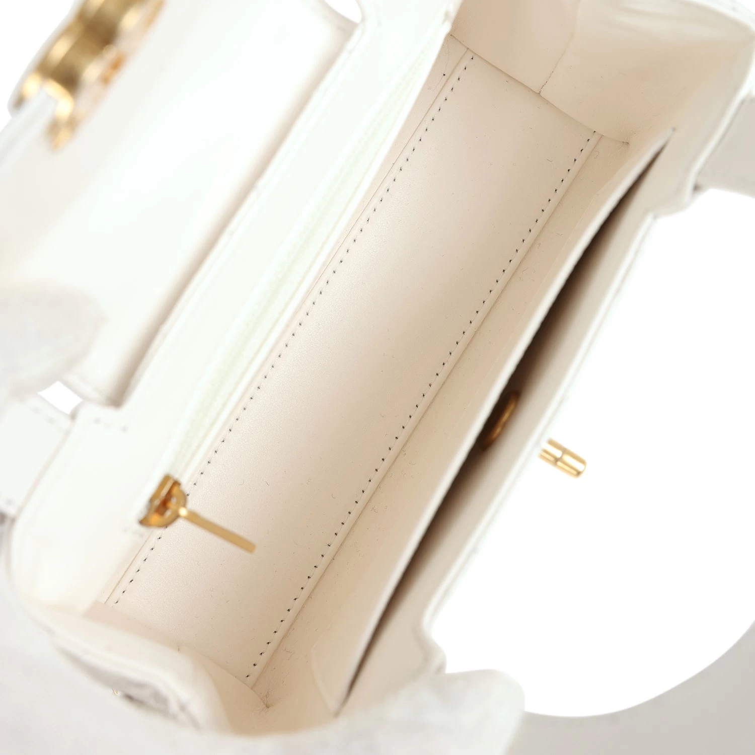 The interior is lined with white leather and has one zipper and one slip pocket.