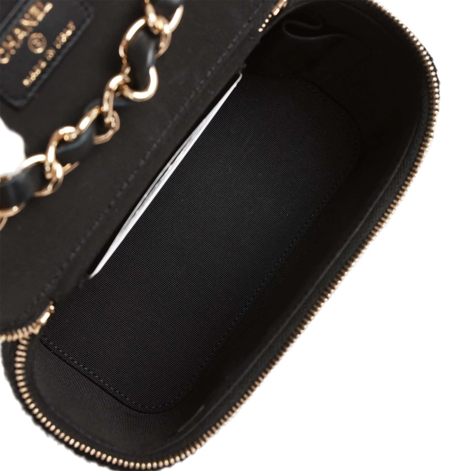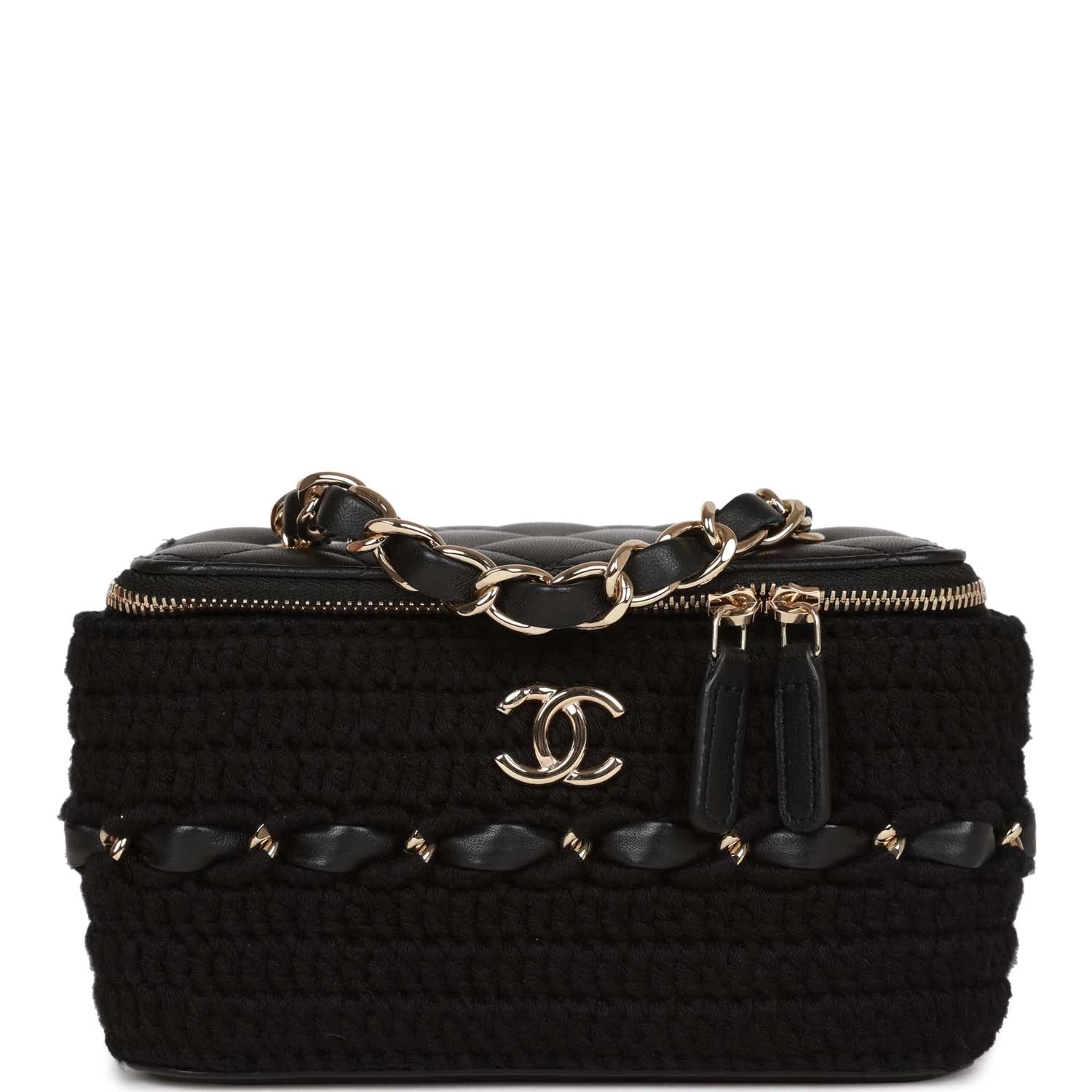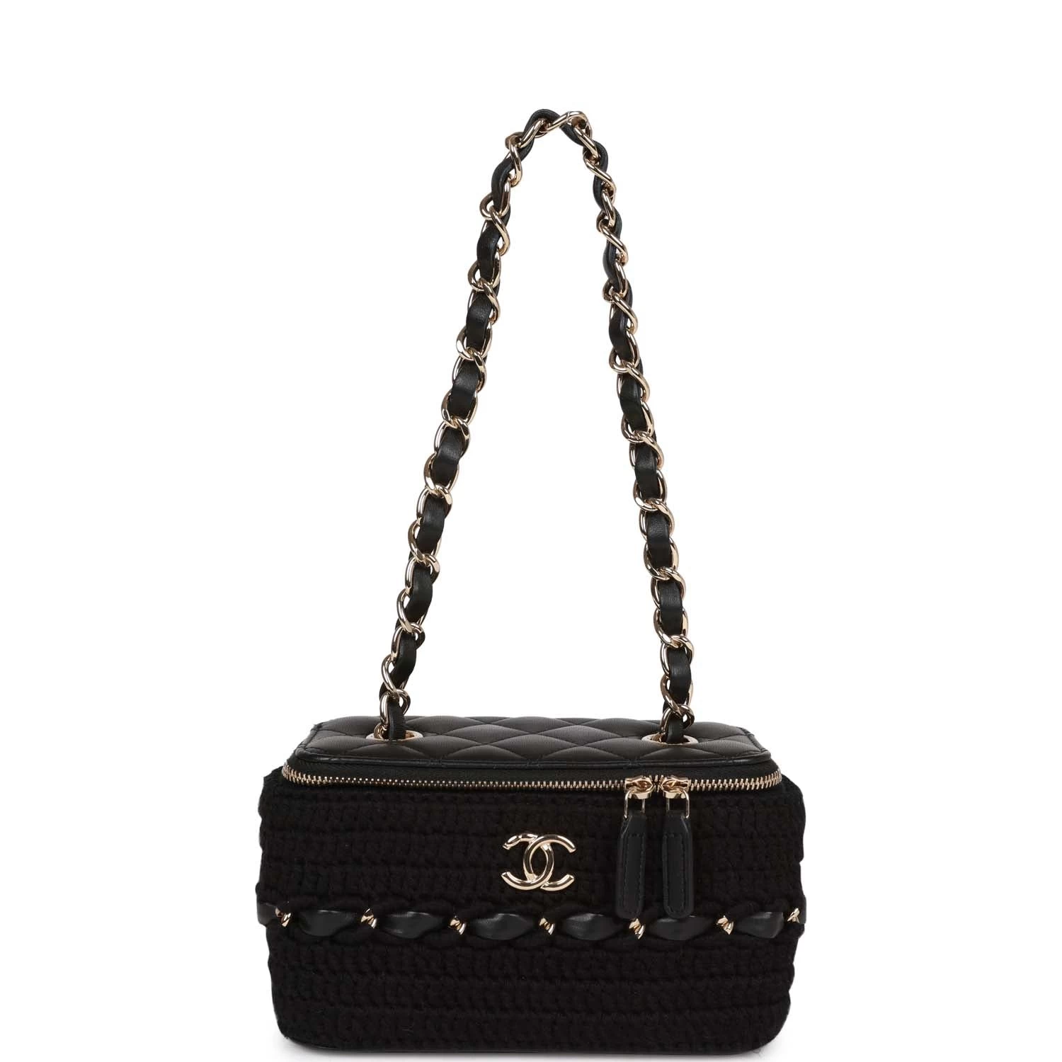 This Small Vanity Case is in Black crochet fabric and lambskin with light gold hardware, a signature CC, a double zip around closure, and a long interwoven gold tone chain link and black leather shoulder/crossbody strap.