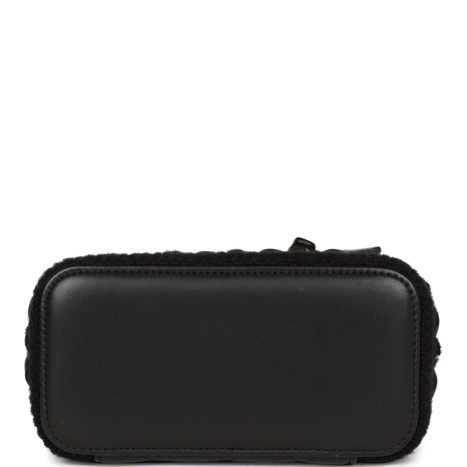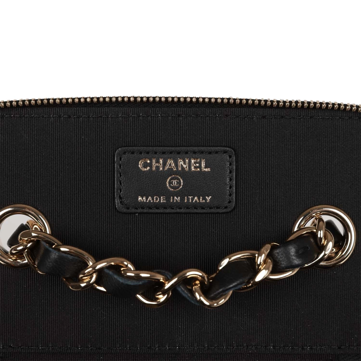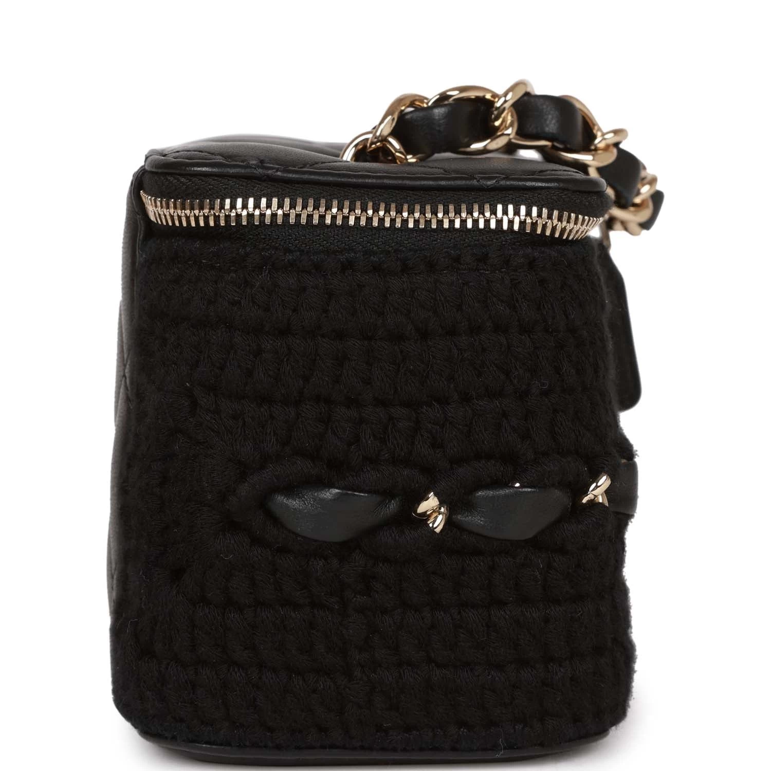 This Small Vanity Case is in Black crochet fabric and lambskin with light gold hardware, a signature CC, a double zip around closure, and a long interwoven gold tone chain link and black leather shoulder/crossbody strap.