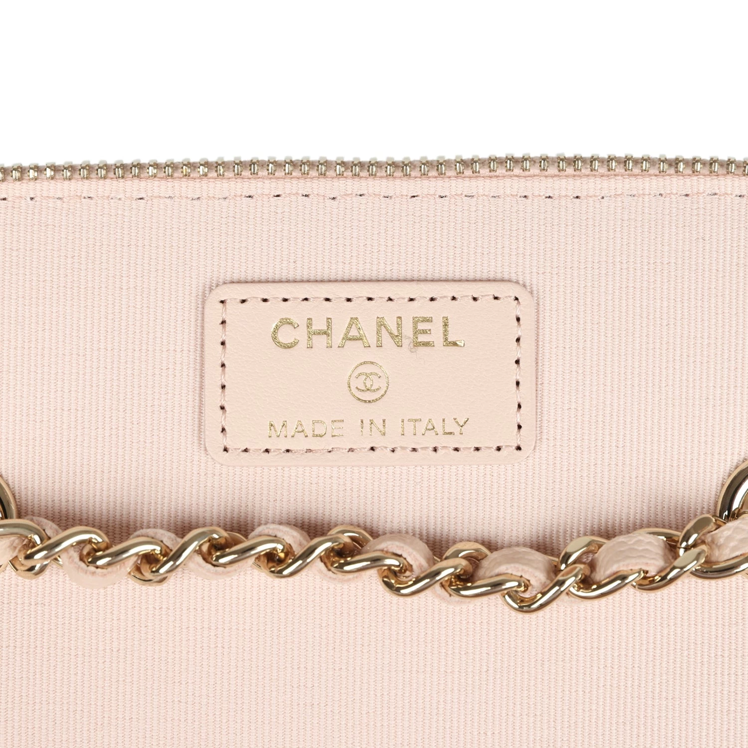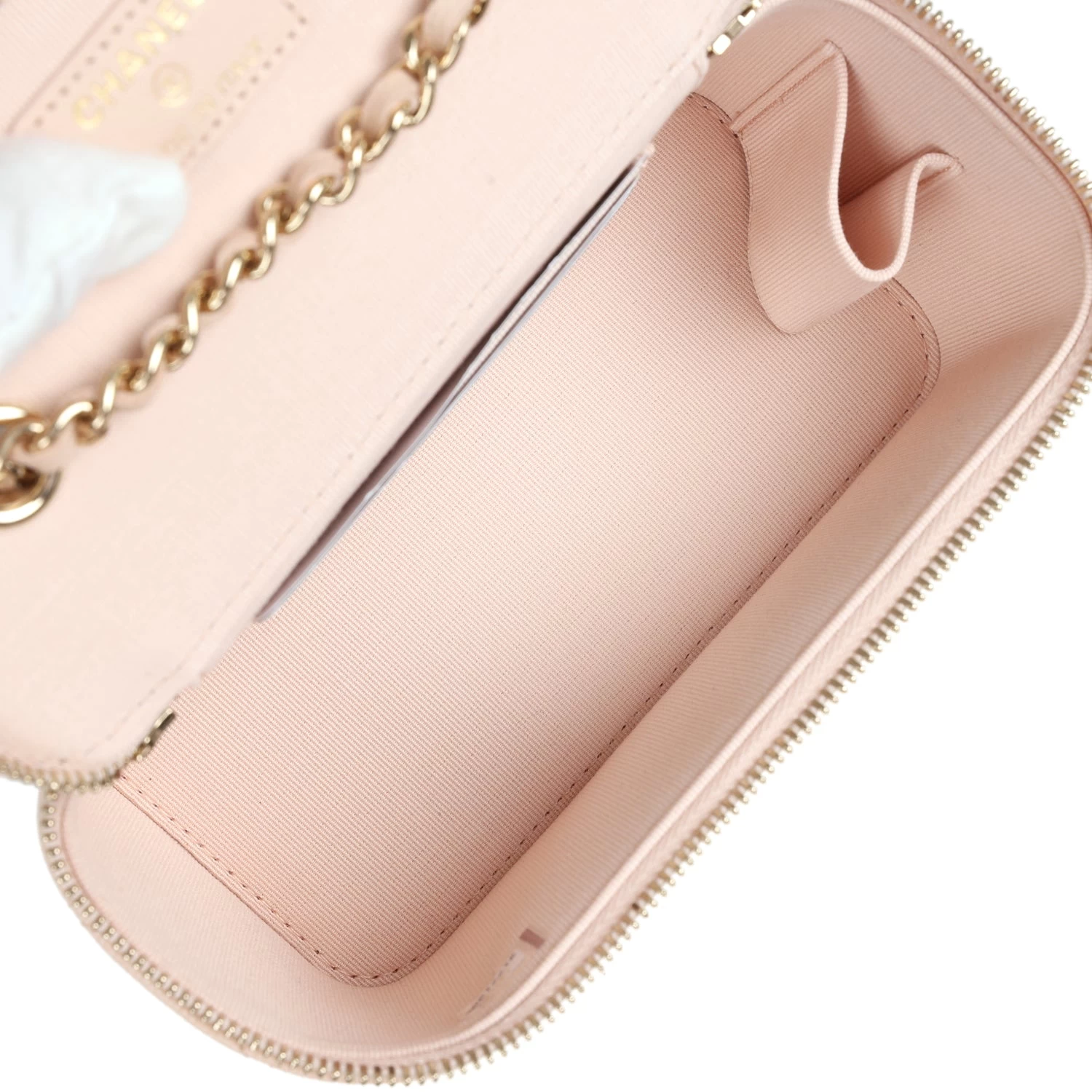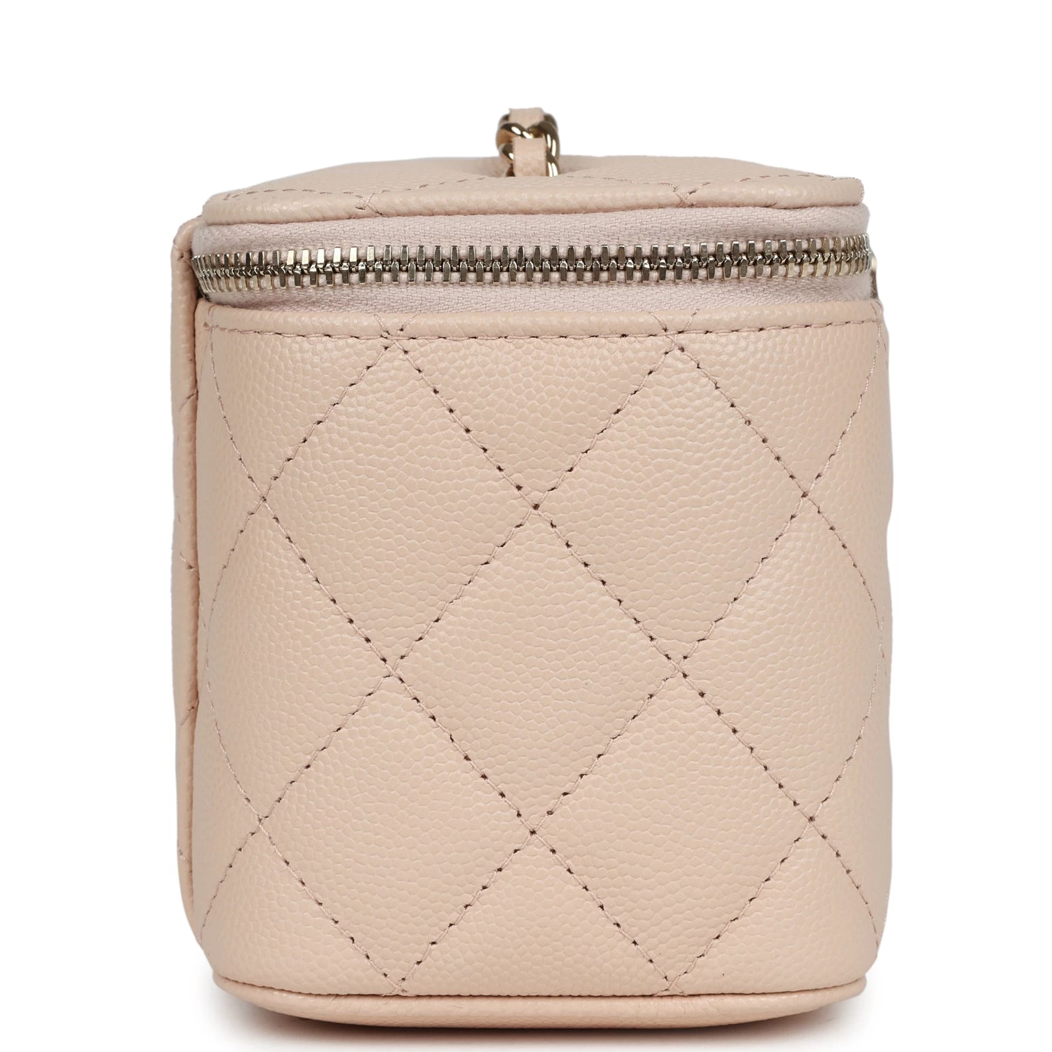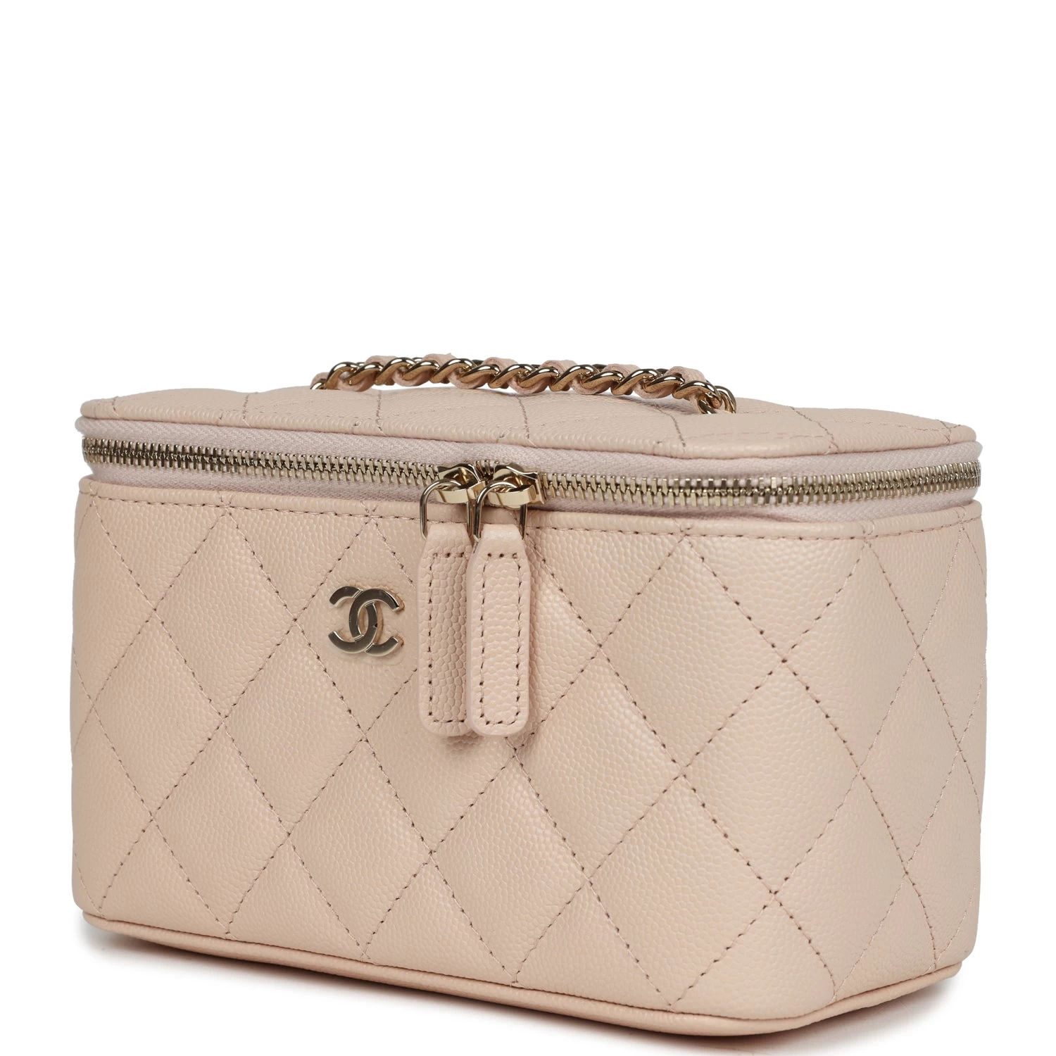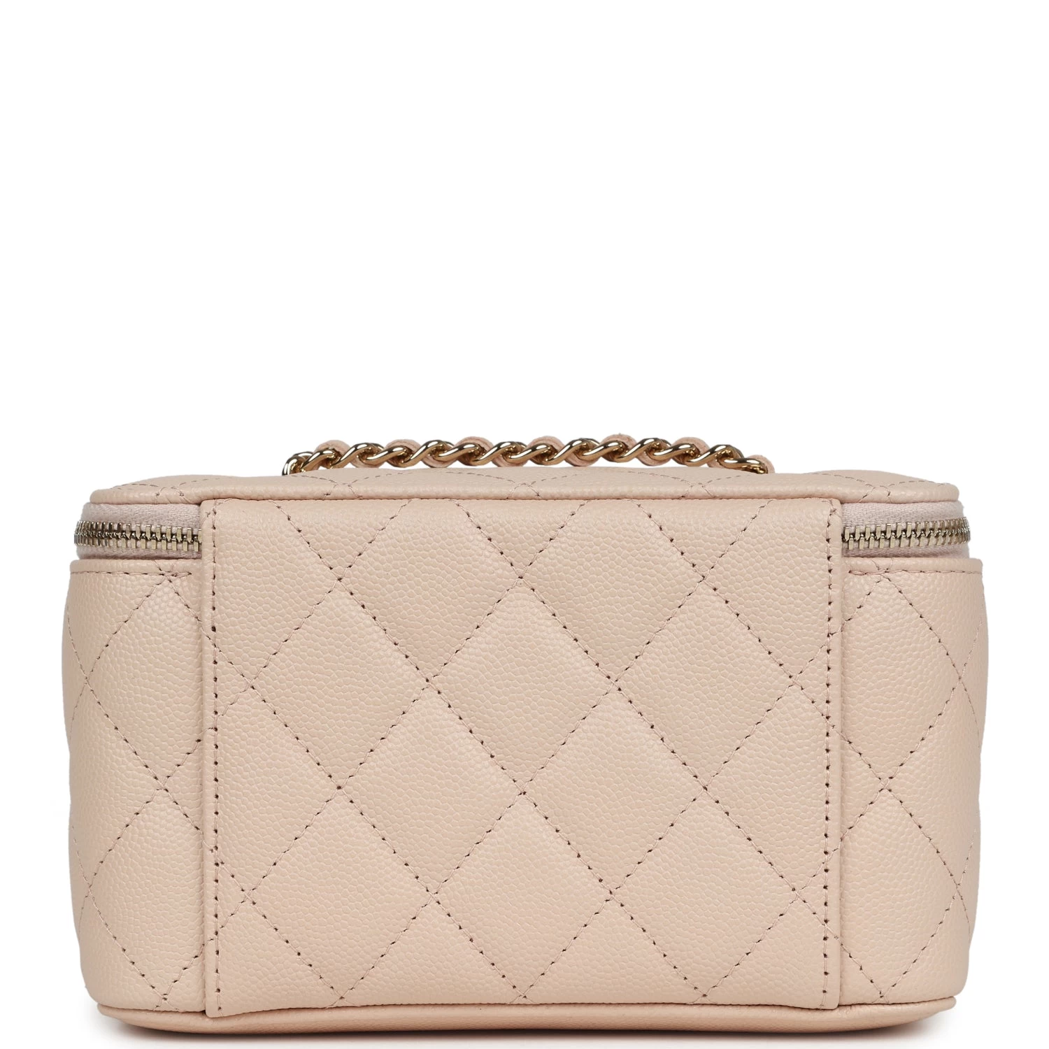 This small rectangular classic vanity case is in Light Beige quilted caviar leather with Light Gold hardware, tonal stitching, CC logo on front, top zip around closure with leather pull and an interwoven Light Gold and Light Beige leather crossbody/shoulder chain strap.Â