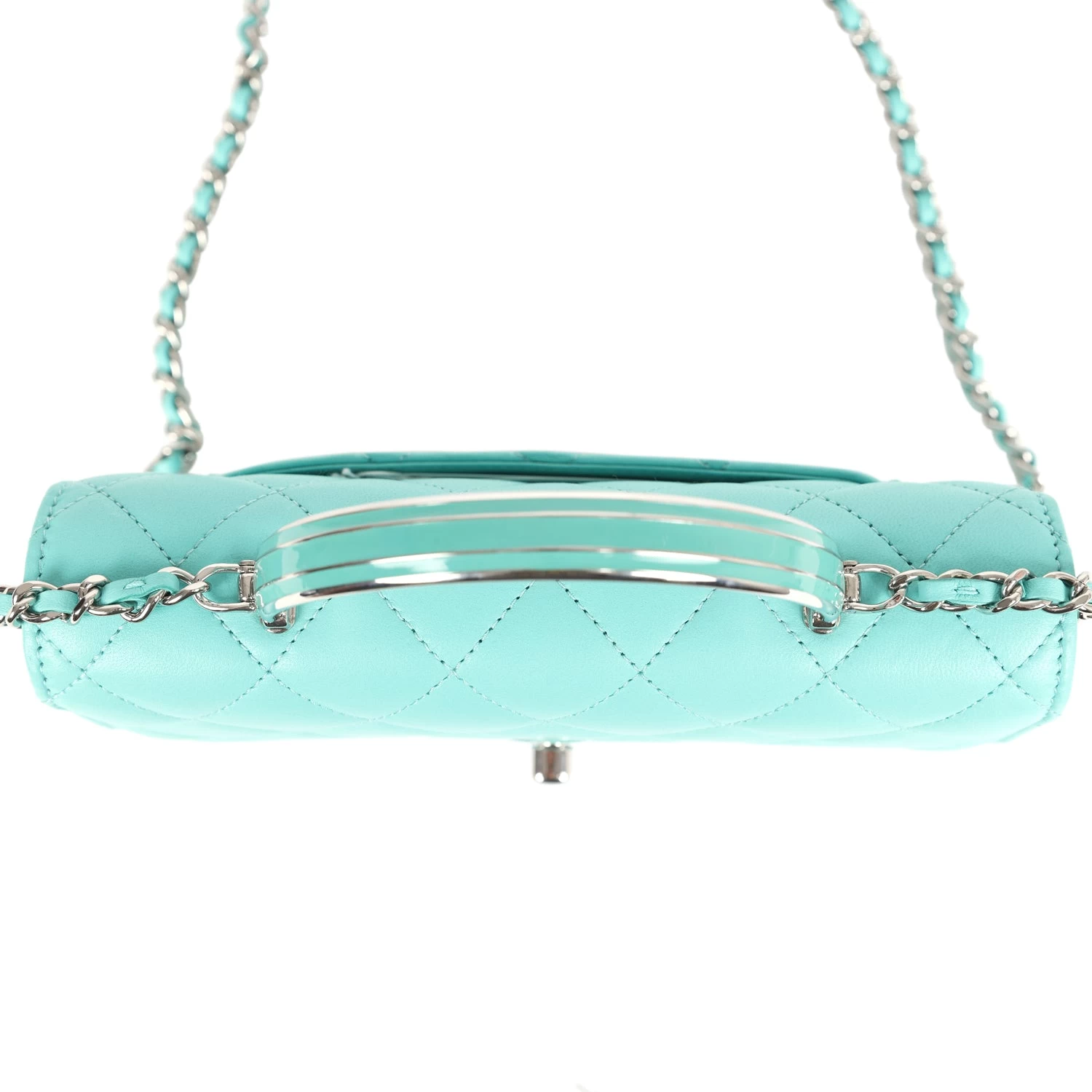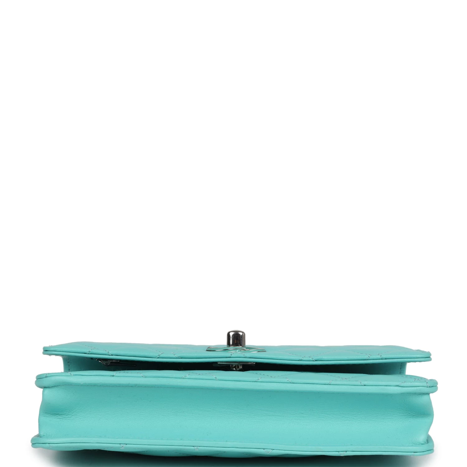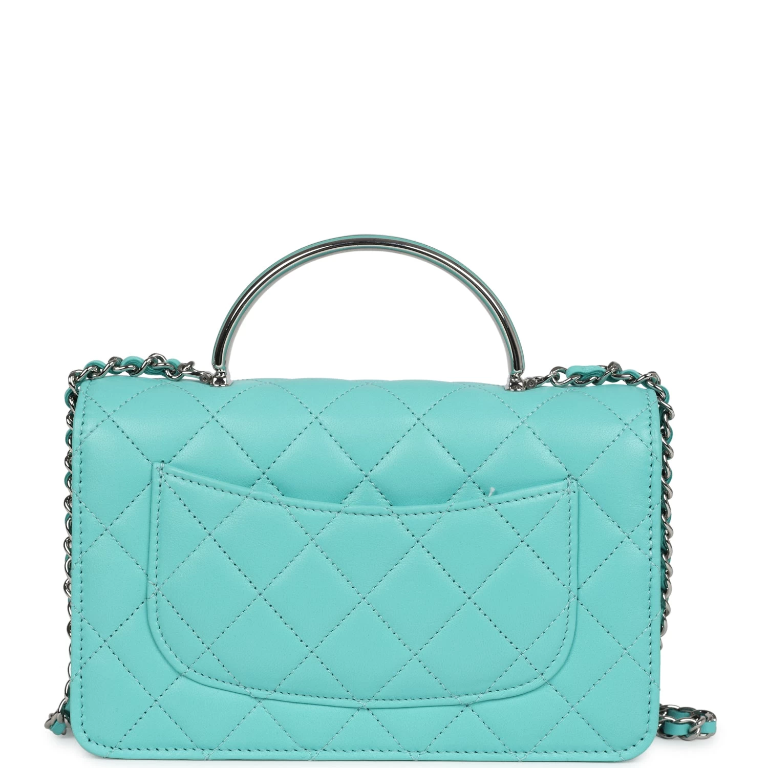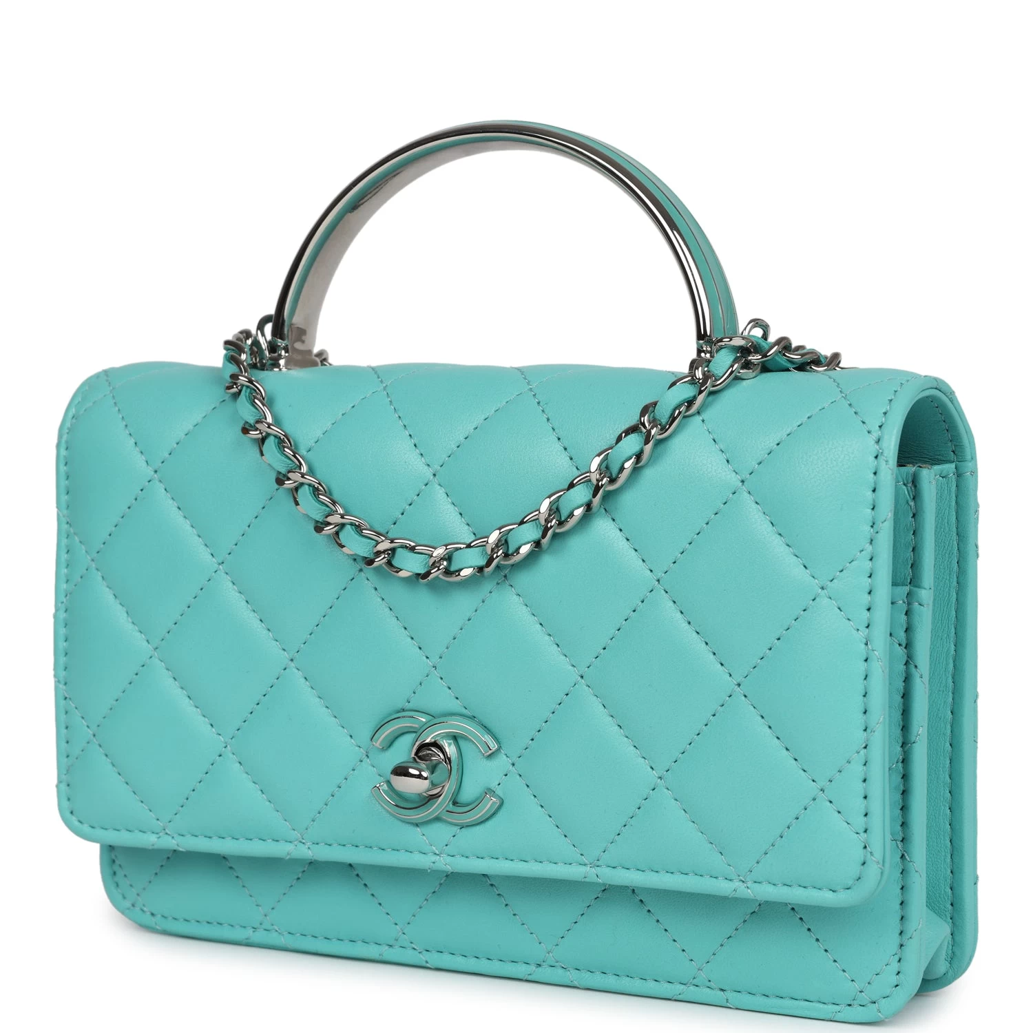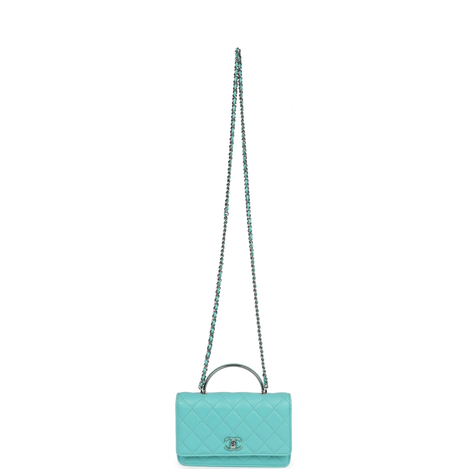 This classic top handle wallet on chain is in turquoise lambskin with a mixture of silver and enamel hardware, features tonal stitching, front CC silver and enamel turnlock closure, signature half moon exterior back pocket, and a silver tone chain-link crossbody/shoulder strap and a single silver and turquoise enamel top handle.
