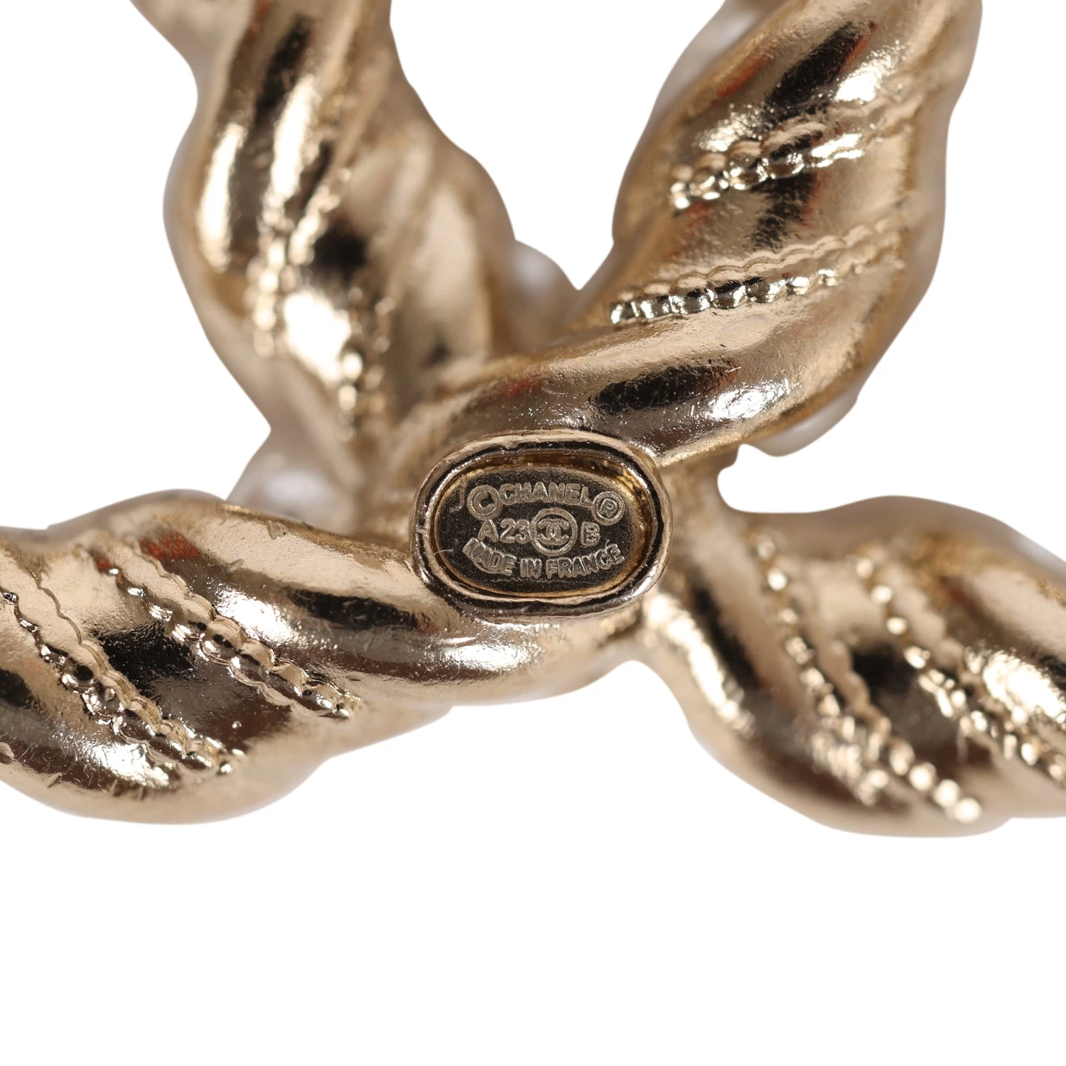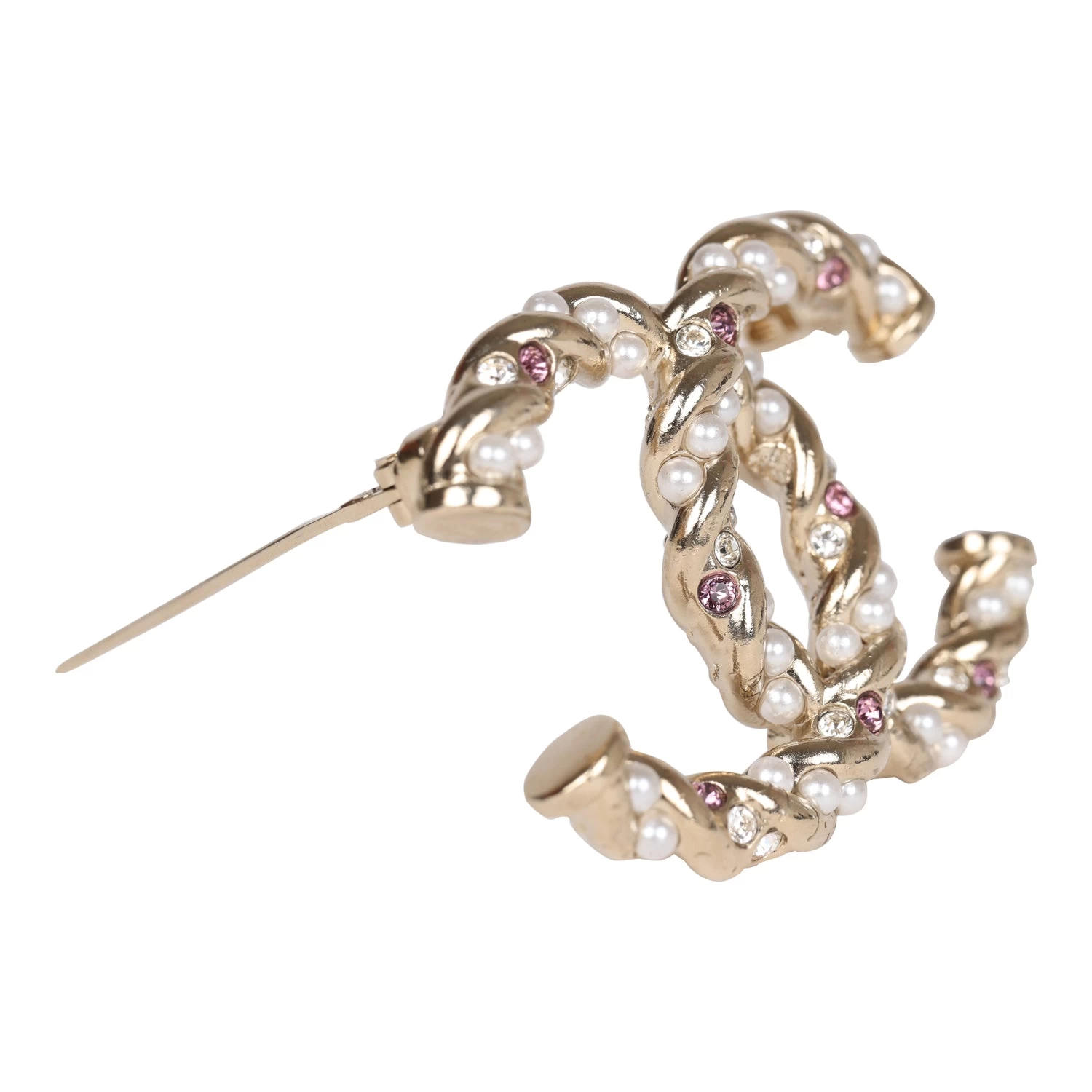 This Chanel Brooch is in Light Pink Crystal and Faux Pearl, features a twisted CC design, off white resin faux pearls, and light pink crystals with pin back closure.