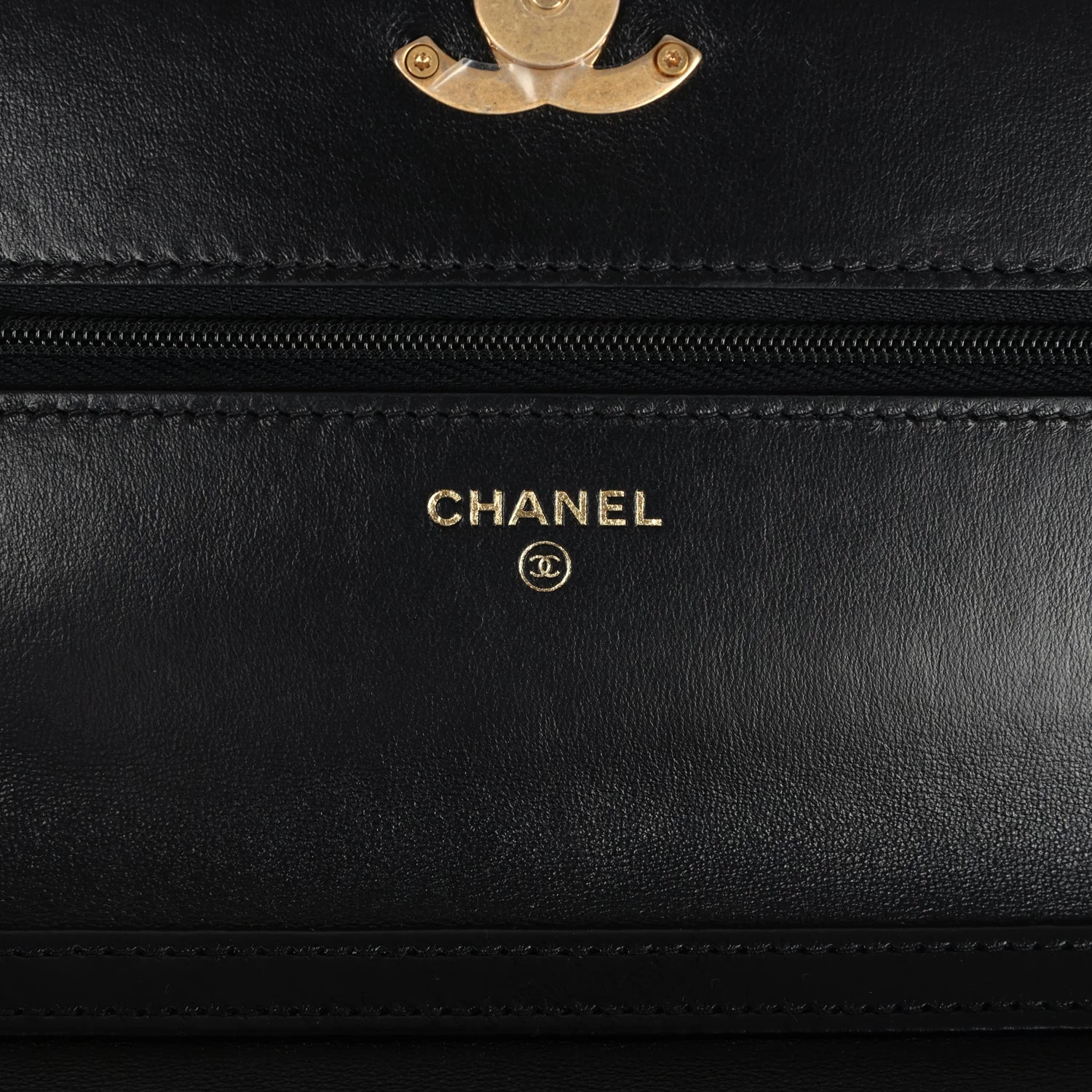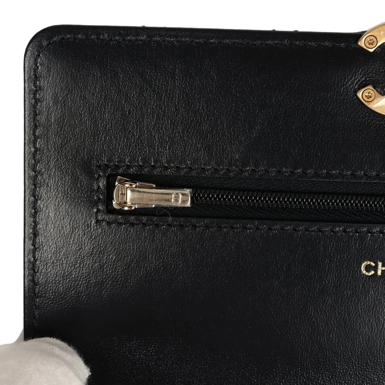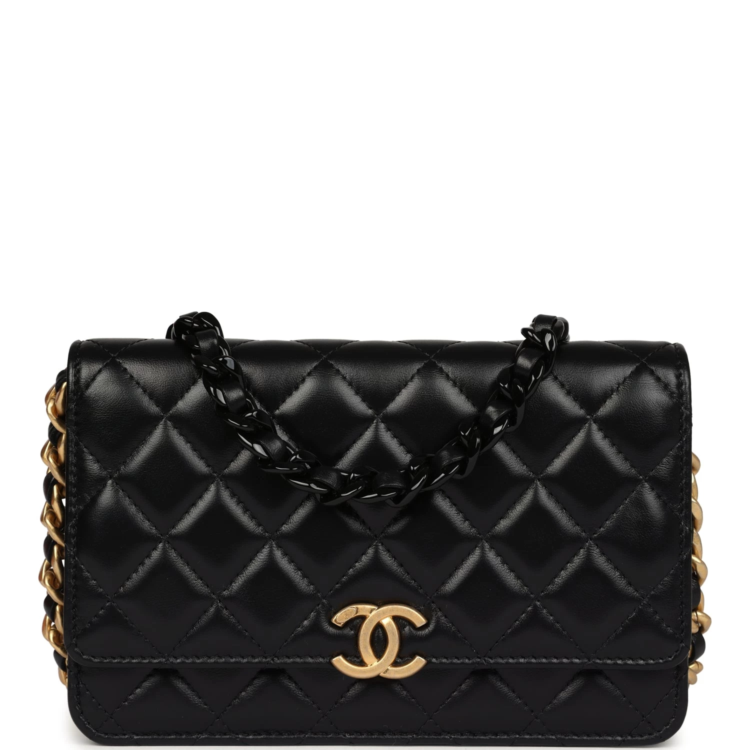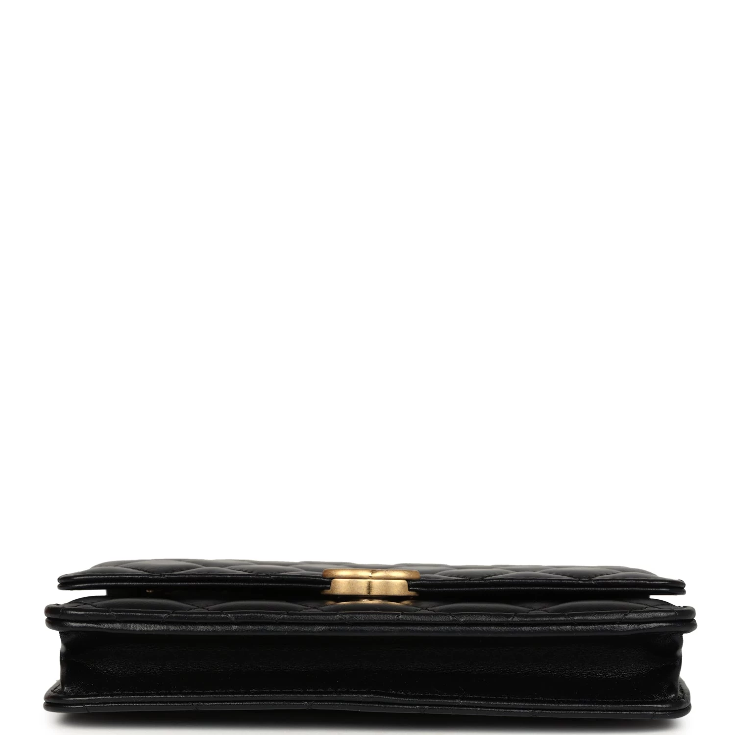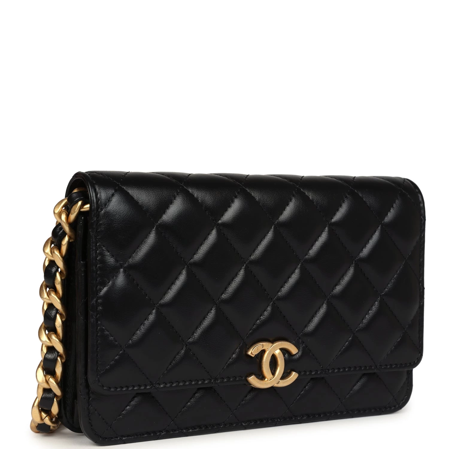 This Wallet On Chain is in black lambskin with black lacquered and brushed gold tone metal hardware, tonal stitching, front flap, CC magnetic snap closure, half moon back pocket, and black lacquered and brushed gold tone chain and black leather interwoven shoulder/crossbody strap.