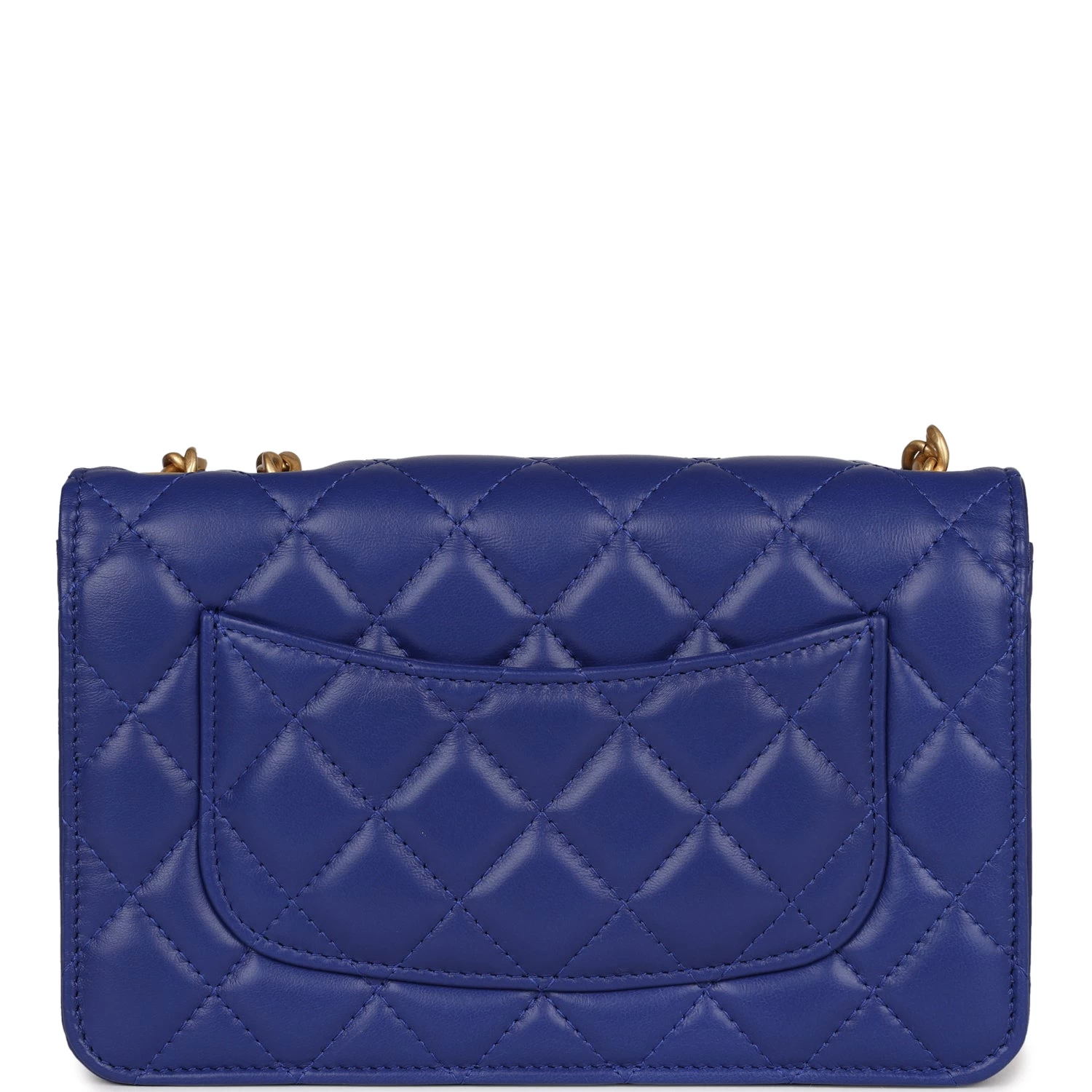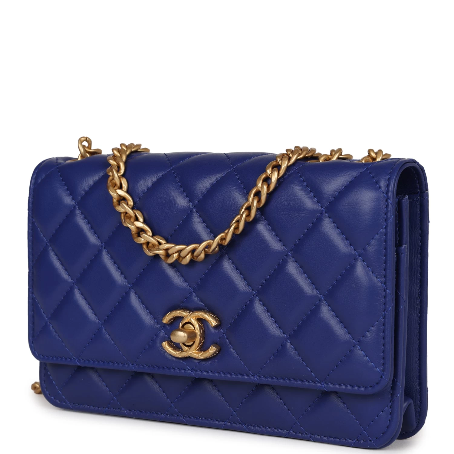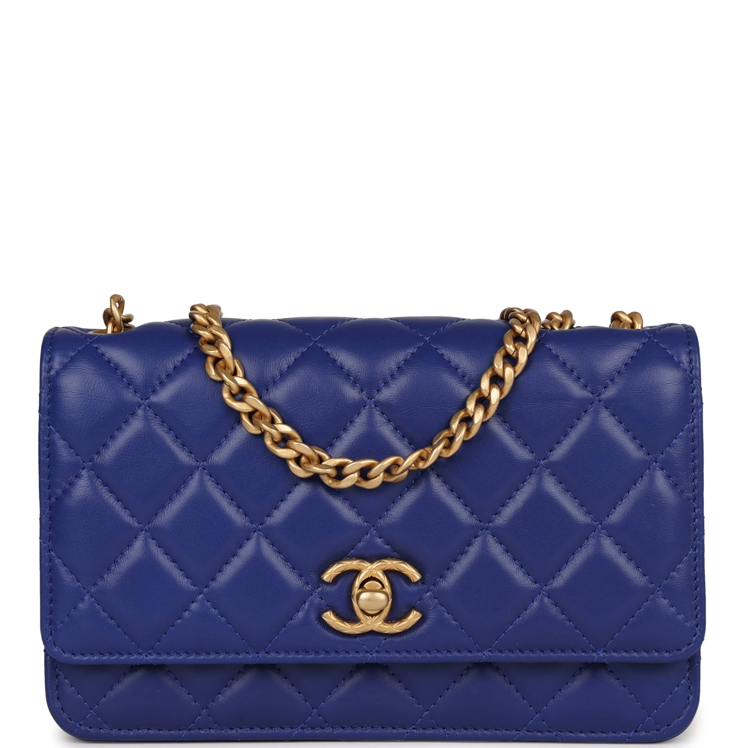 This Wallet on Chain is in Blue Lambskin Leather with antique gold hardware amd has a CC turnlock closure, signature half moon exterior back pocket and adjustable tonal chain-link crossbody strap/shoulder strap.