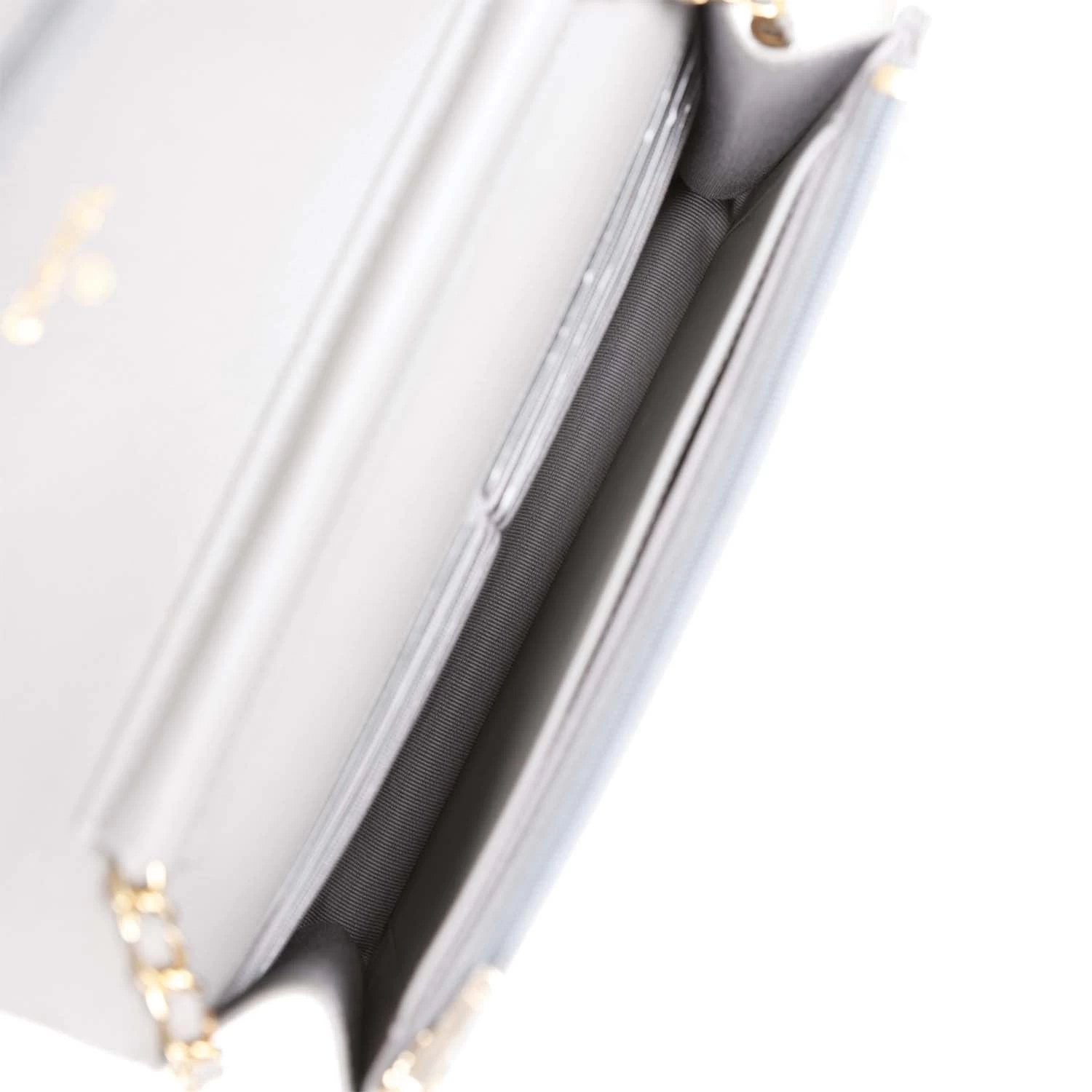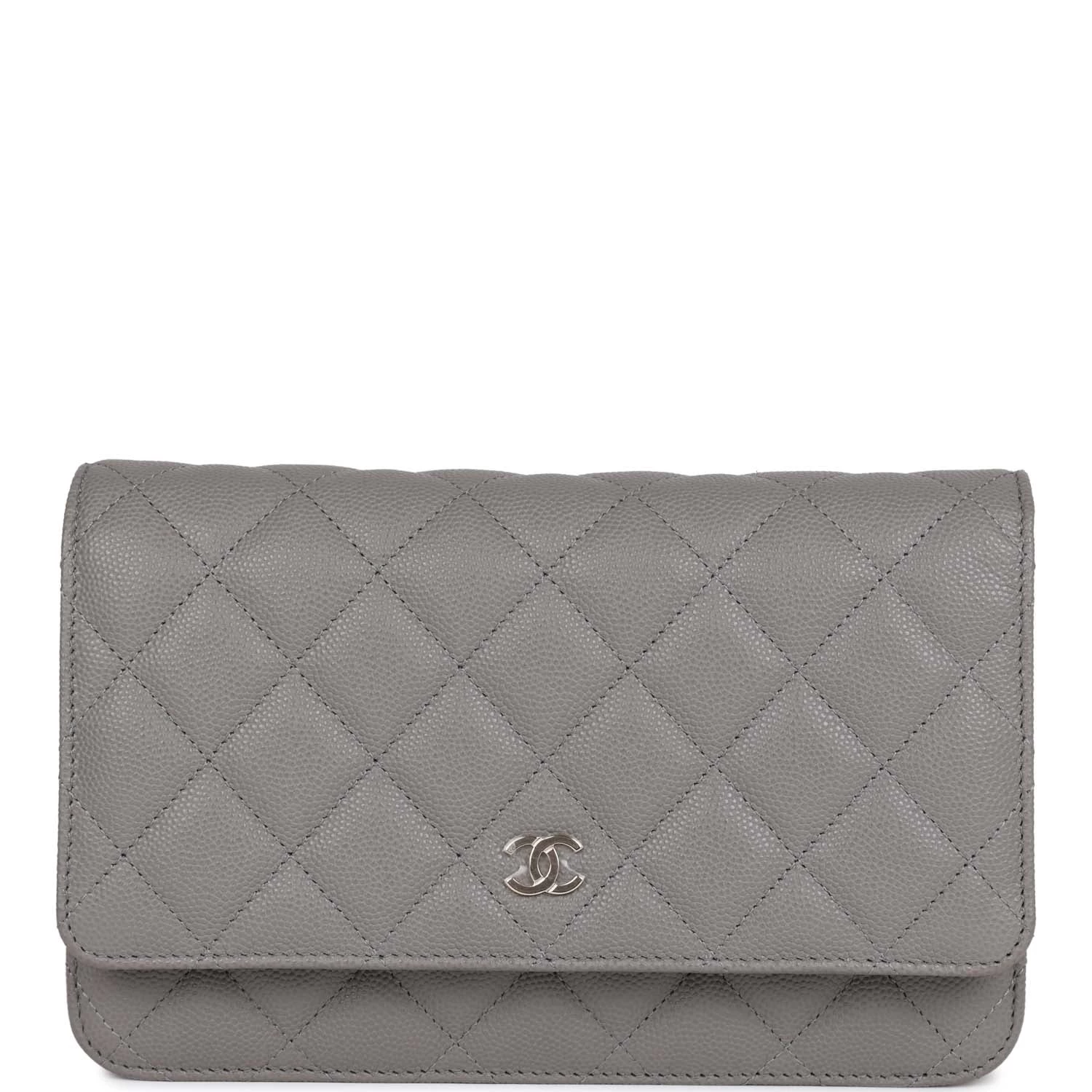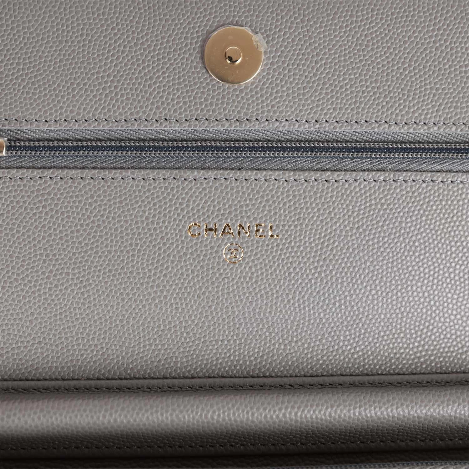 This Wallet on Chain is of Grey caviar with light gold tone hardware and has a front flap with CC emblem, half moon back pocket and long light gold tone metal and grey leather chain.
