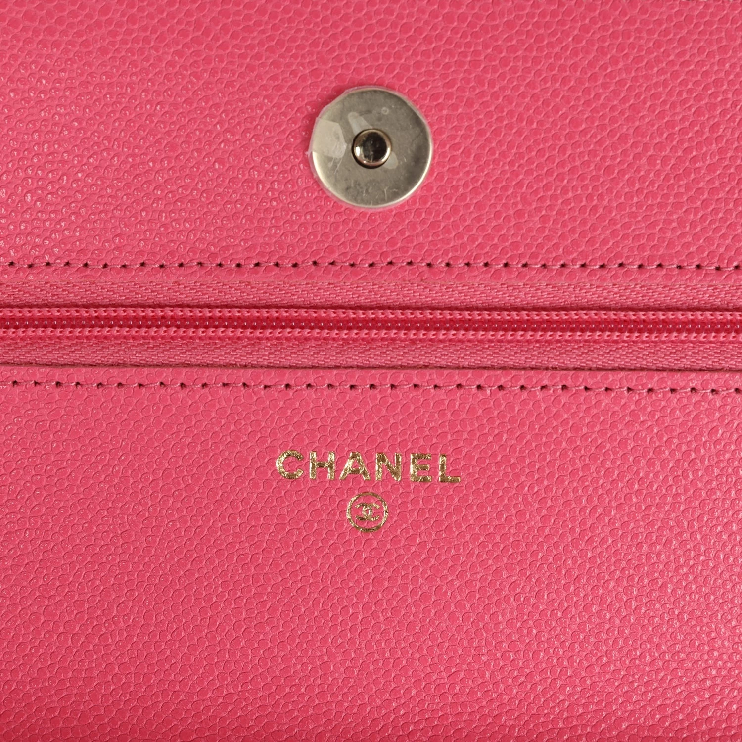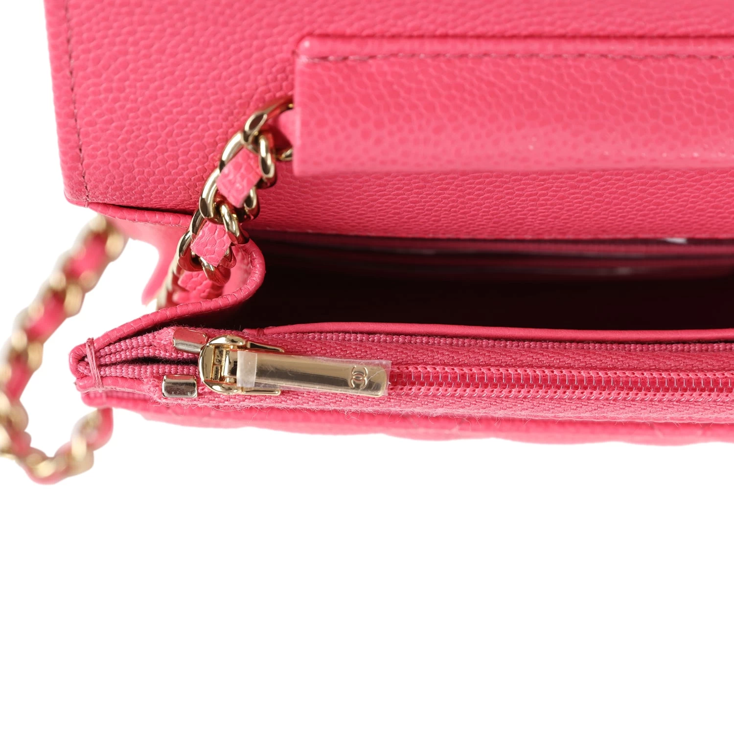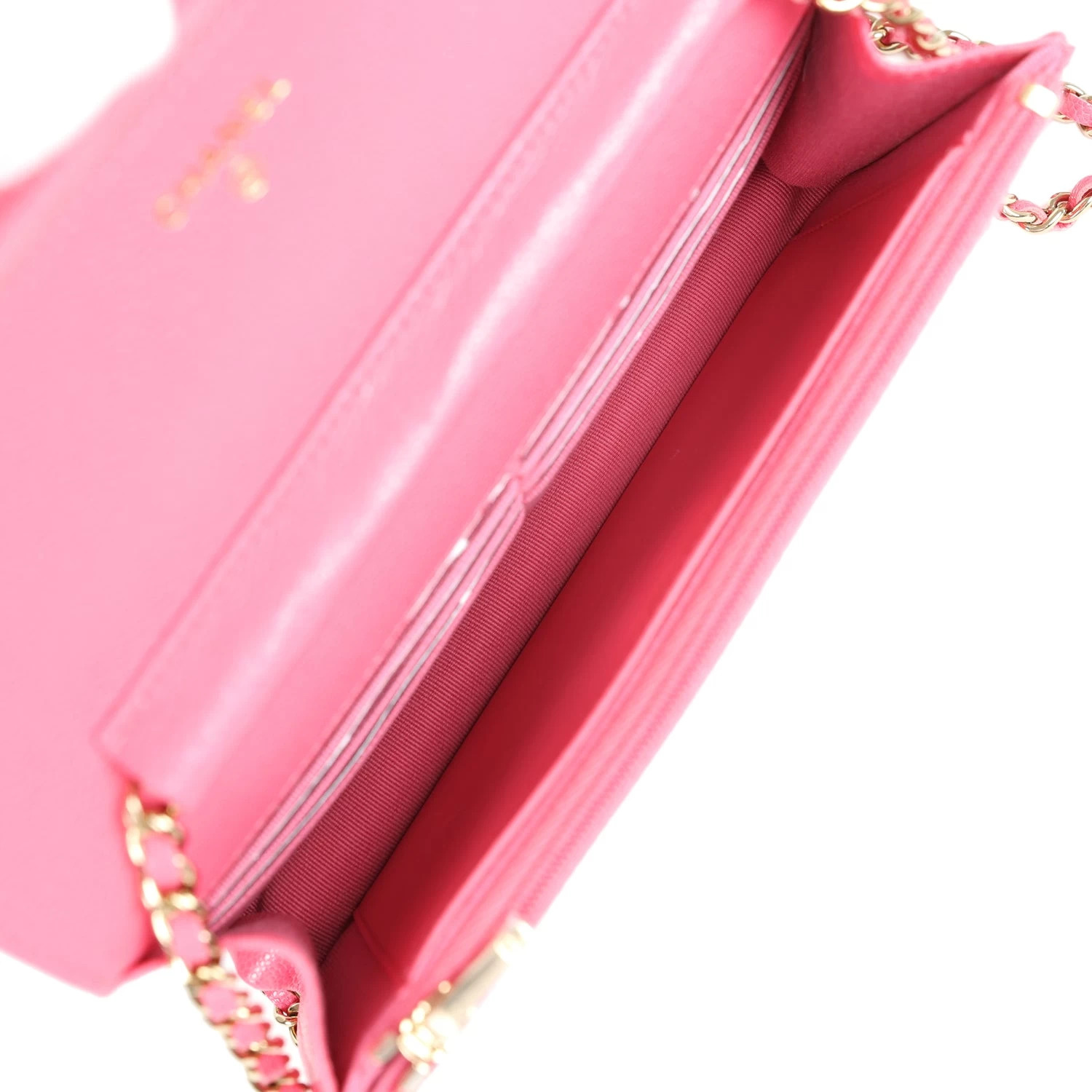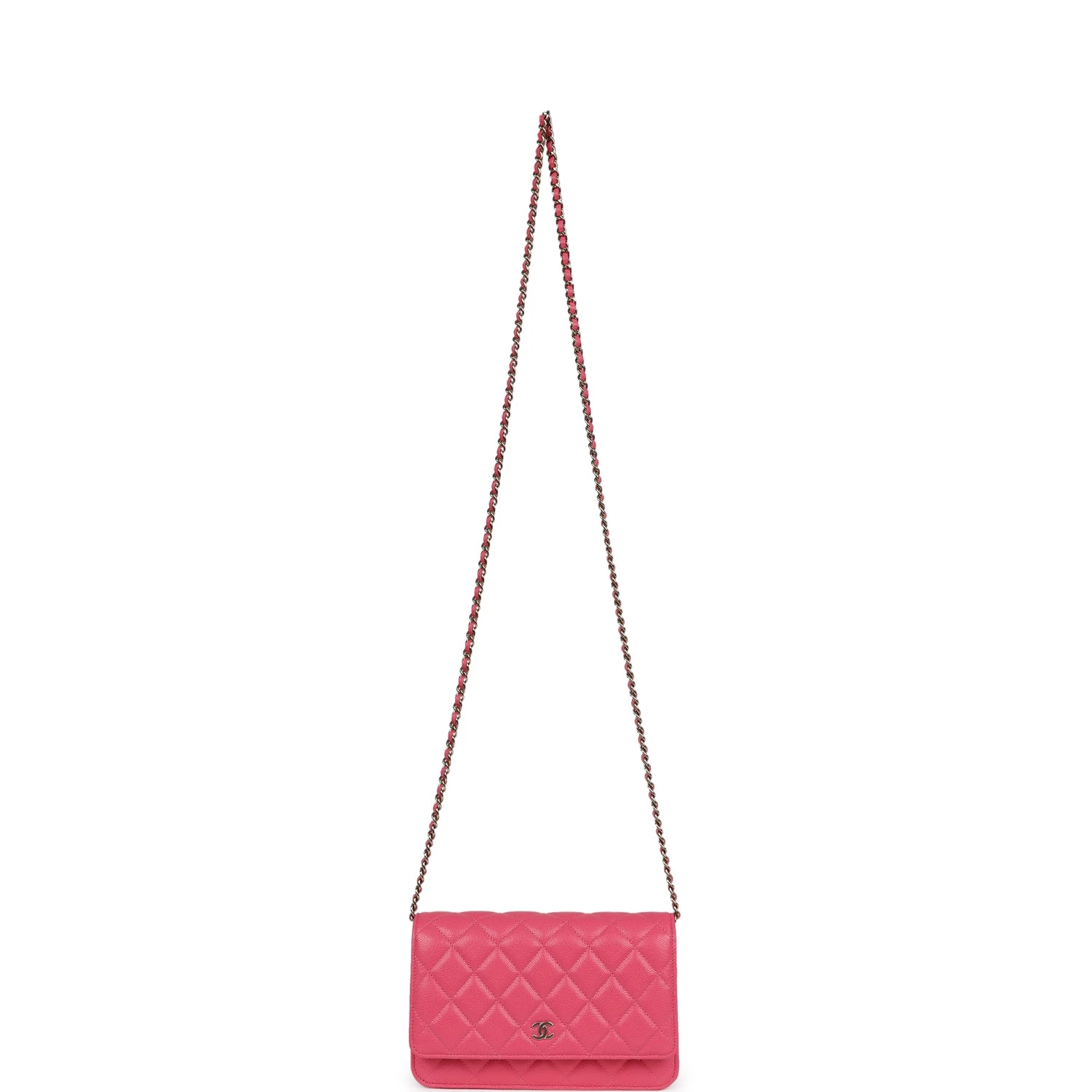 This Chanel quilted Wallet on Chain in Hot Pink is in caviar leather with Gold tone hardware, has tonal stitching, a front flap, a CC snap lock closure, a half moon back pocket, and Gold tone chain with a Hot Pink leather interwoven shoulder/crossbody strap.Â