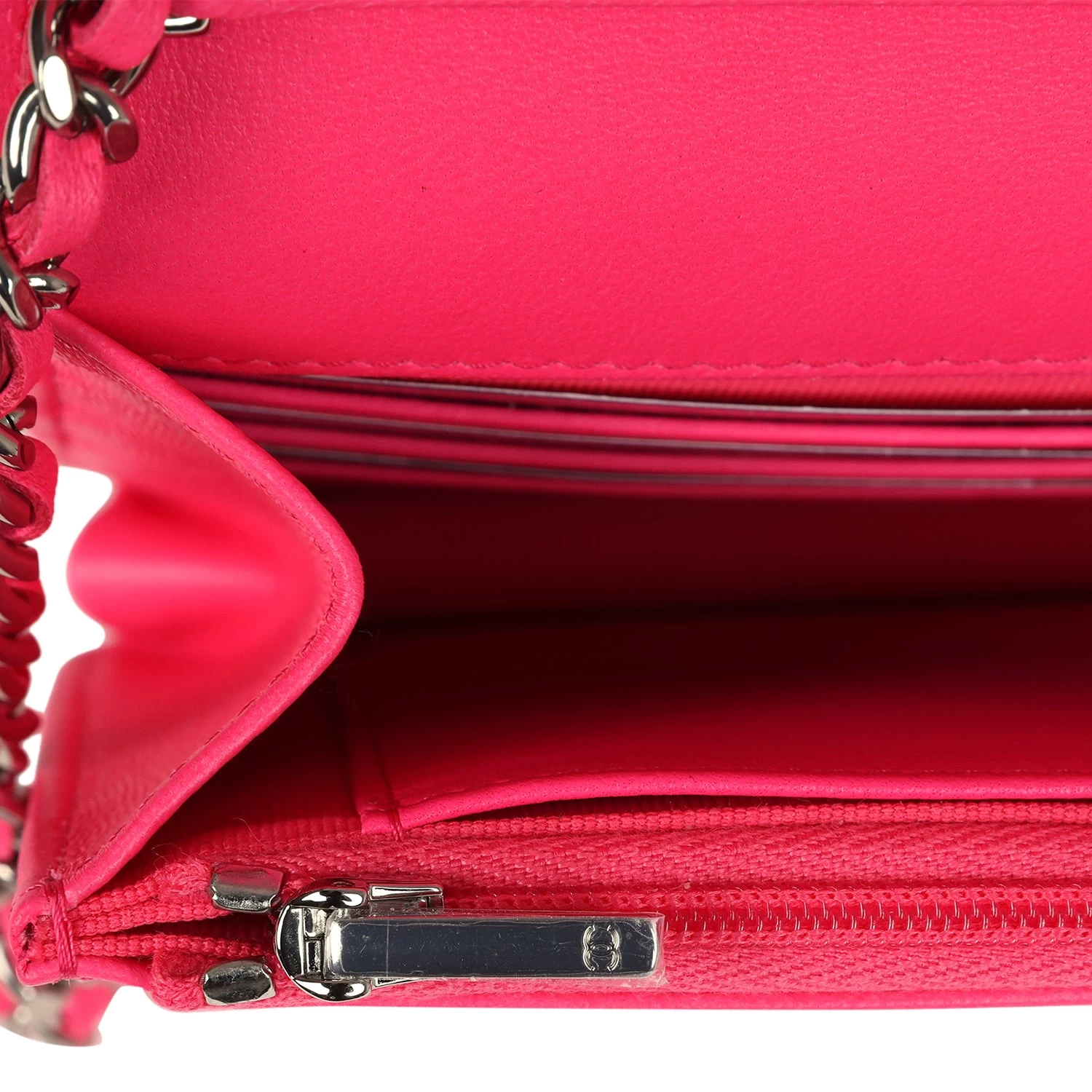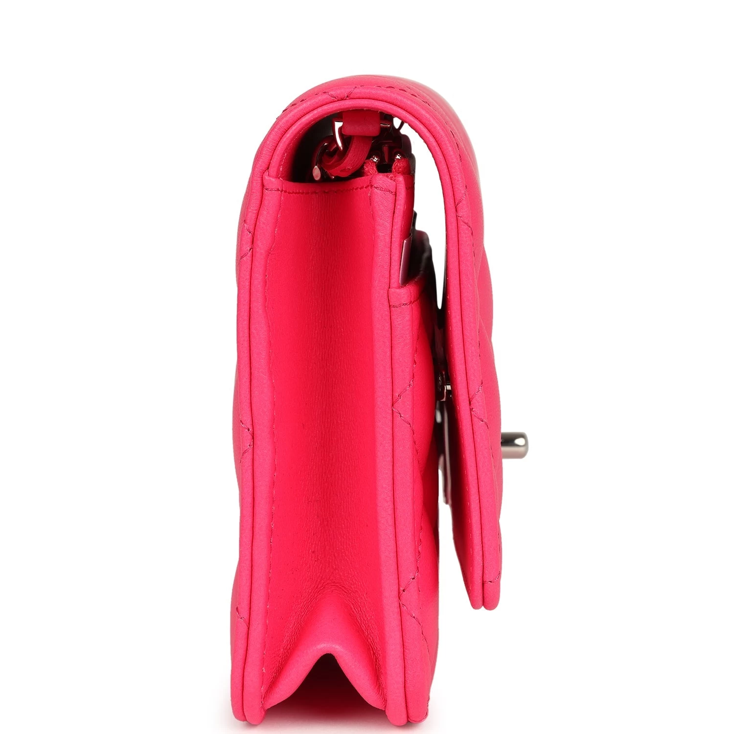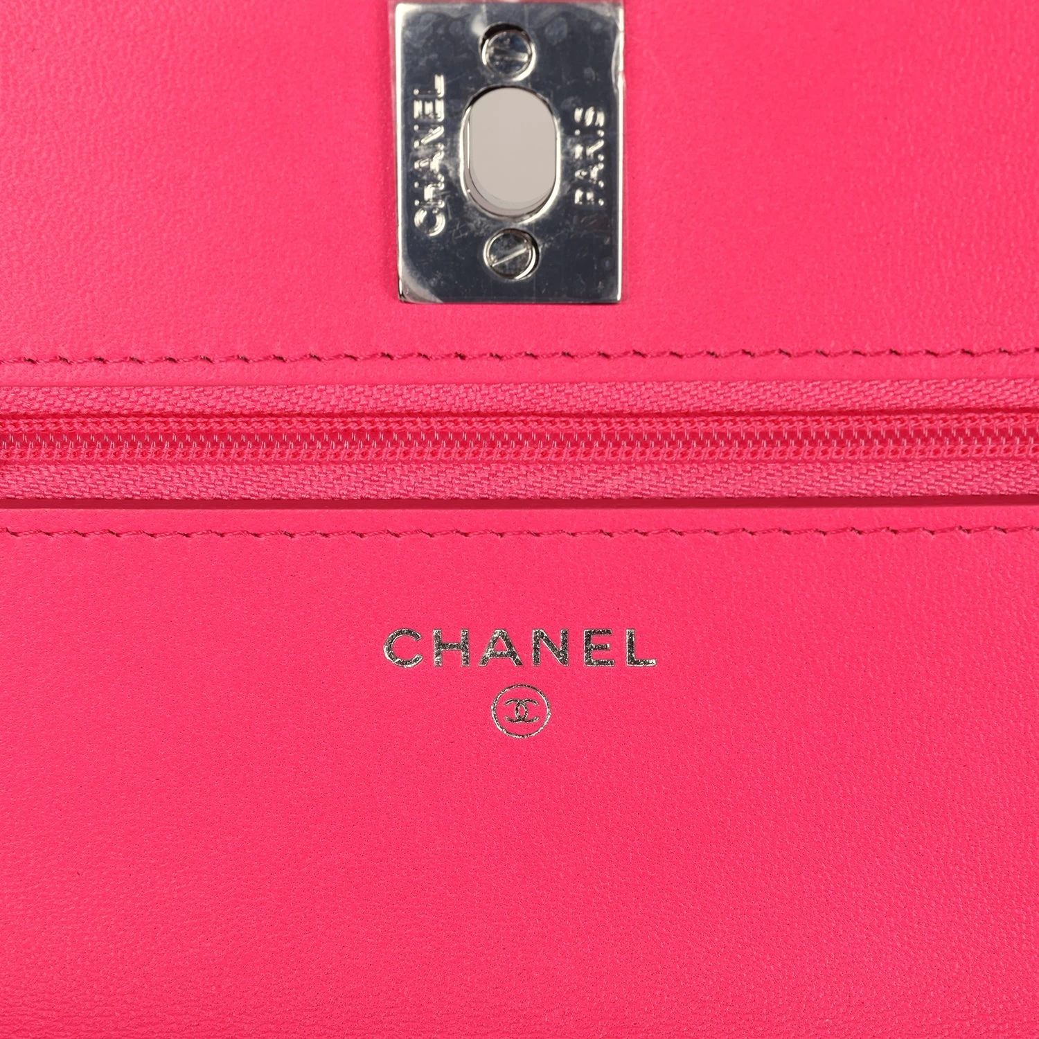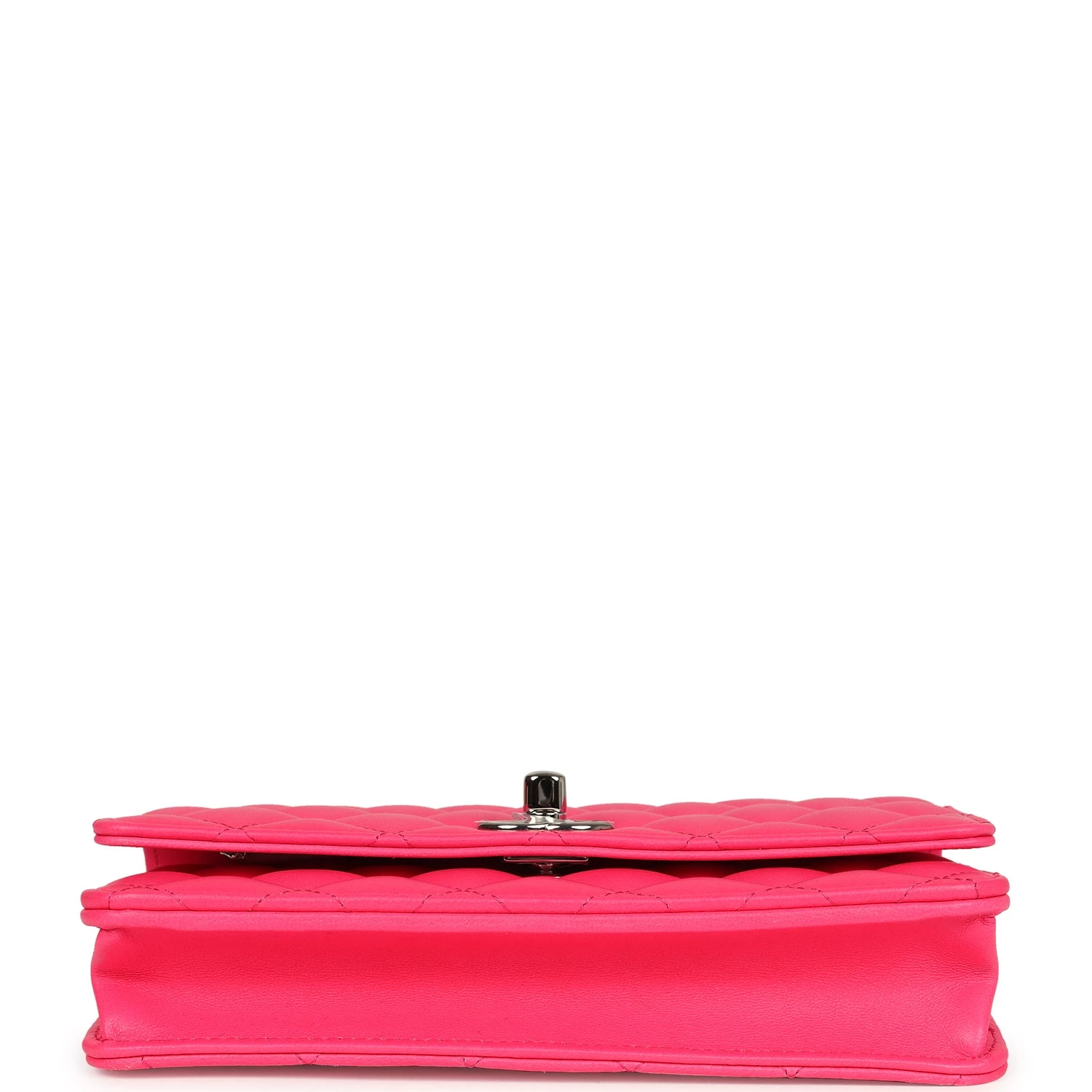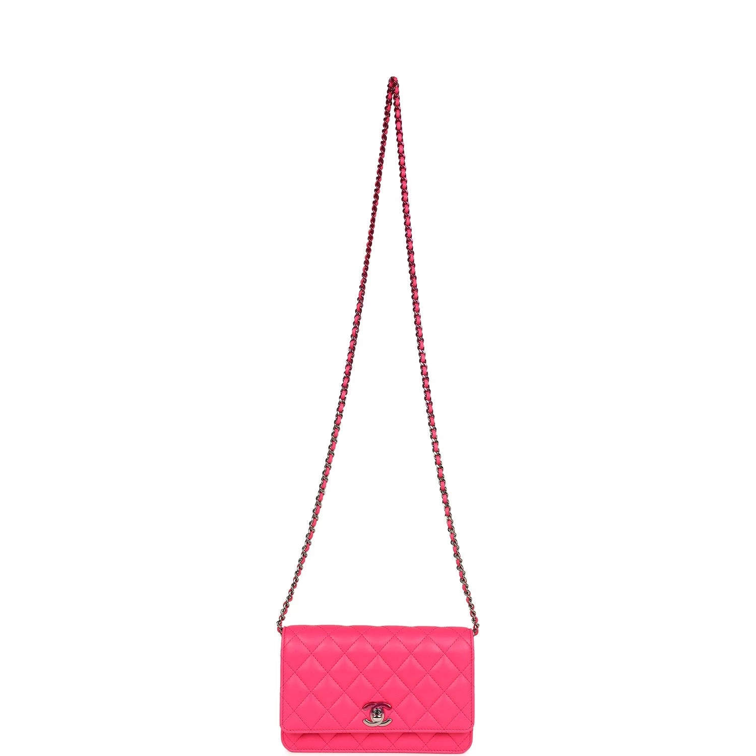 This Chanel Wallet on Chain is in hot pink lambskin leather with mixed metal hardware and has a front flap with CC emblem, half moon back pocket and a hot pink lacquered and silver tone chain and hot pink leather interwoven shoulder/crossbody strap.Â