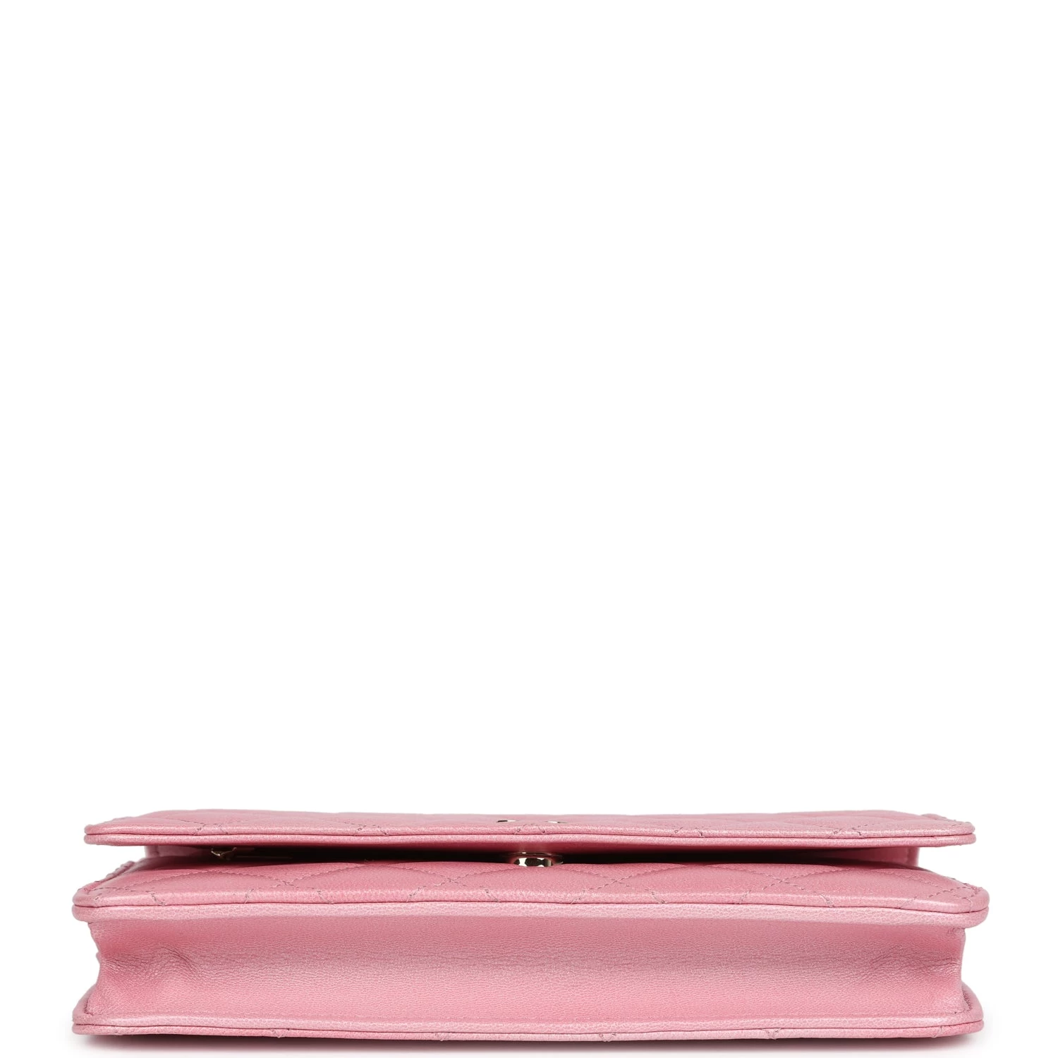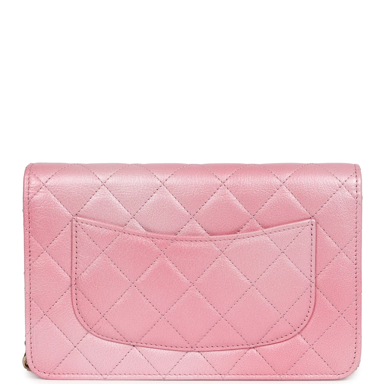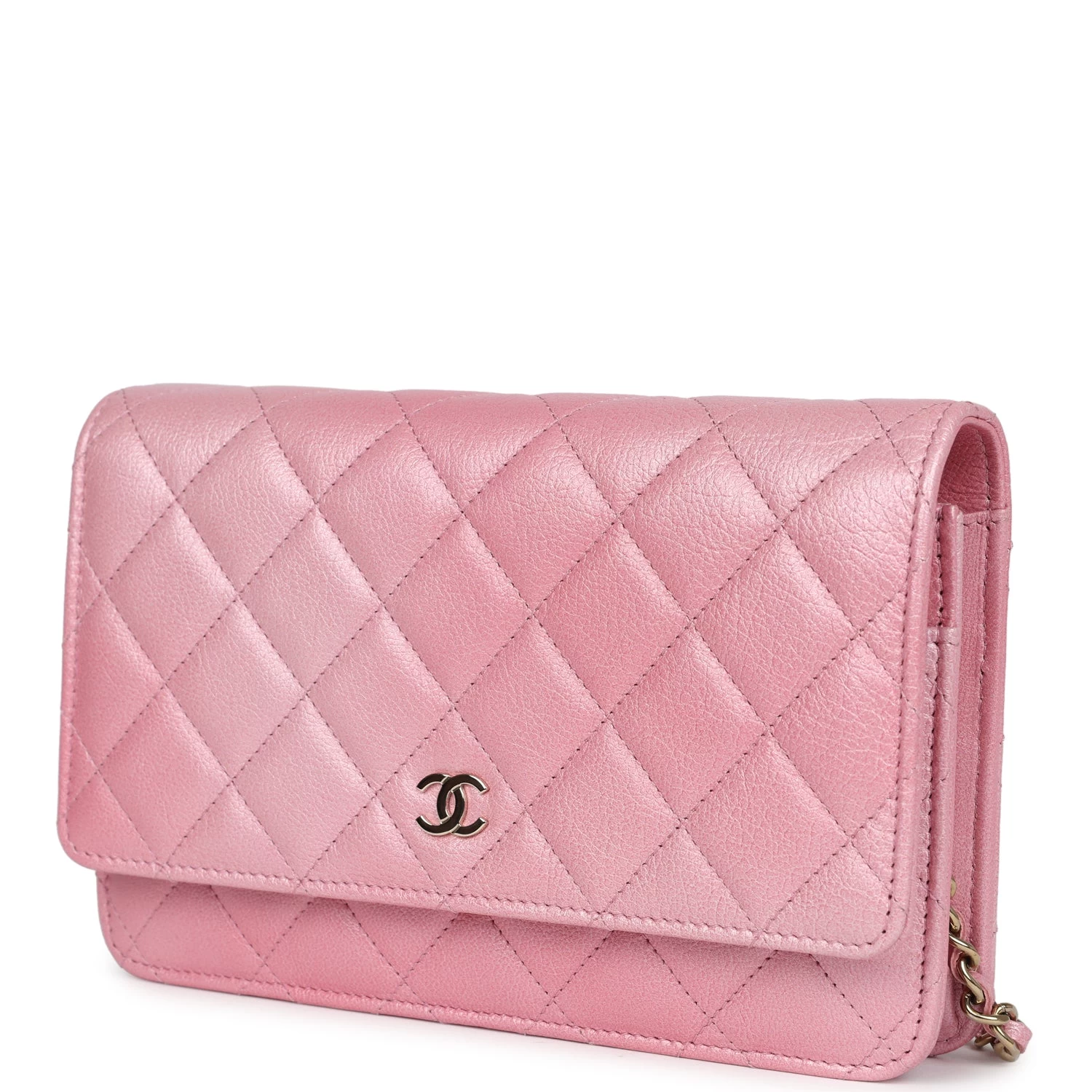 This classic quilted wallet on chain is in pearly pink iridescent calfskin leather with gold tone hardware, and features tonal stitching, signature half moon exterior back pocket and a gold tone chain-link crossbody strap/shoulder strap.
