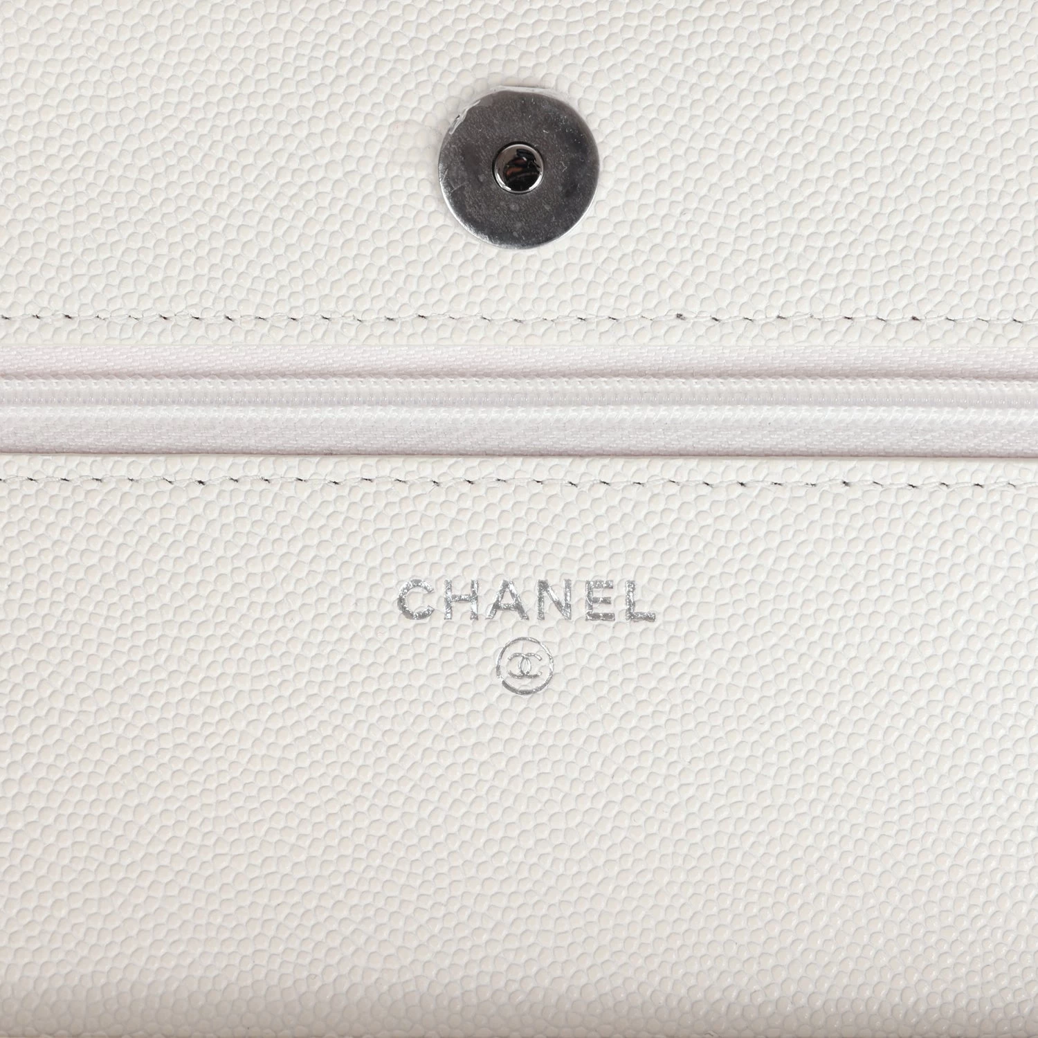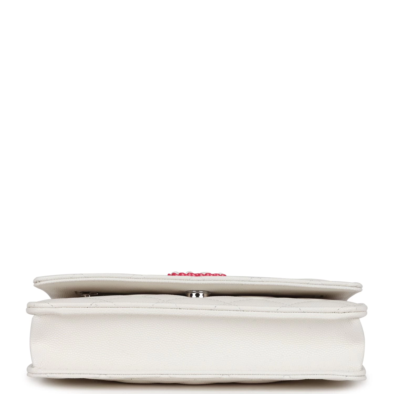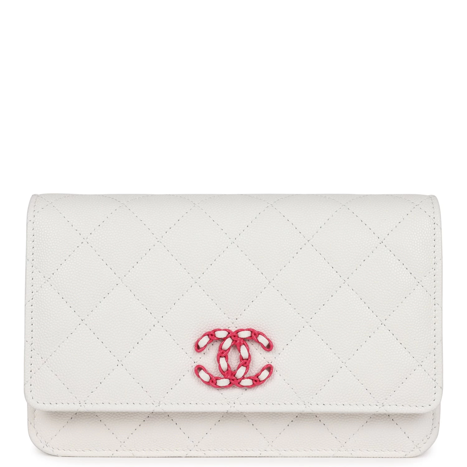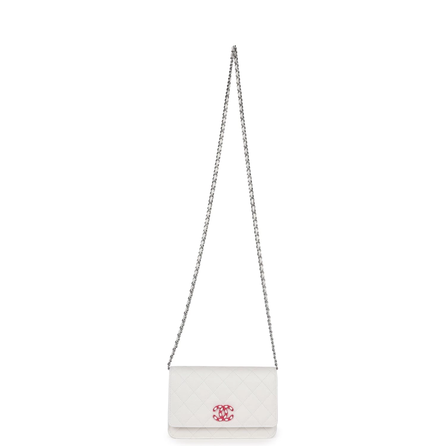 This Wallet on Chain is in White caviar Leather with pink and silver hardware, signature half moon exterior back pocket, tonal chain-link crossbody strap/shoulder strap, and front CC button closure.