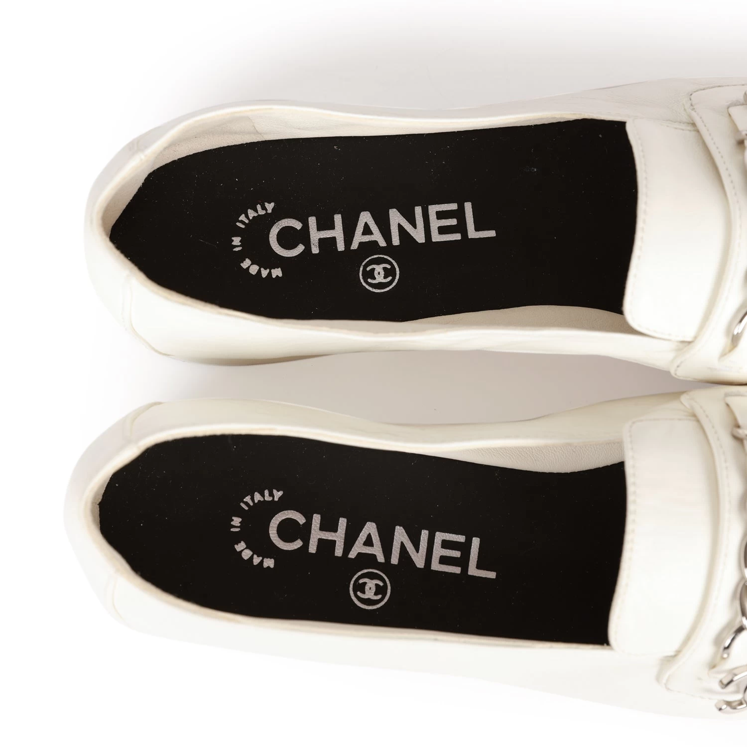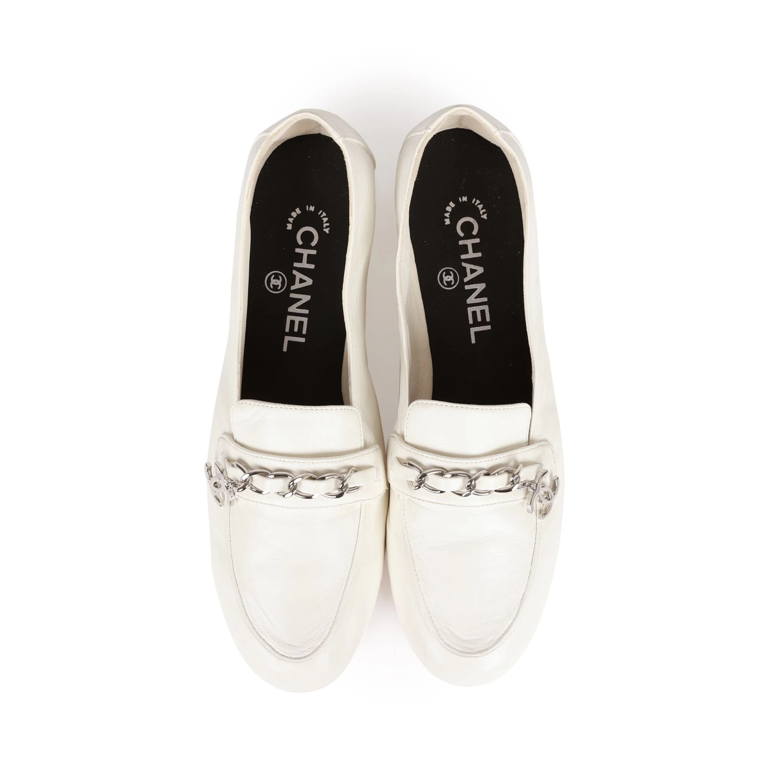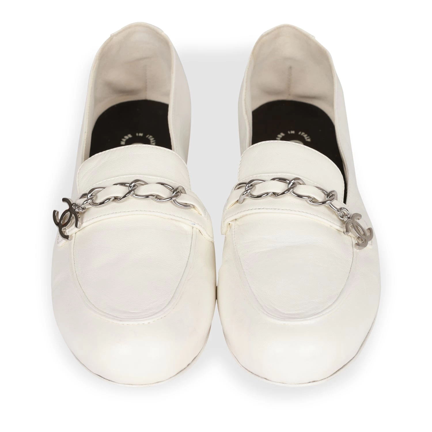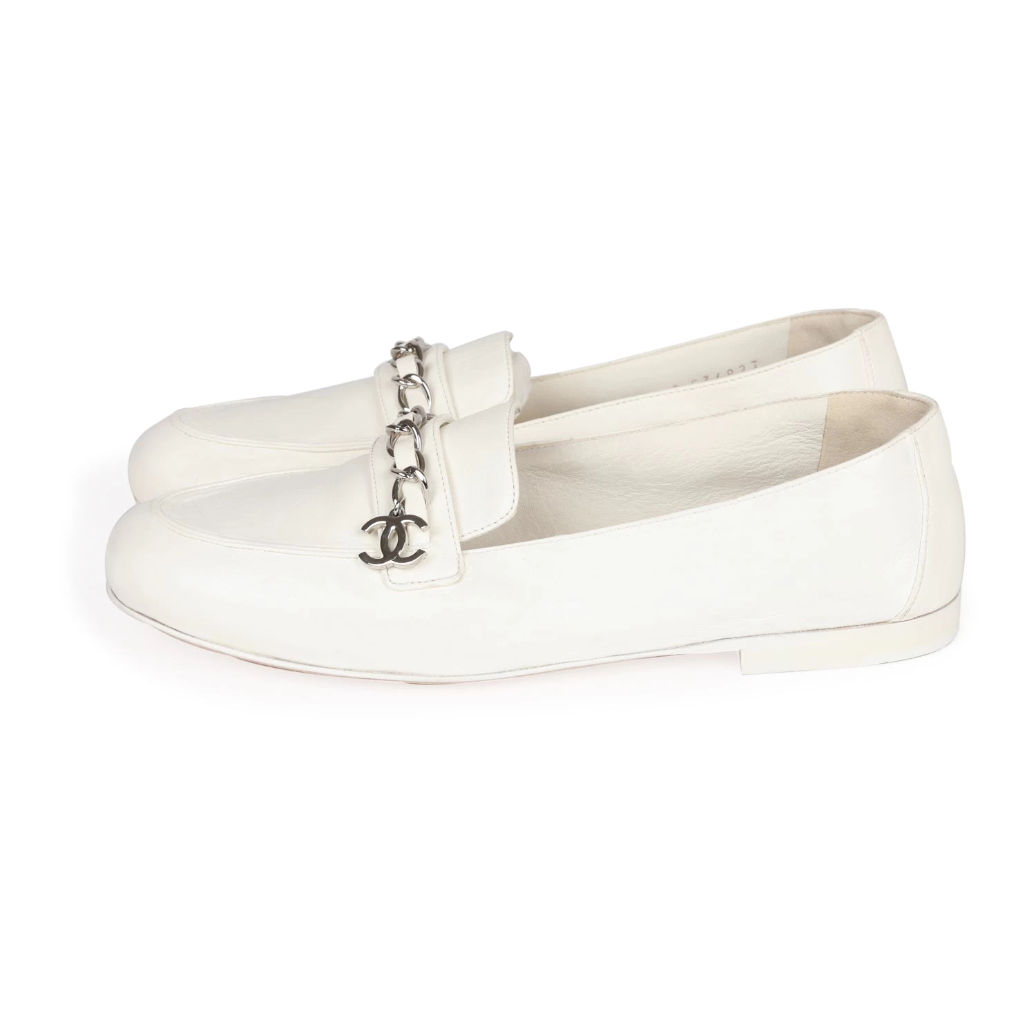 This pair of Chanel loafers are in White lambskin and features a silver “CC” chainlink, logo pendant, tonal stitching, and beige leather soles.