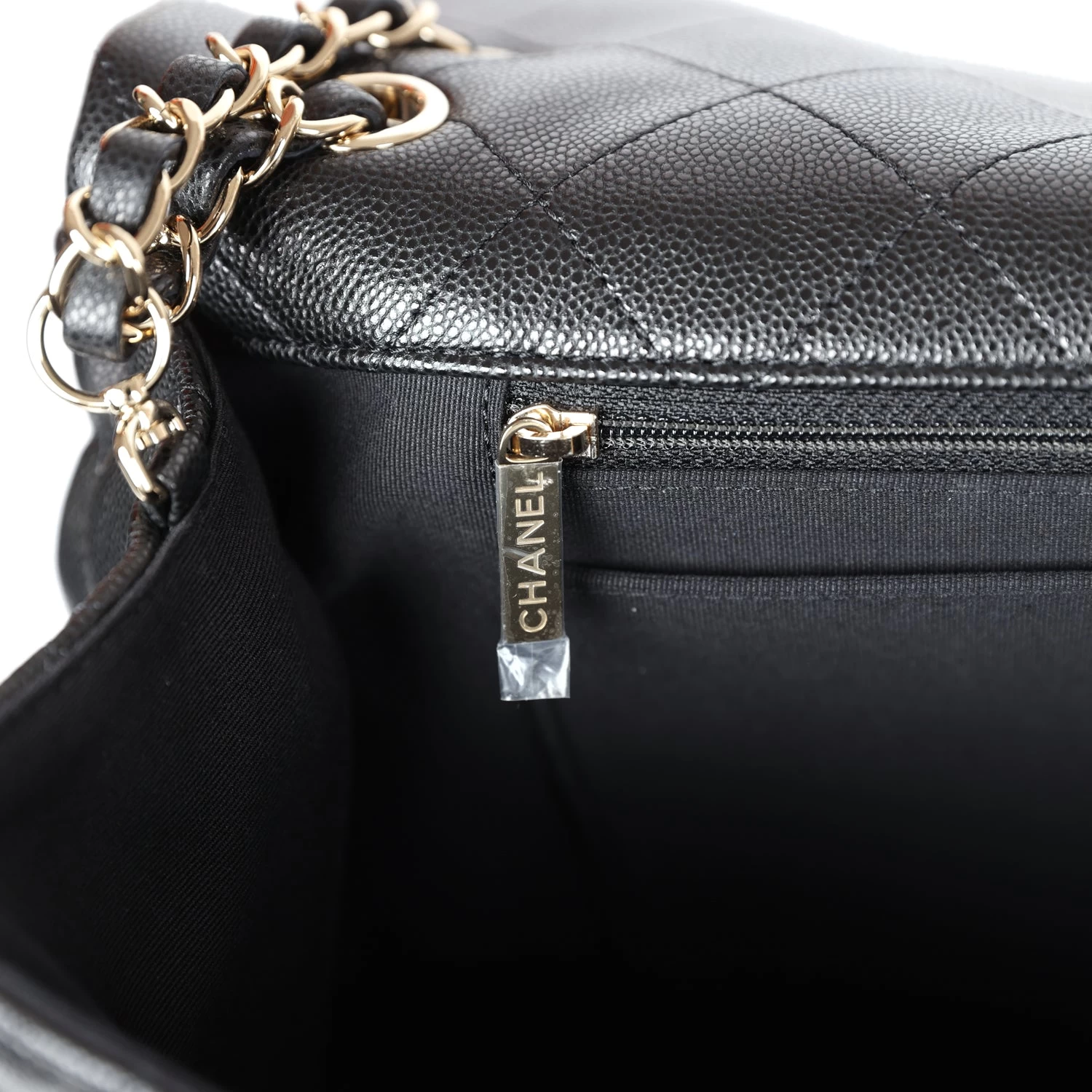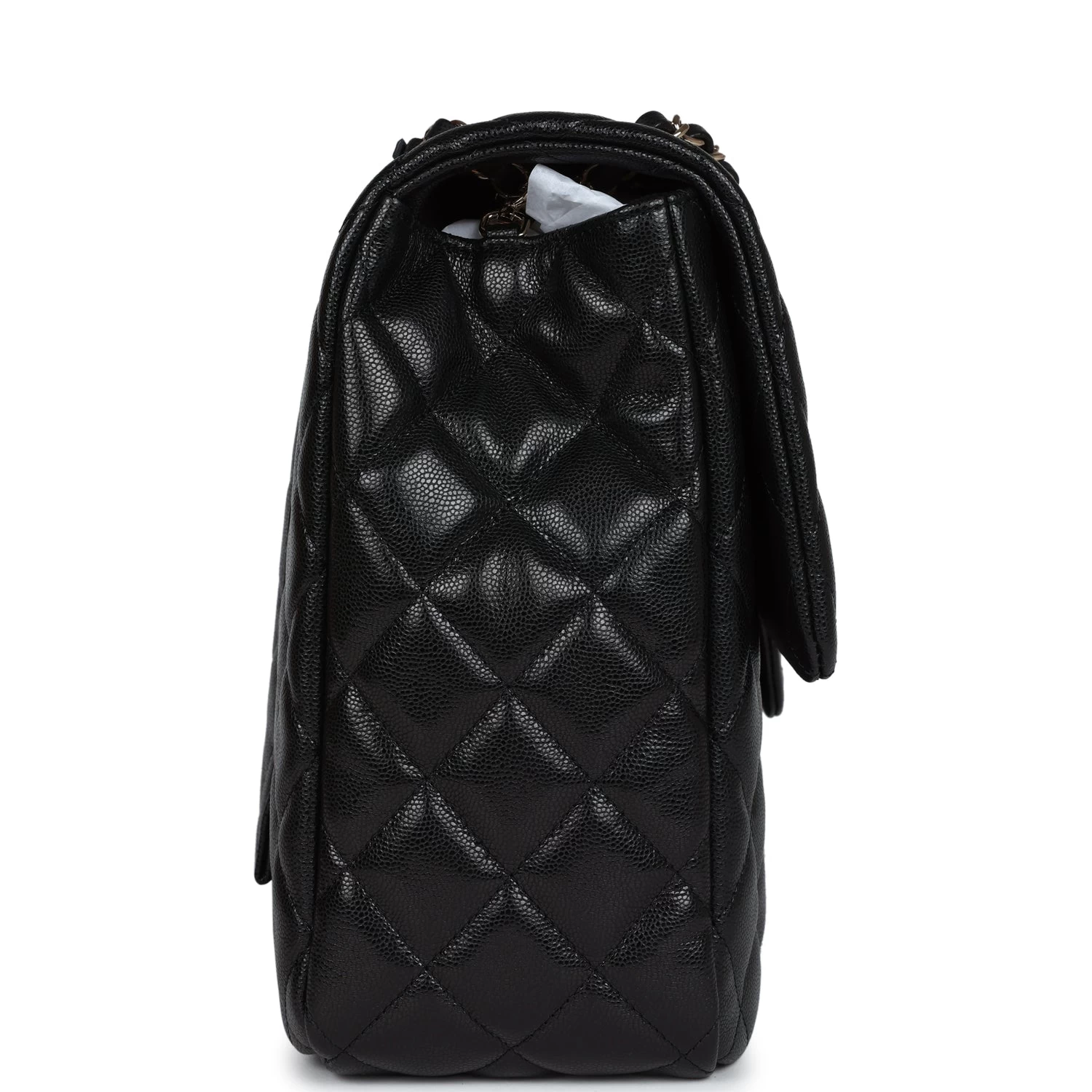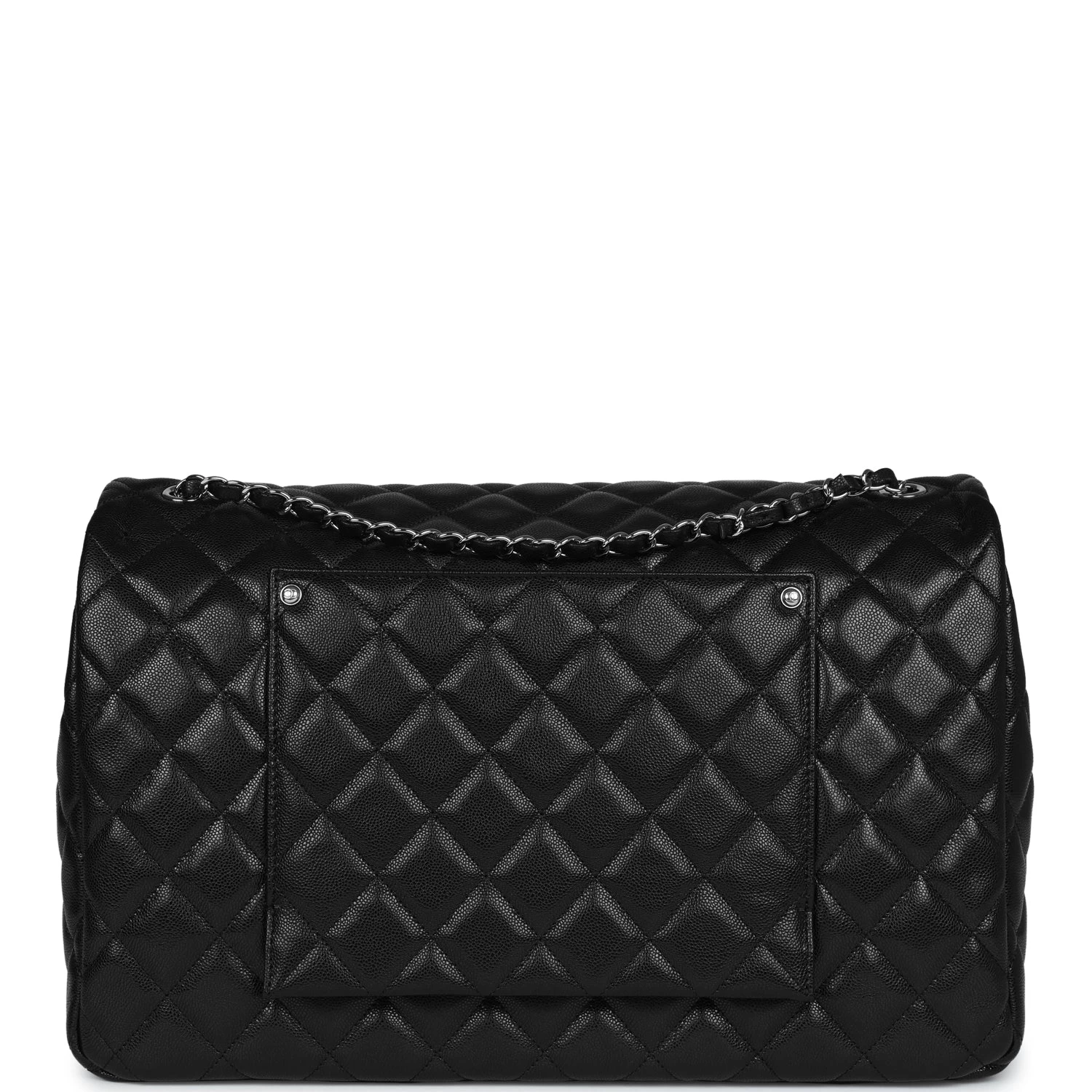 This XXL flap bag is in Black shiny caviar with light gold tone hardware and has a front flap with signature CC turnlock closure, rear slip pocket and interwoven white leather and light gold tone chain link shoulder straps.