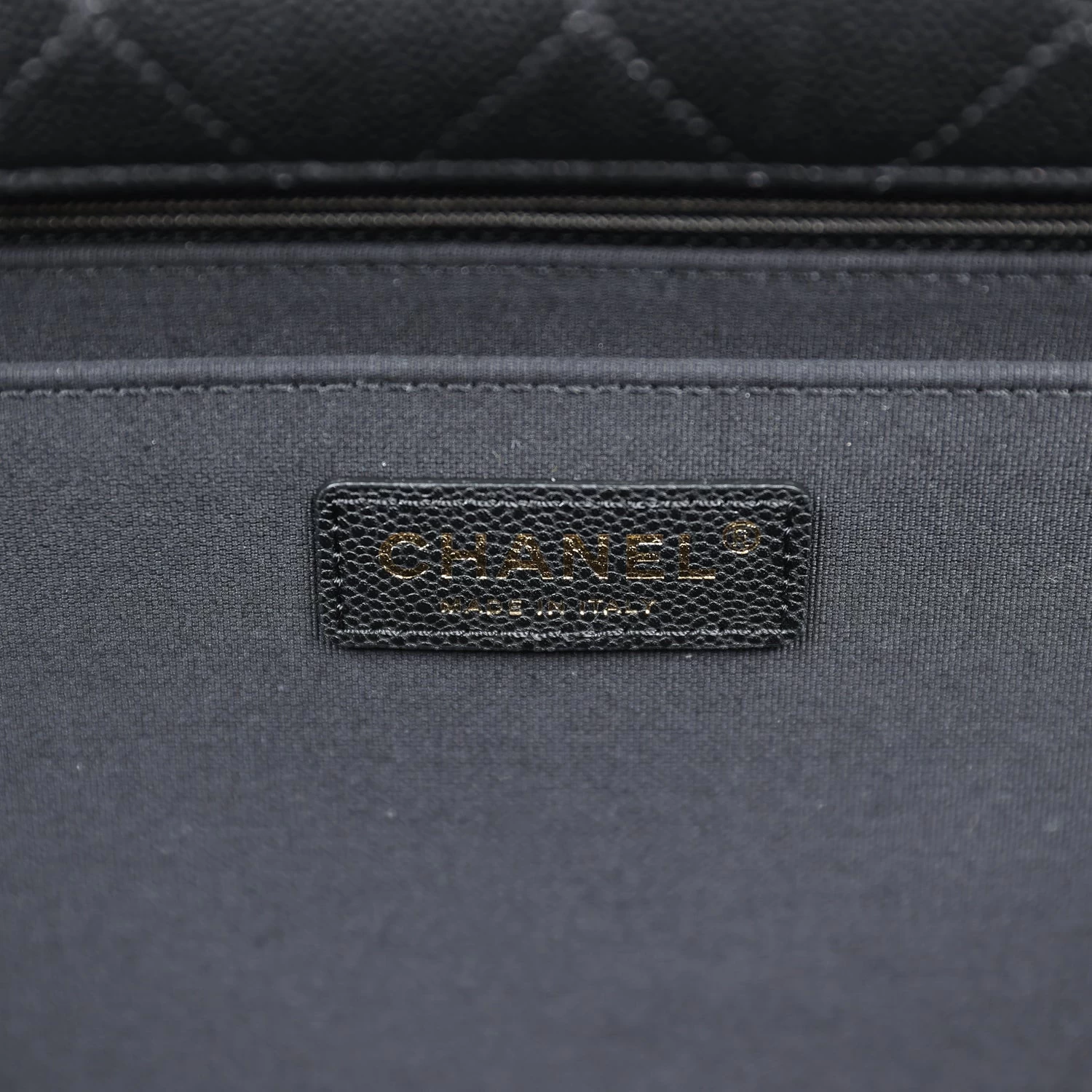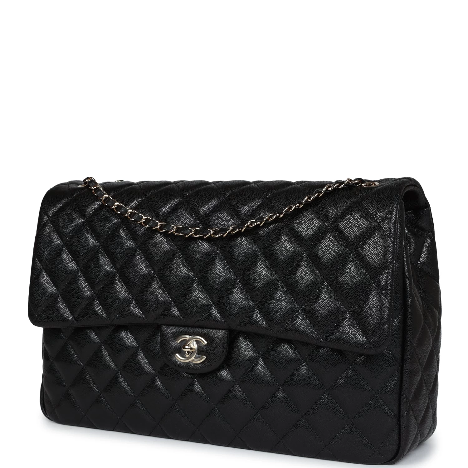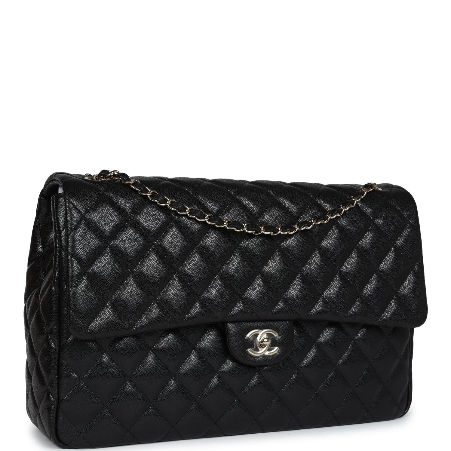 This XXL flap bag is in Black shiny caviar with light gold tone hardware and has a front flap with signature CC turnlock closure, rear slip pocket and interwoven white leather and light gold tone chain link shoulder straps.