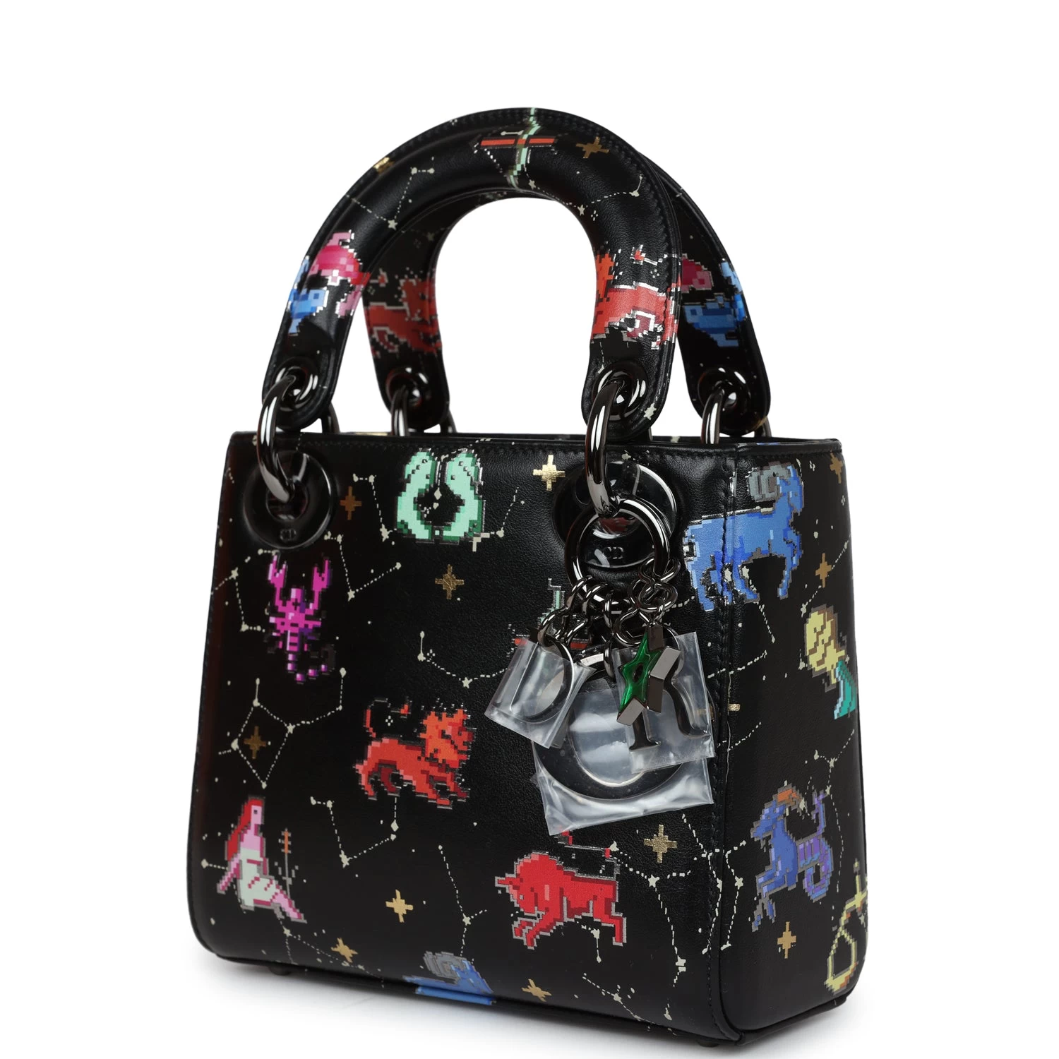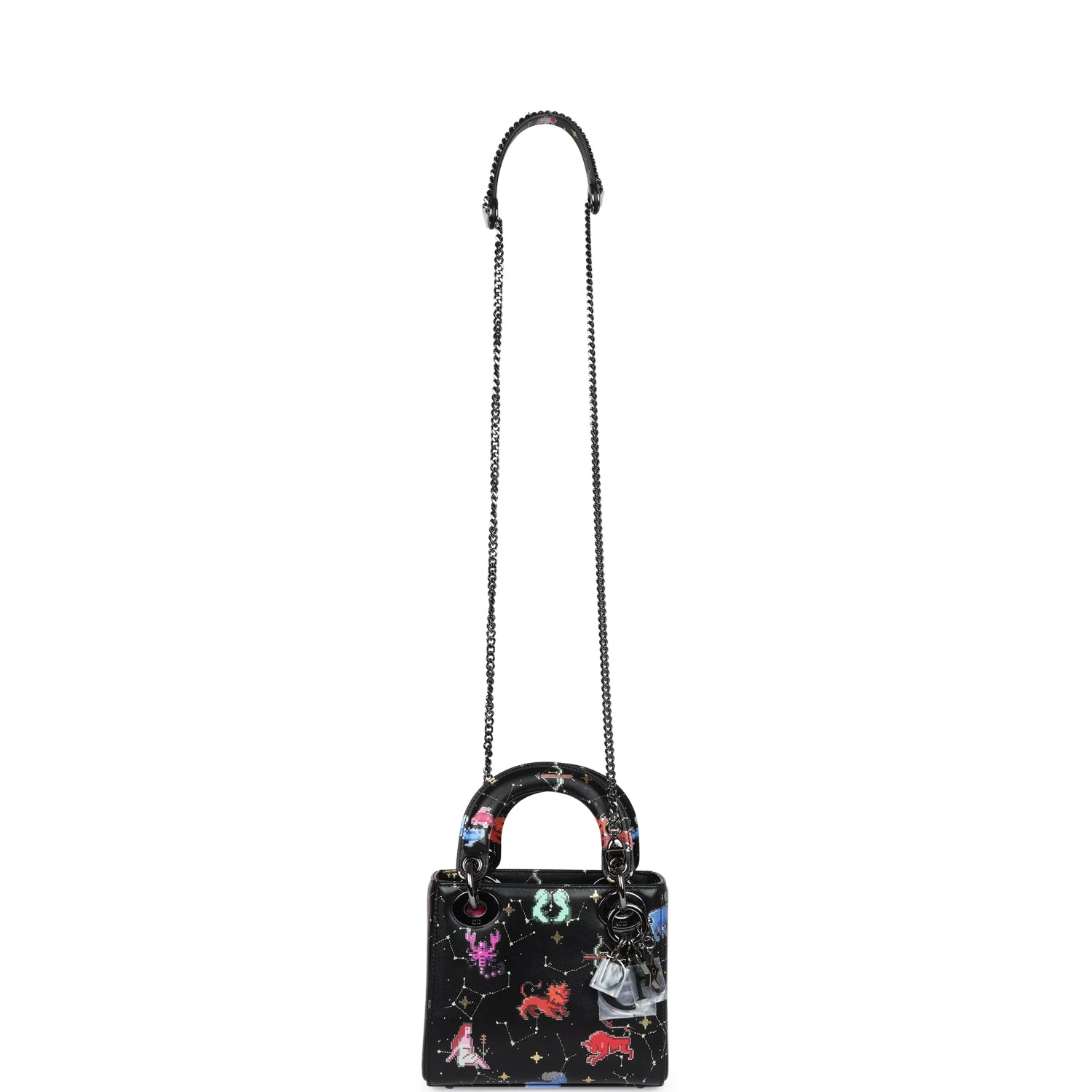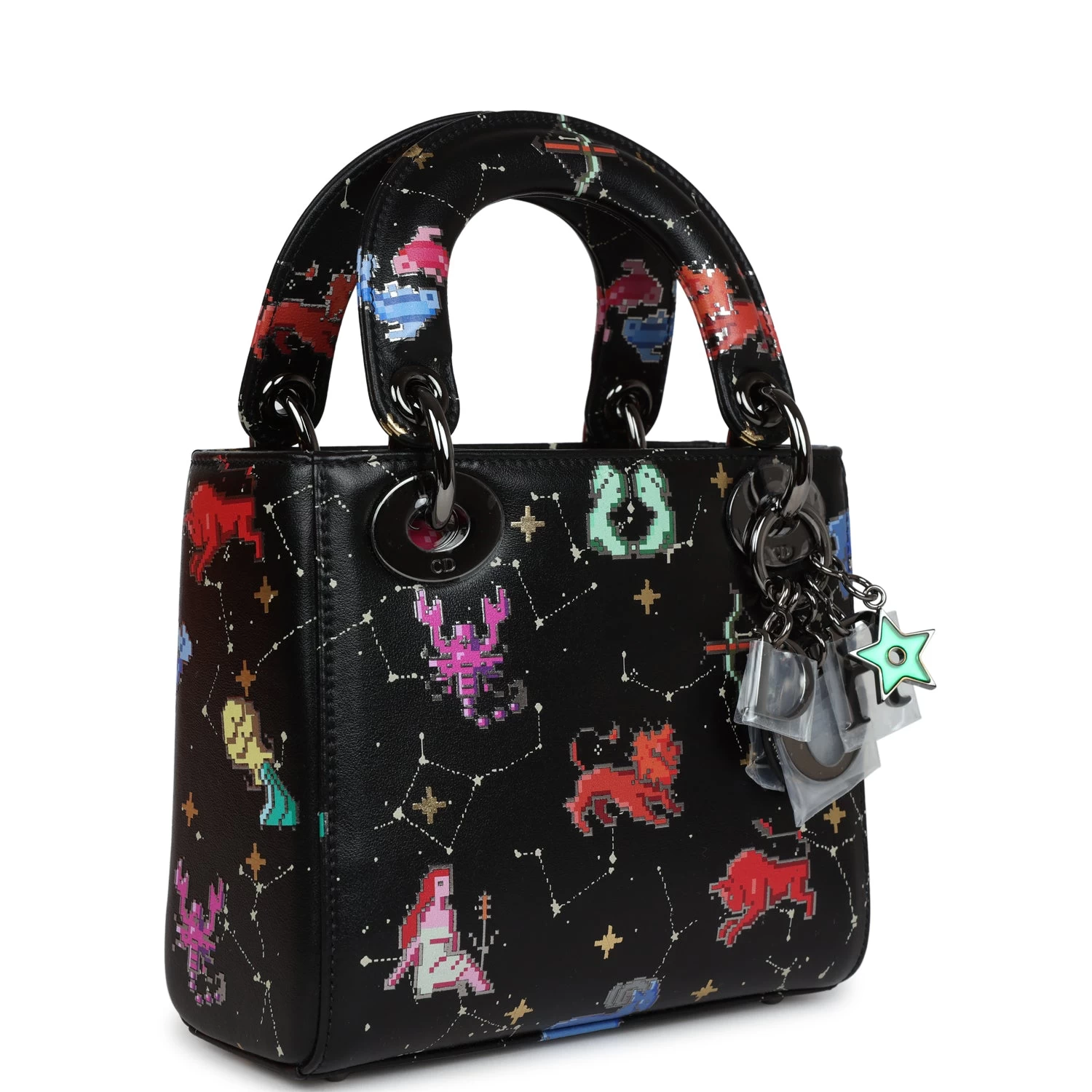 This Mini Limited Edition Zodiac Pixel Print Black Calfskin leather with Ruthenium Hardware, features tonal stitching, pixel Zodic printed leather, two top handles, Four ruthenium feet, Dior logo charm on front of bag, detachable shoulder strap.
