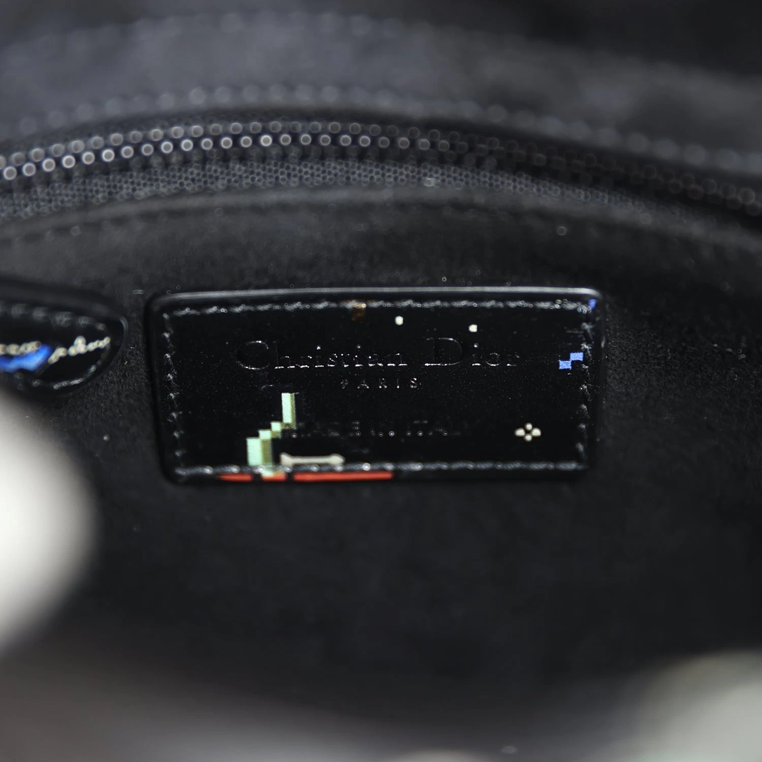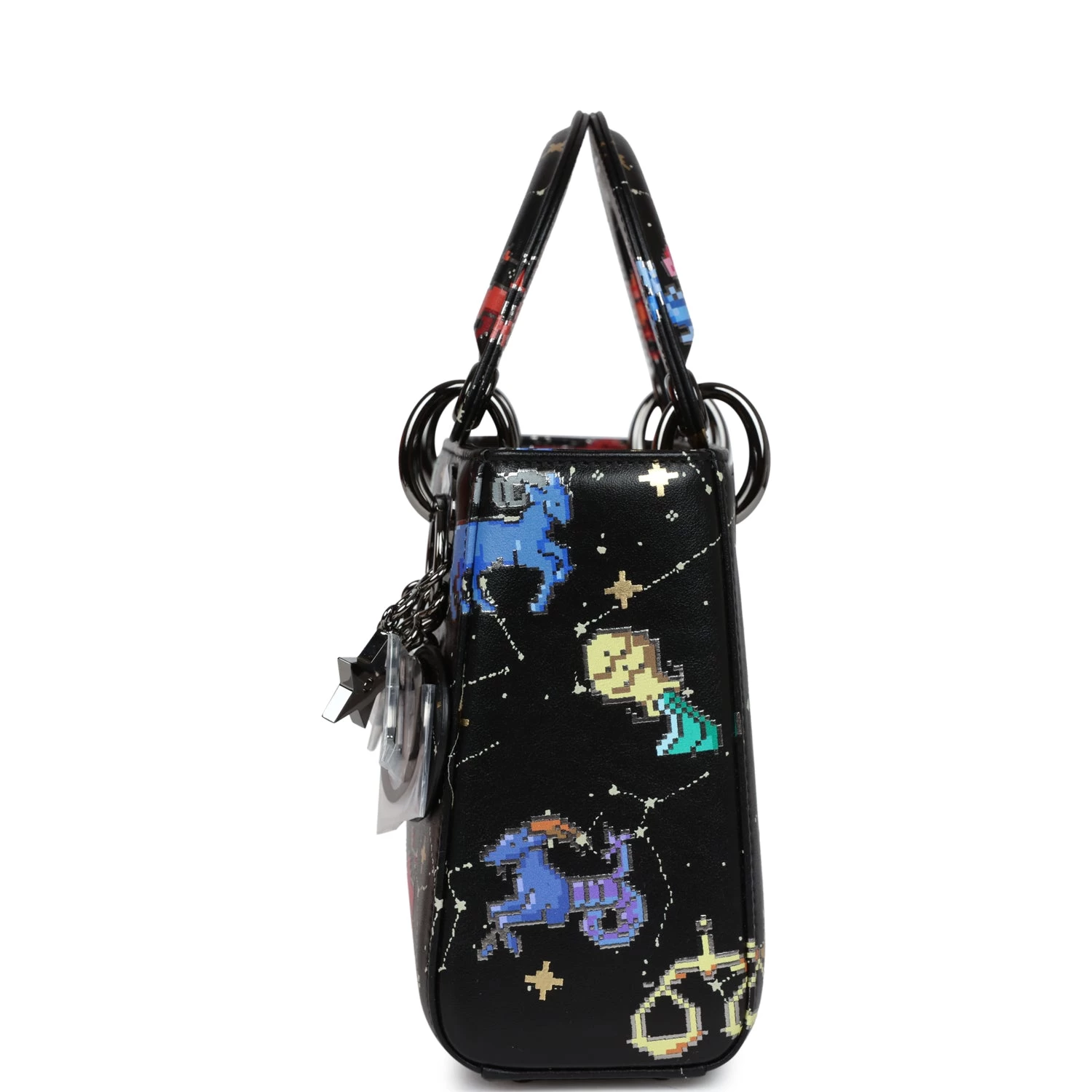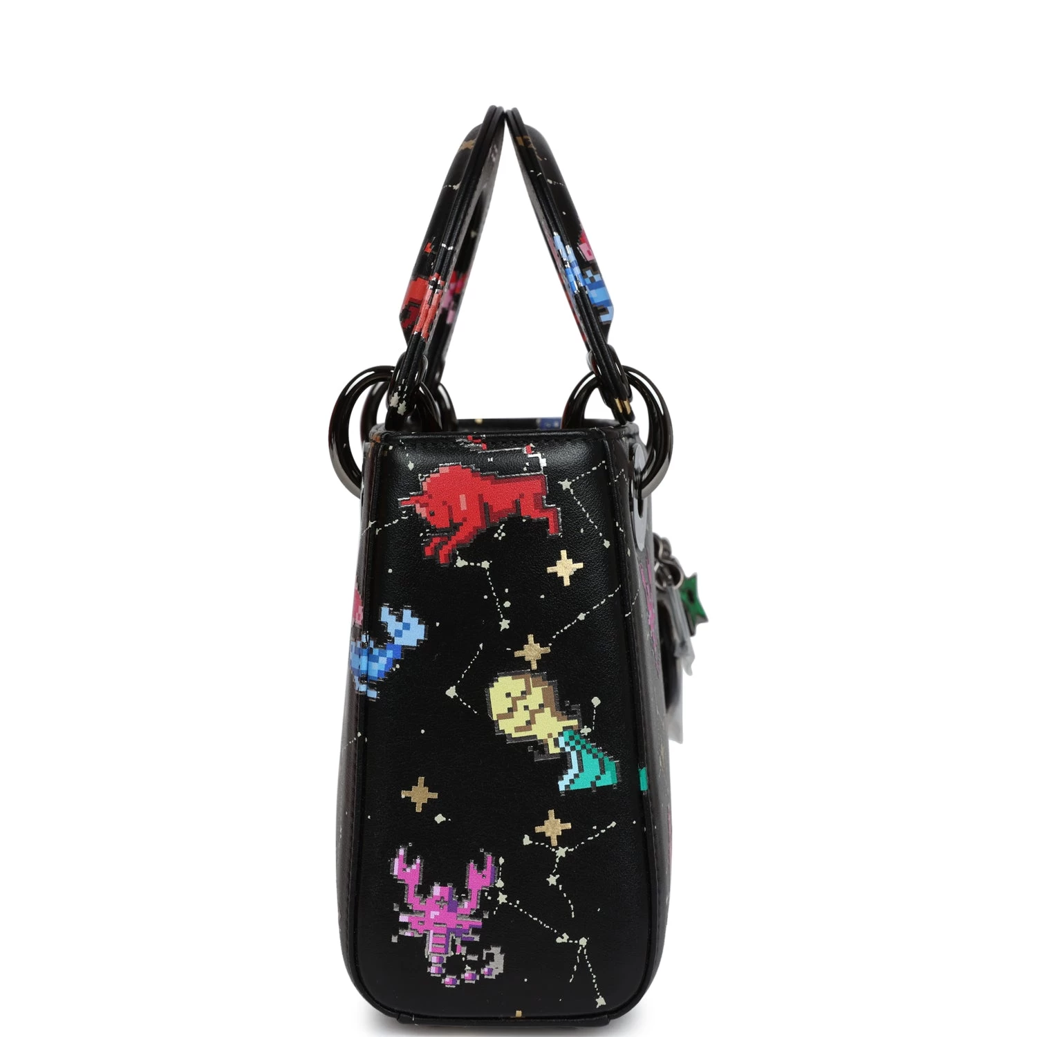 This Mini Limited Edition Zodiac Pixel Print Black Calfskin leather with Ruthenium Hardware, features tonal stitching, pixel Zodic printed leather, two top handles, Four ruthenium feet, Dior logo charm on front of bag, detachable shoulder strap.