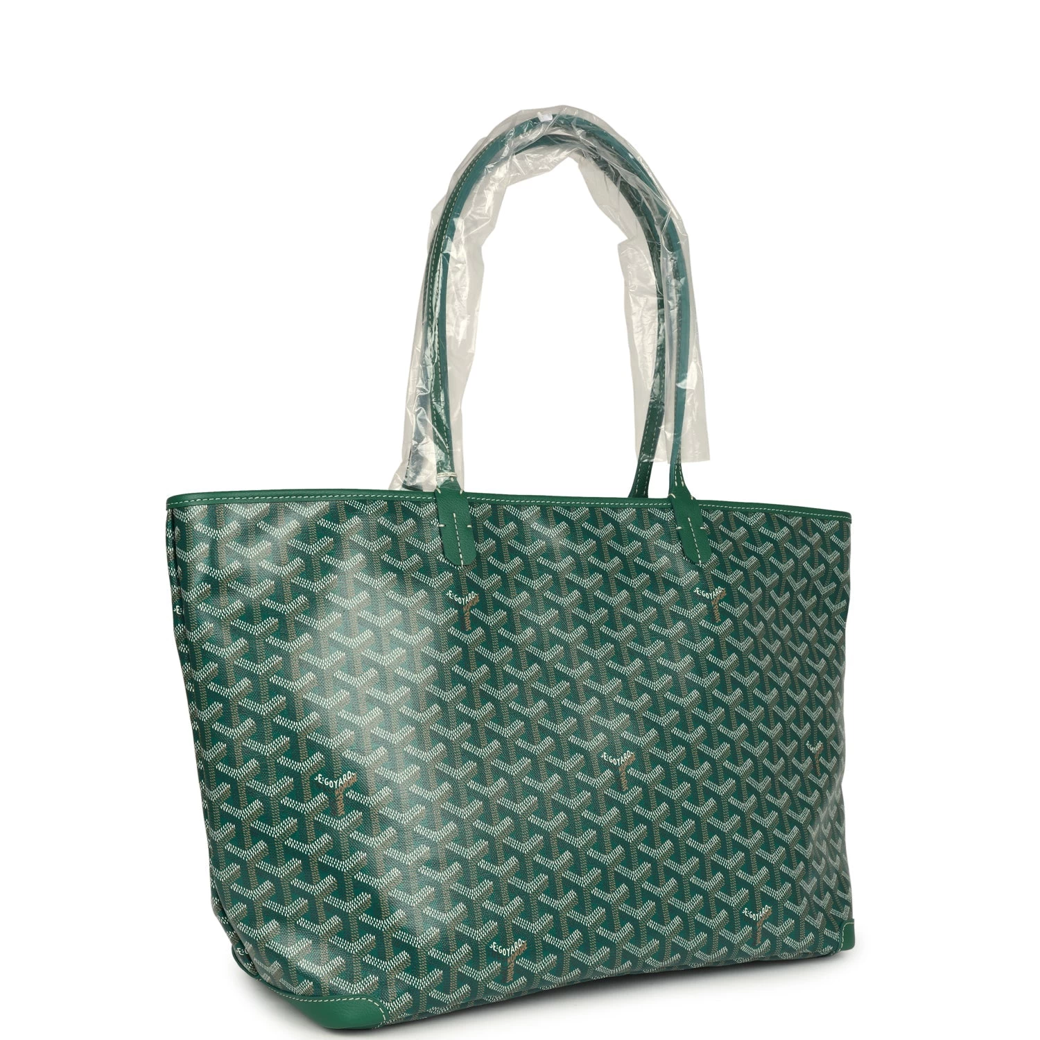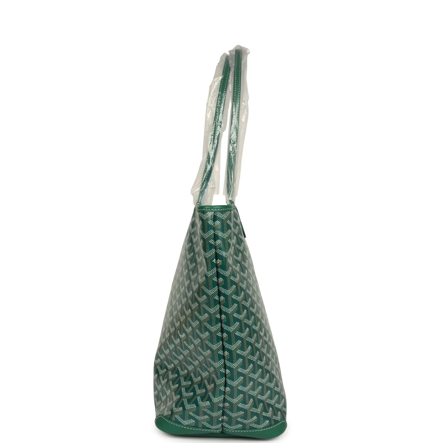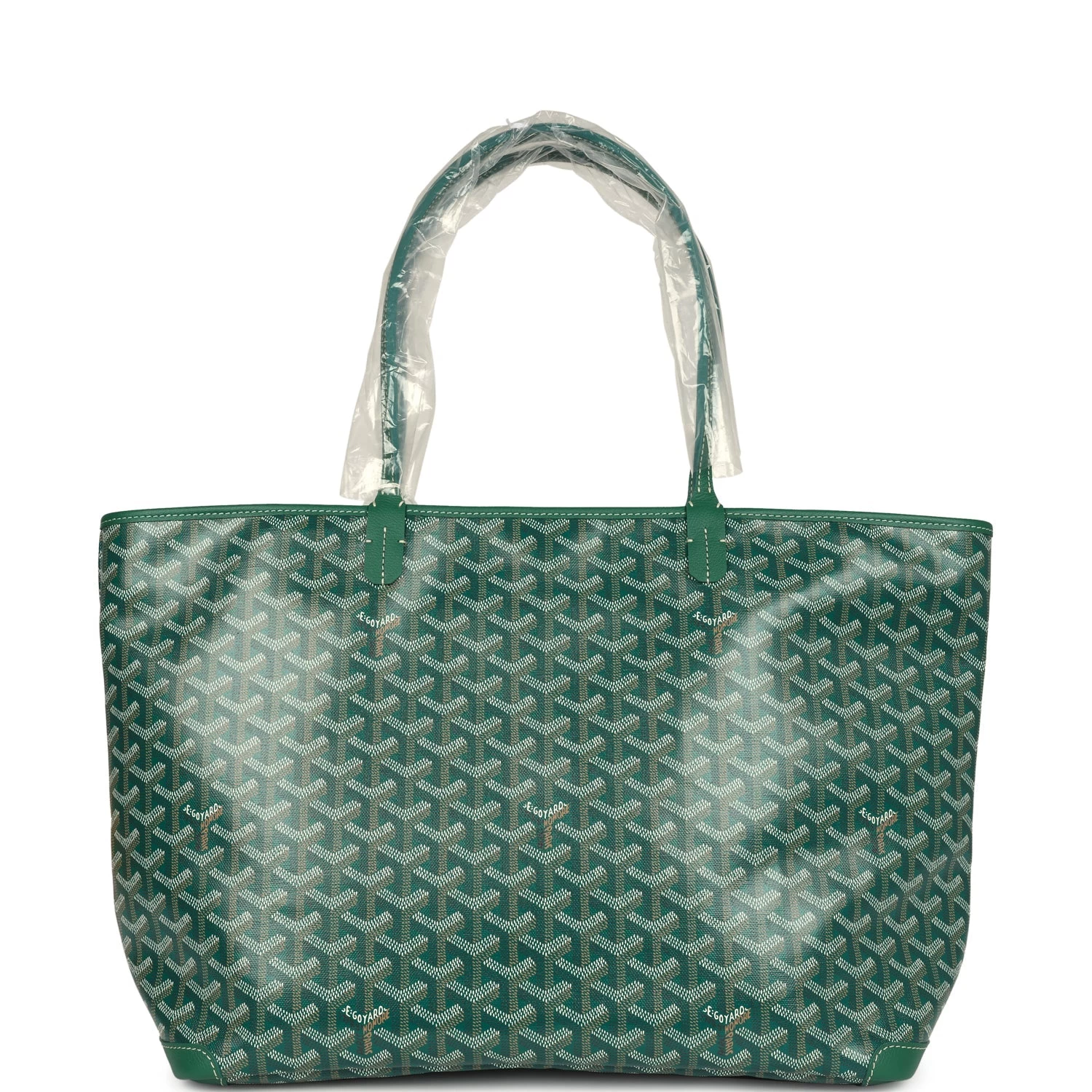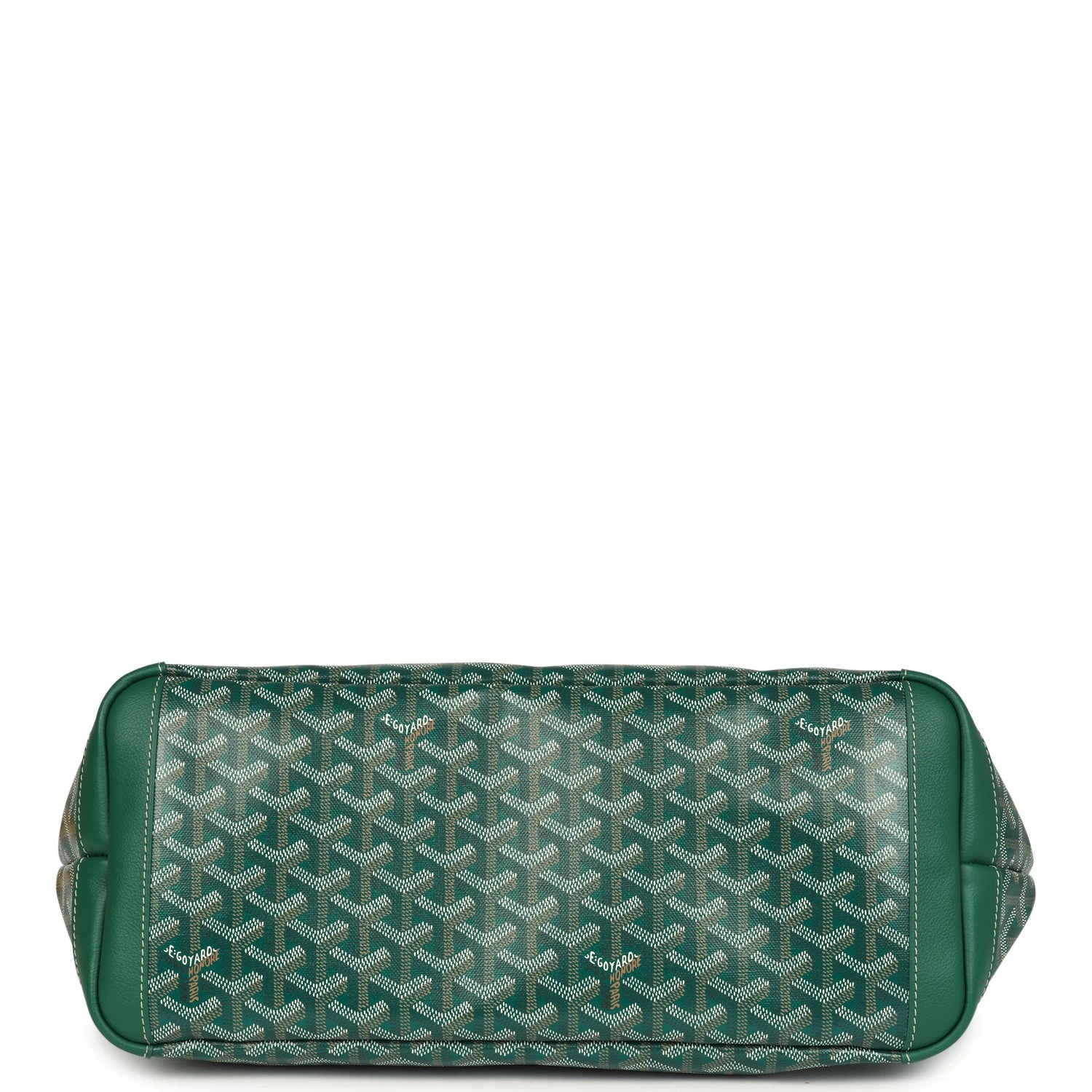 This Artois MM tote is of green Goyardine canvas and chevroches calfskin leather with palladium tone hardware, features contrast stitching, two flat green leather handles and a zip top closure.