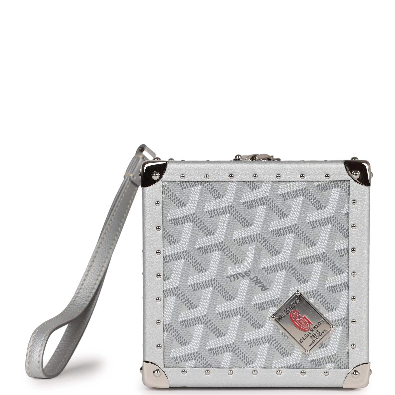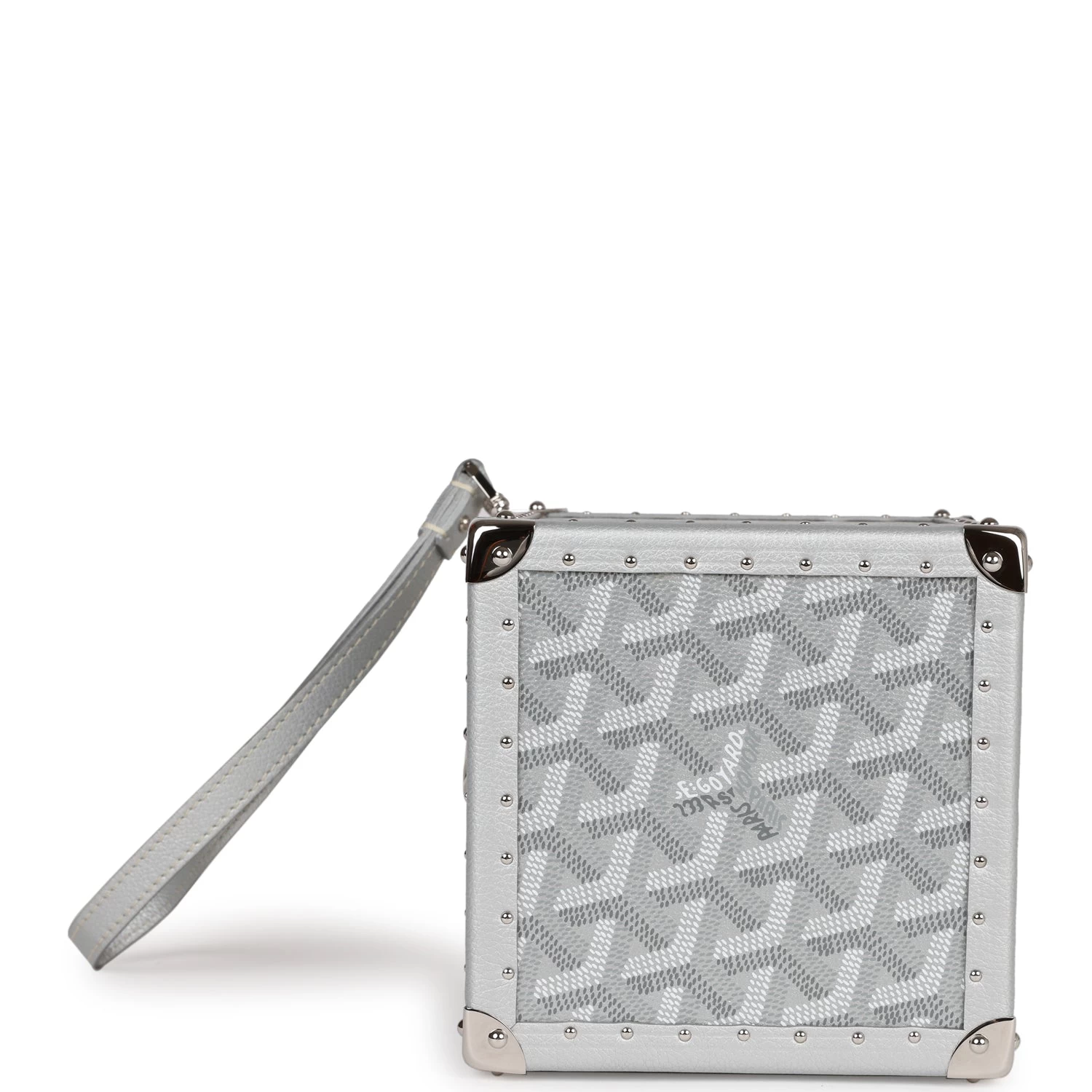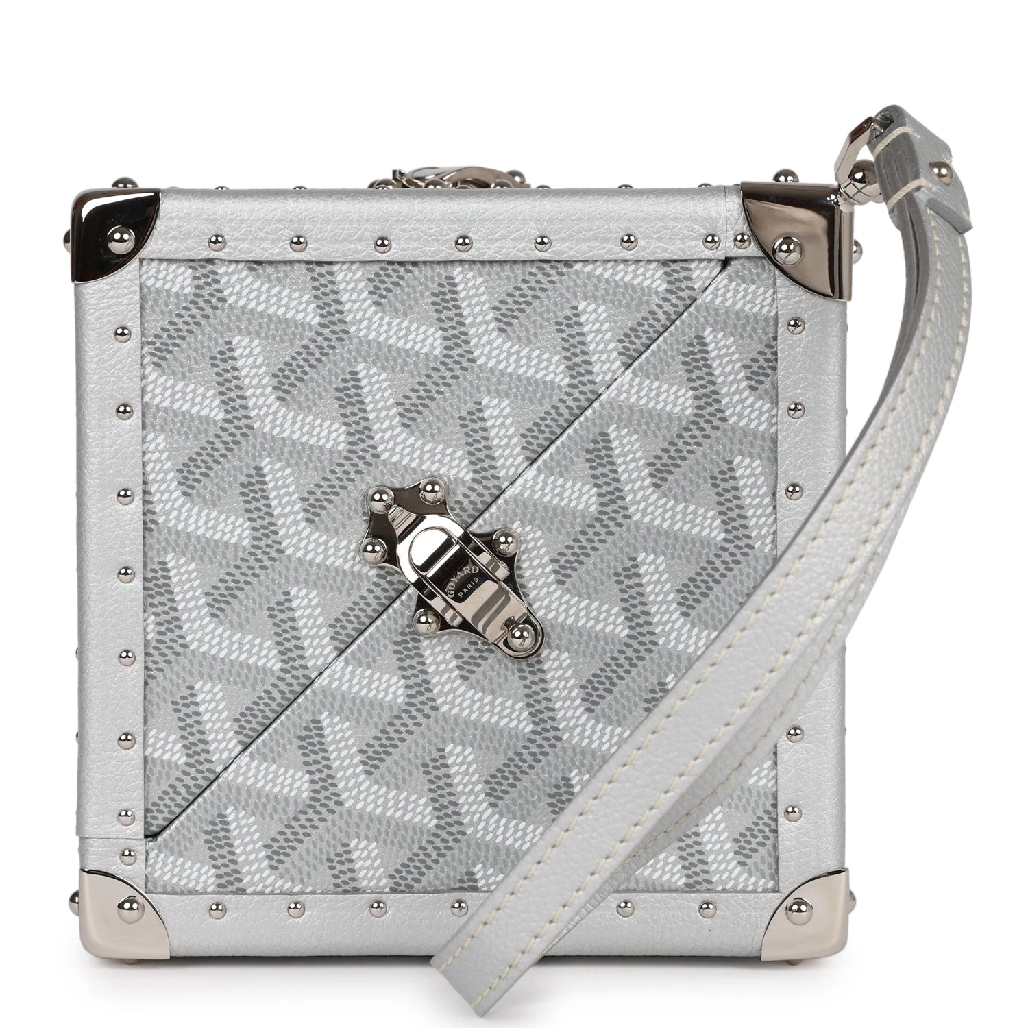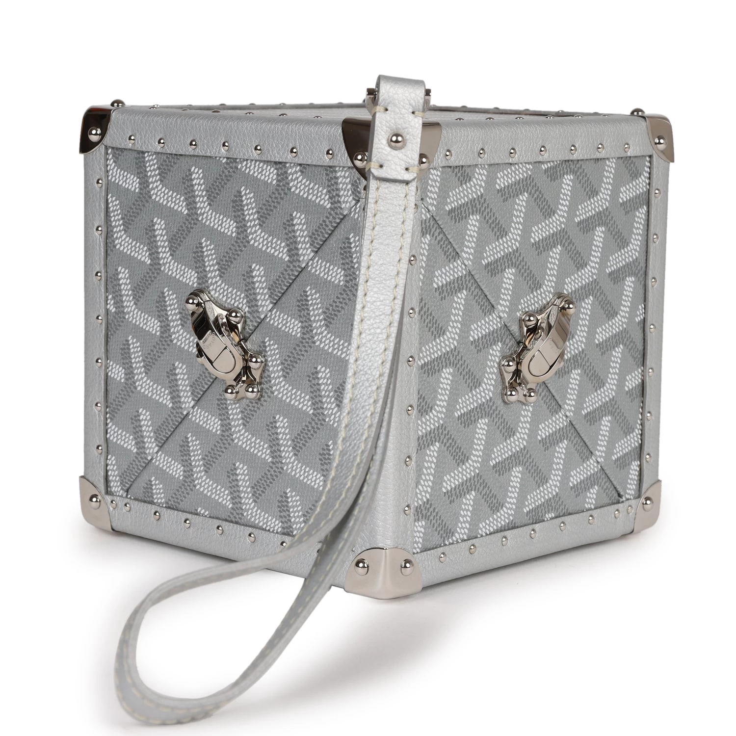 This limited edition Dé Trunk Bag is of metallic silver calfskin leather and goyardine canvas with palladium hardware and features double clasp closure, removable strap and tonal stitching.