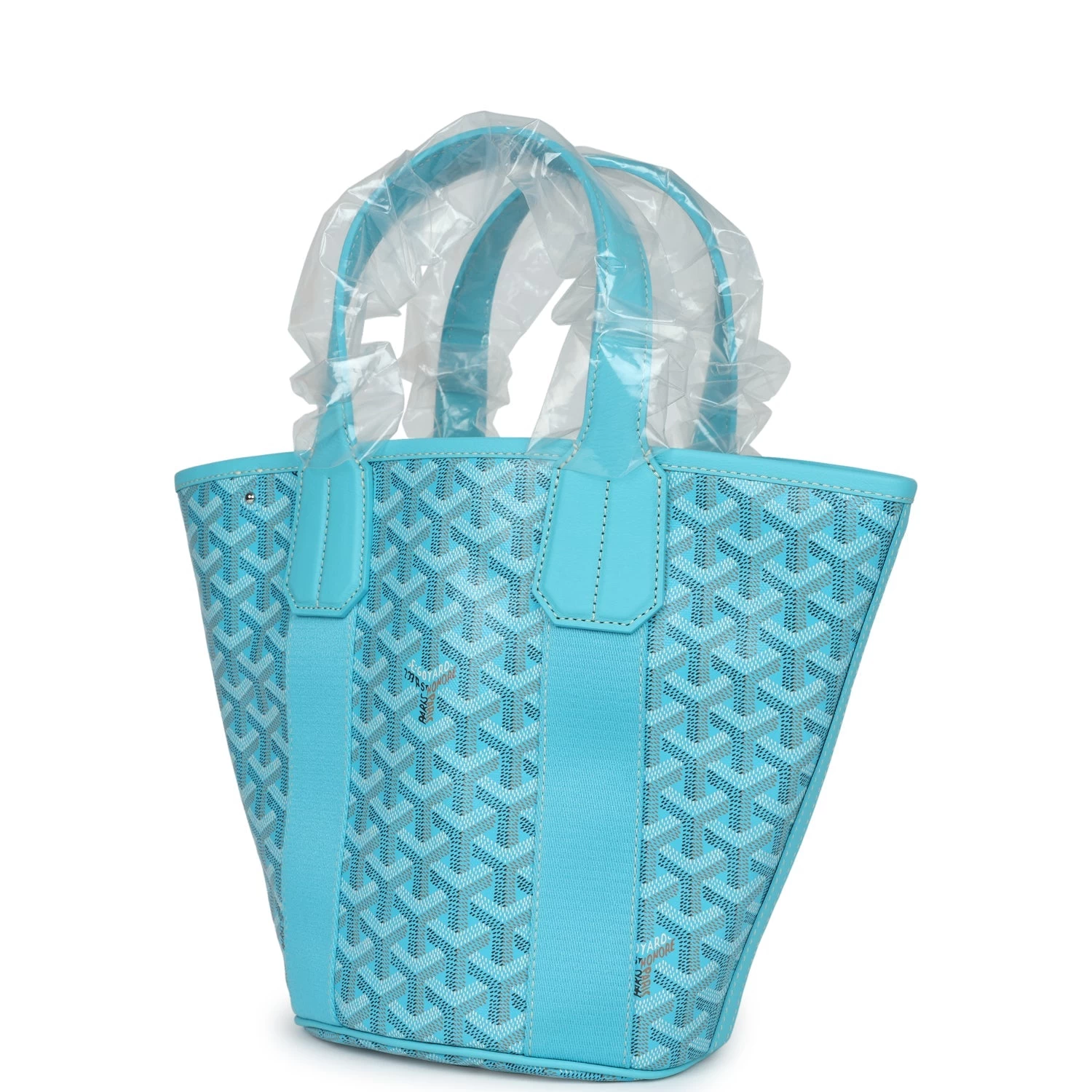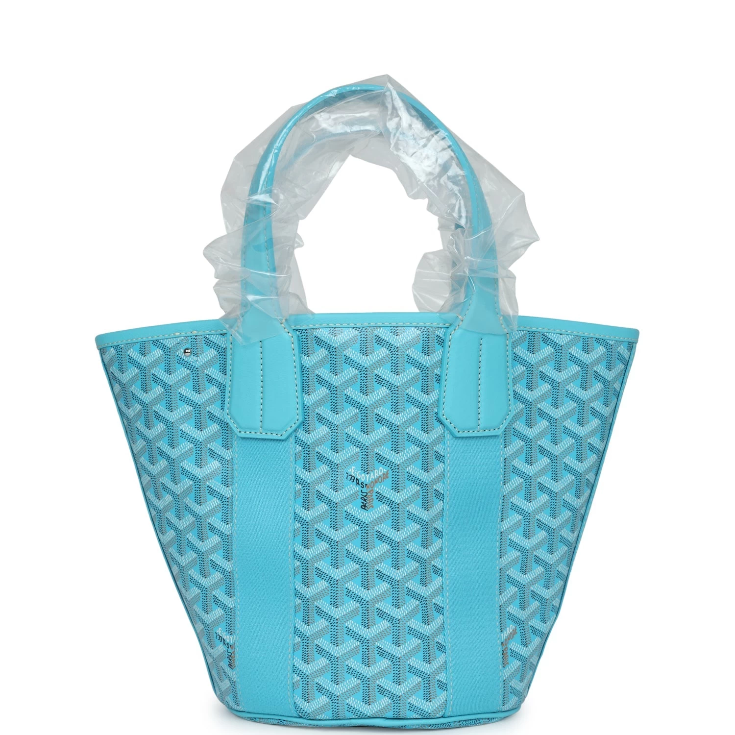 This Limited Edition Goyard Belharra Tote PM is of turquoise goyardine canvas and chevroches calfskin leather with palladium hardware, contrast stitching, features turquoise canvas trim down both sides of tote, two flat top handles, and a removable leather shoulder strap.
