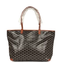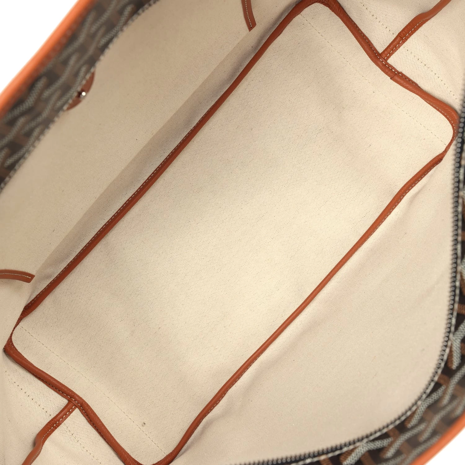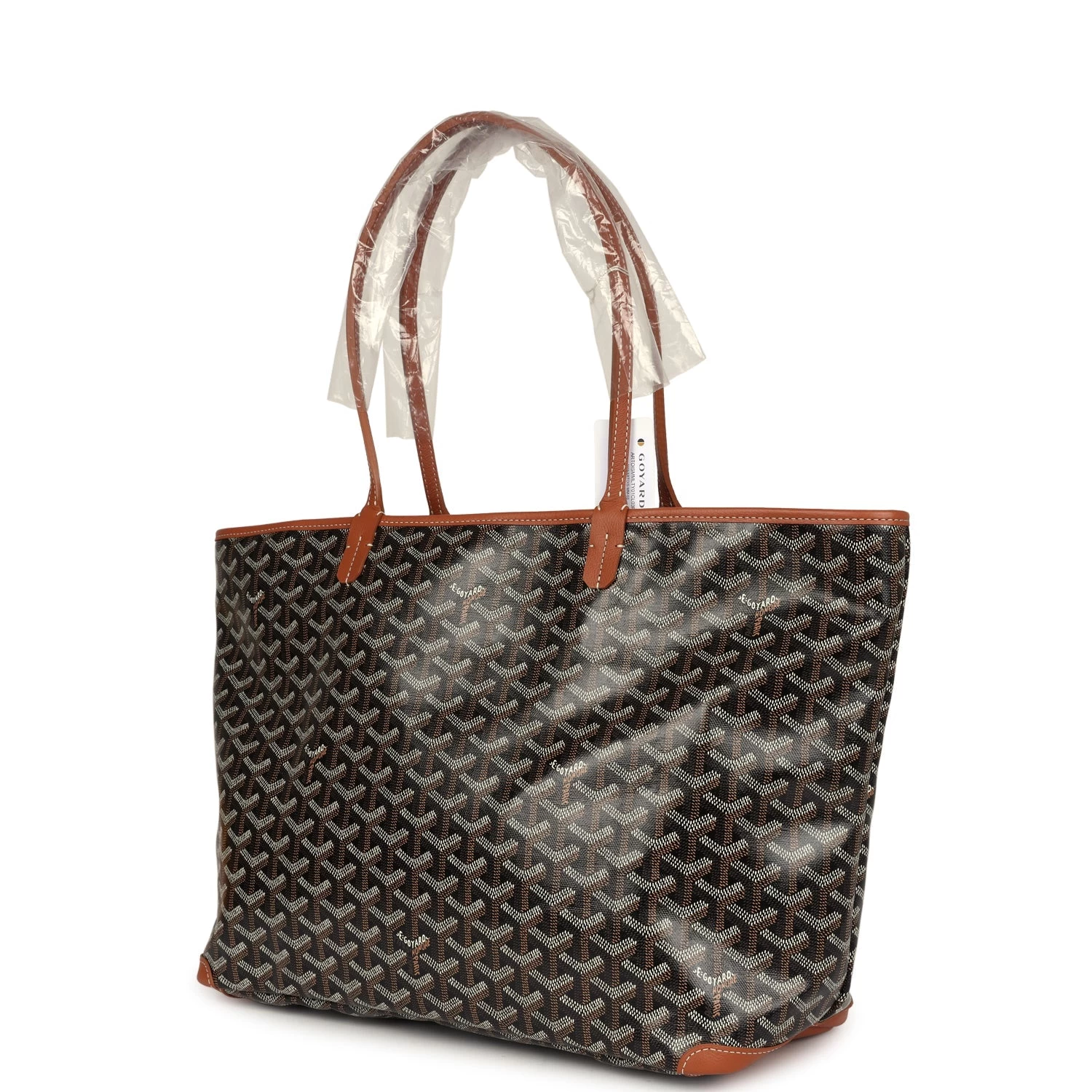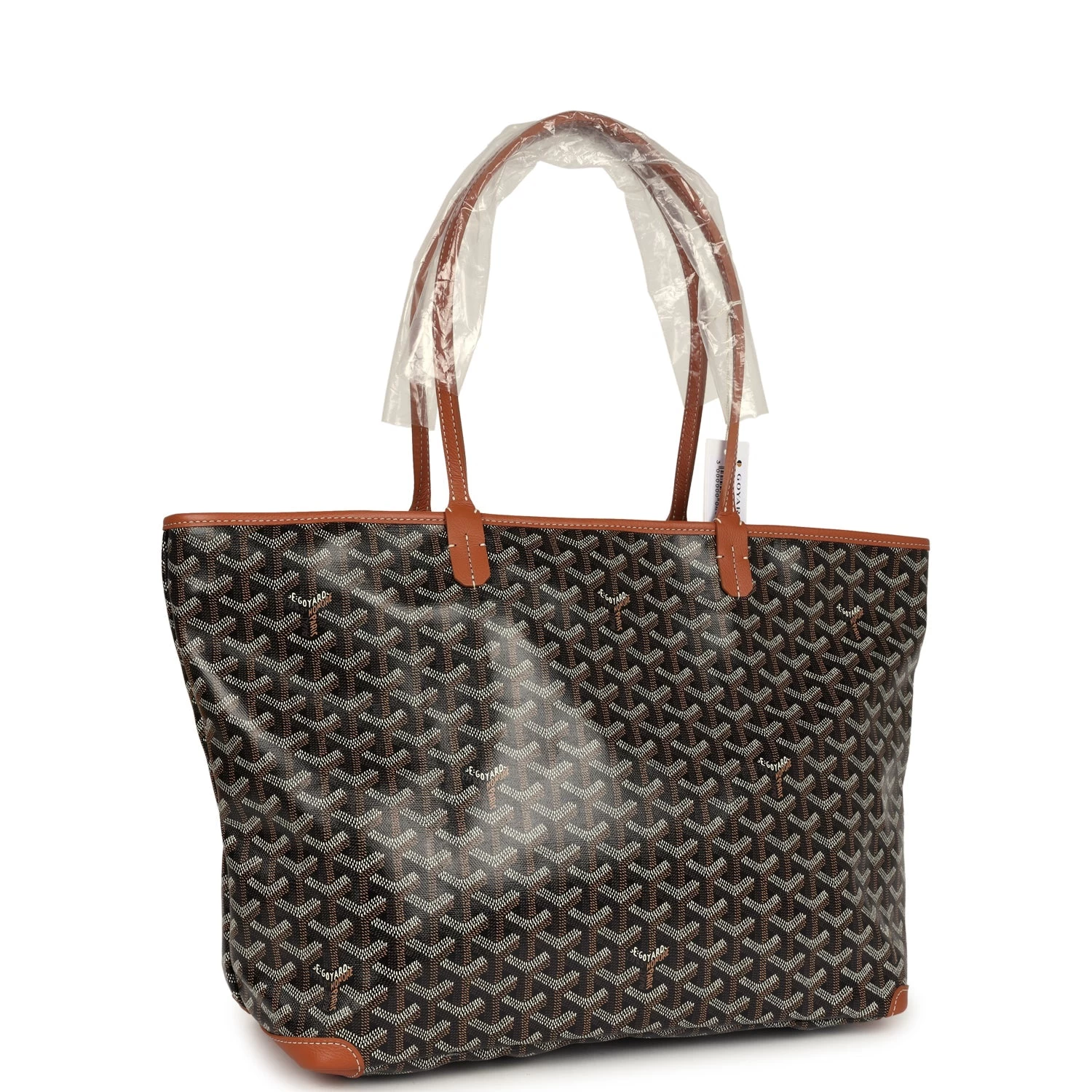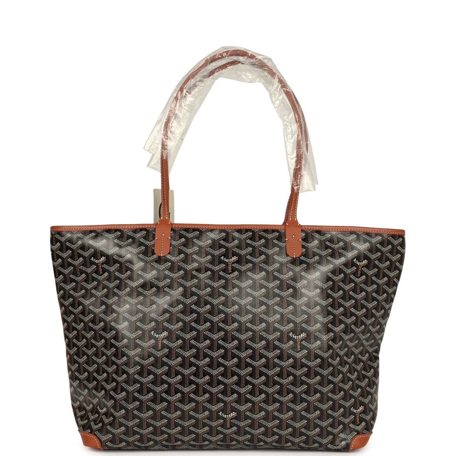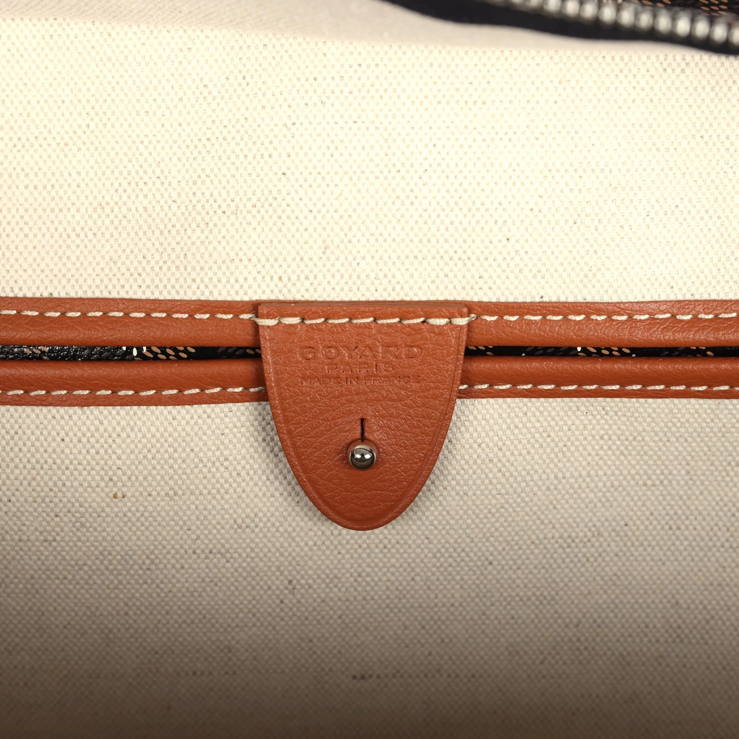 This Artois MM tote bag is in Black Goyardine canvas and Tan leather trim with palladium hardware and features tan leather handles and trim, tonal stitching, and top zip closure.