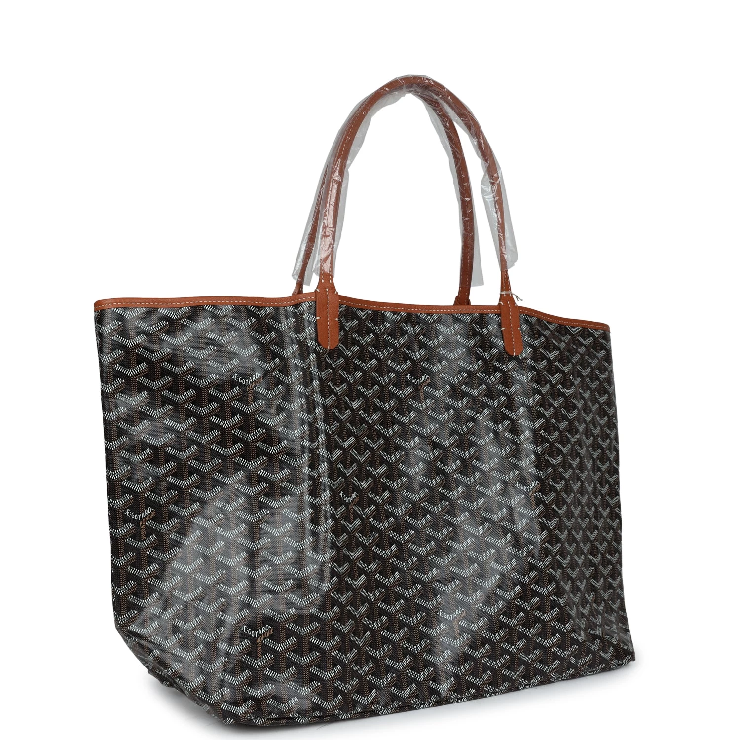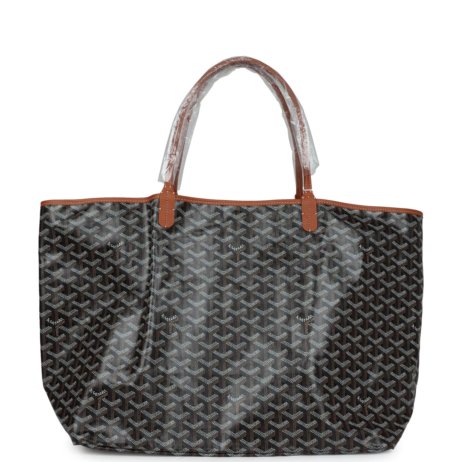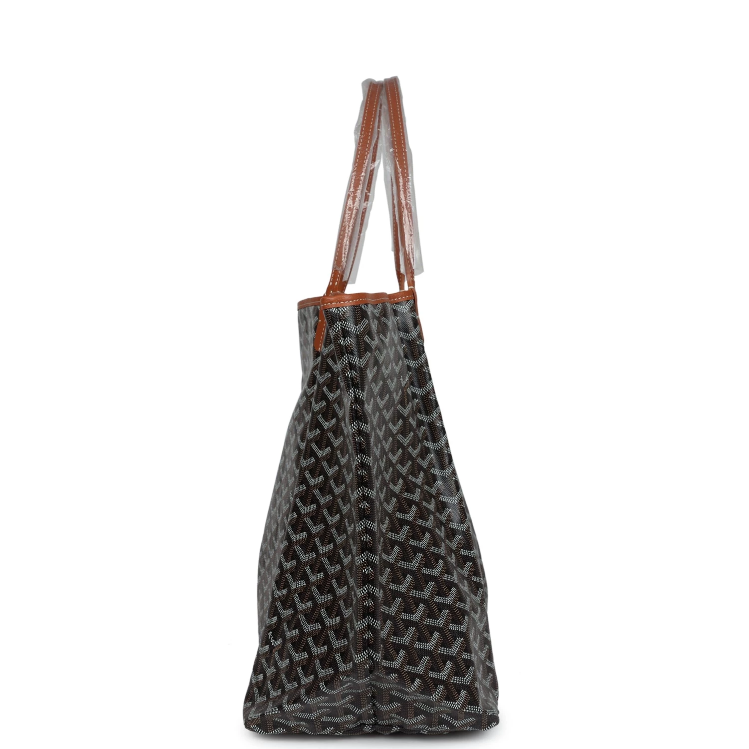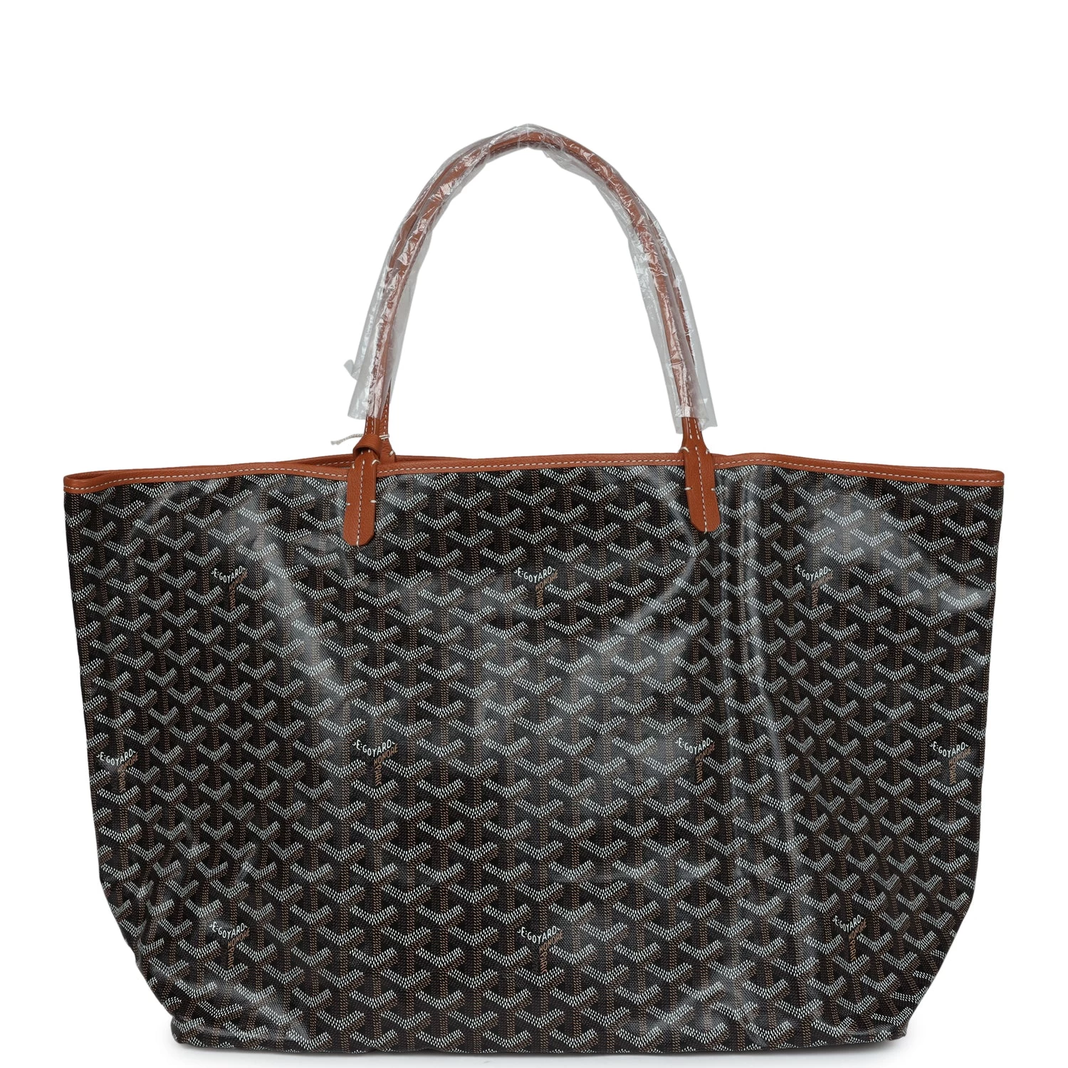 This Goyard Saint Louis GM is in Black Goyardine Canvas & Tan Chevroches Calfskin, has palladium hardware, contrast stitching, and a matching detachable button closure wallet