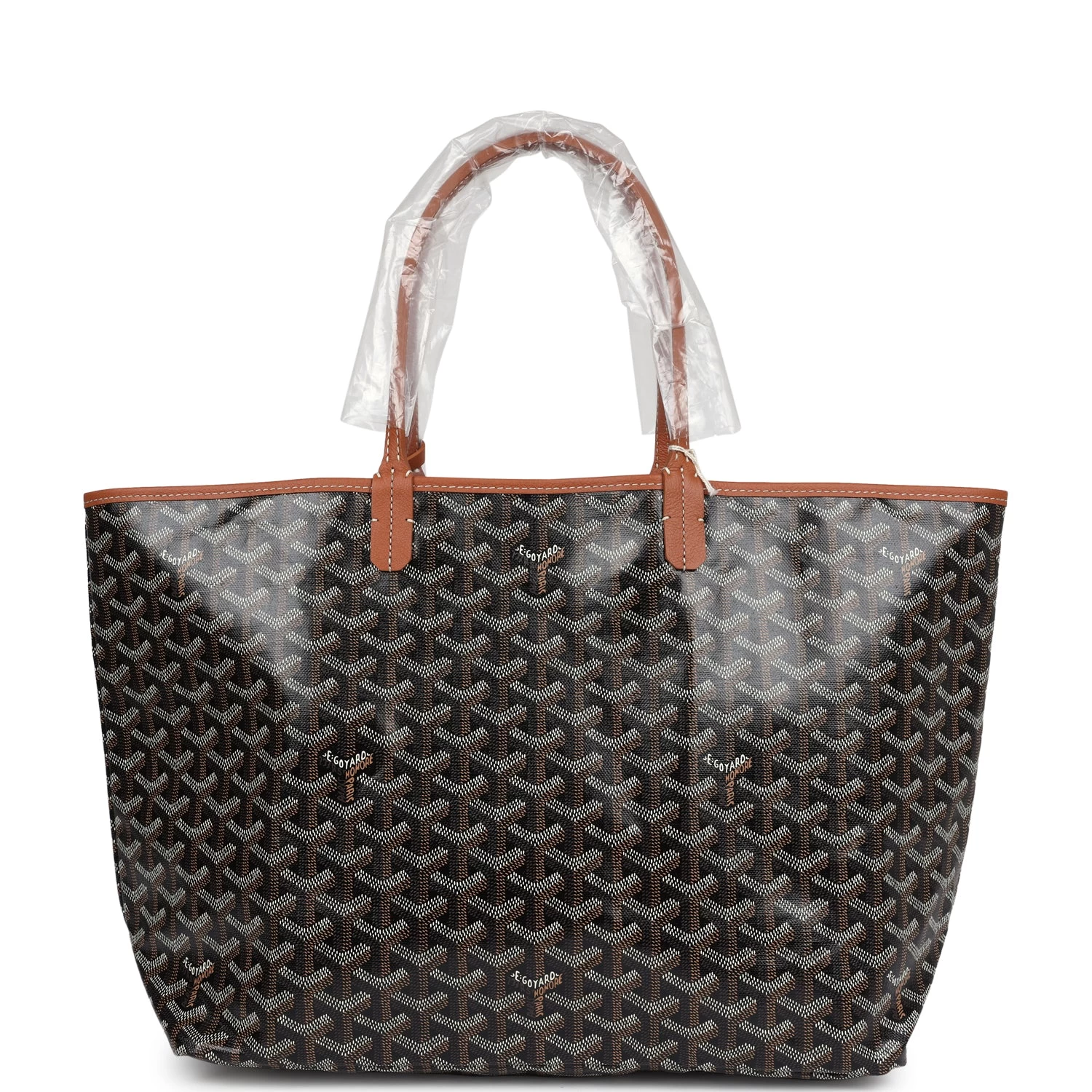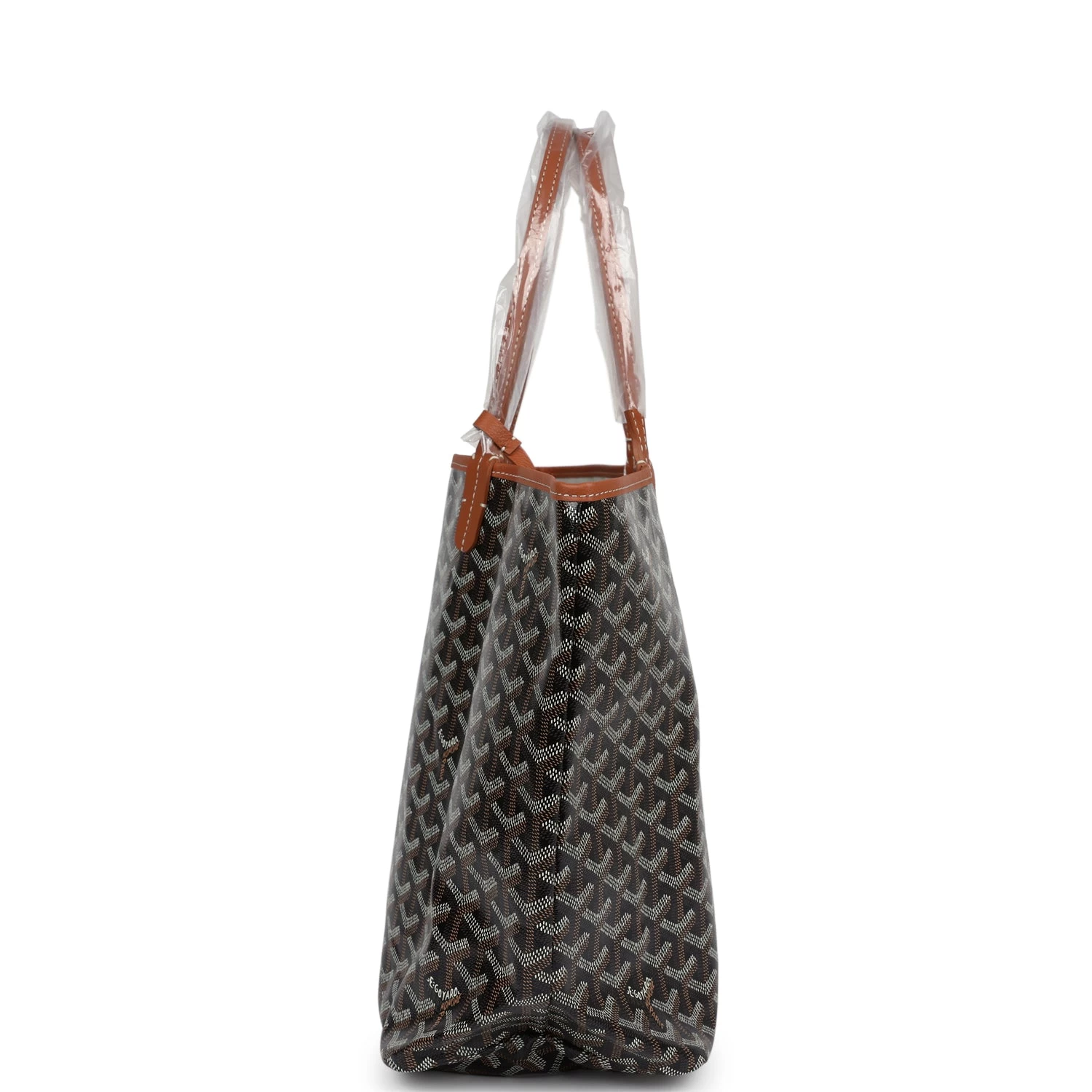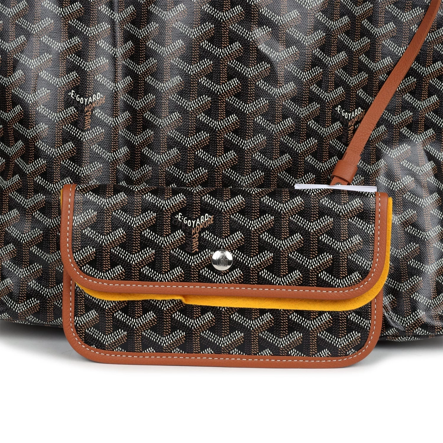 This Goyard Saint Louis PM bag is in black Goyardine canvas and tan chevroches calfskin, with palladium hardware, contrast stitching, and has a matching detachable button closure wallet.