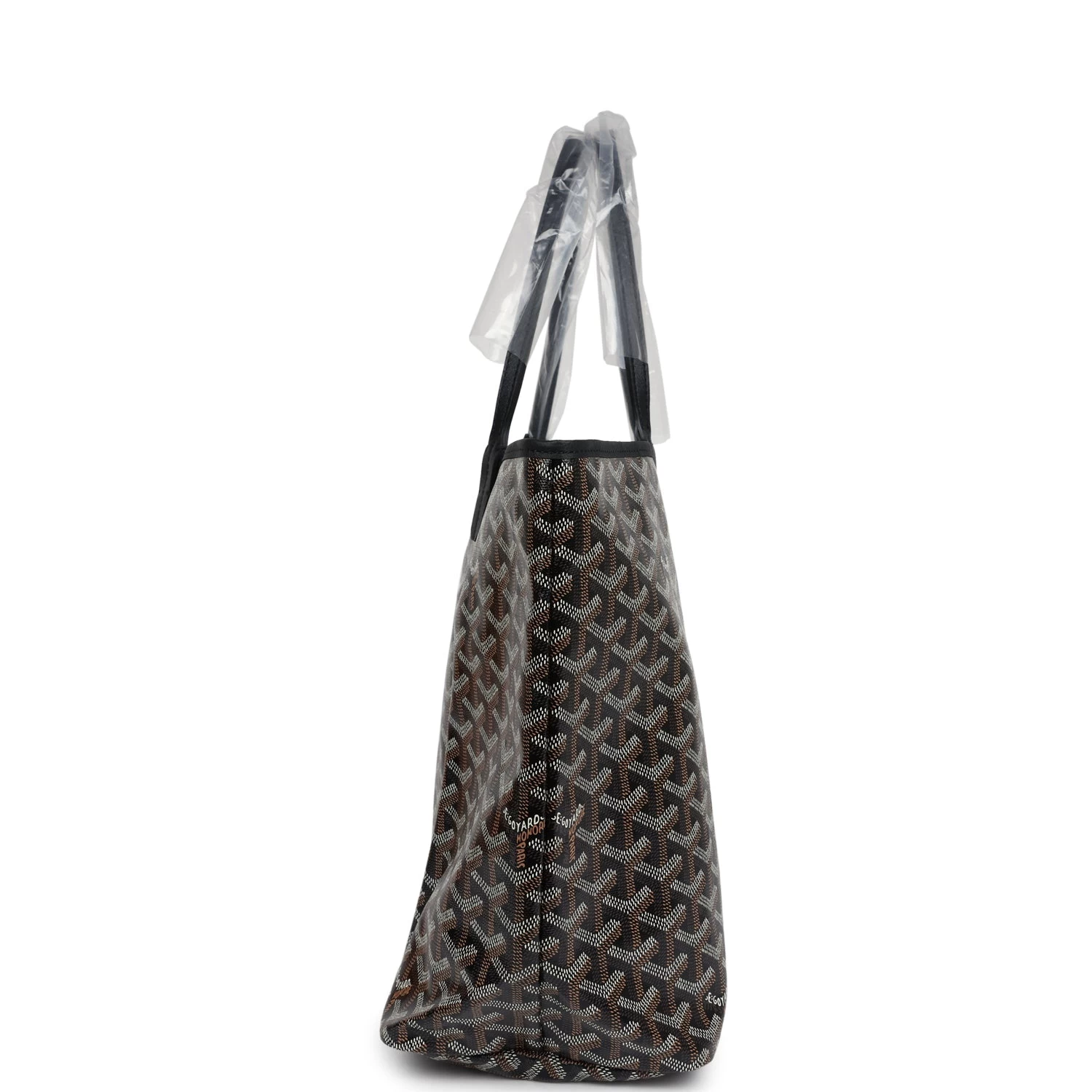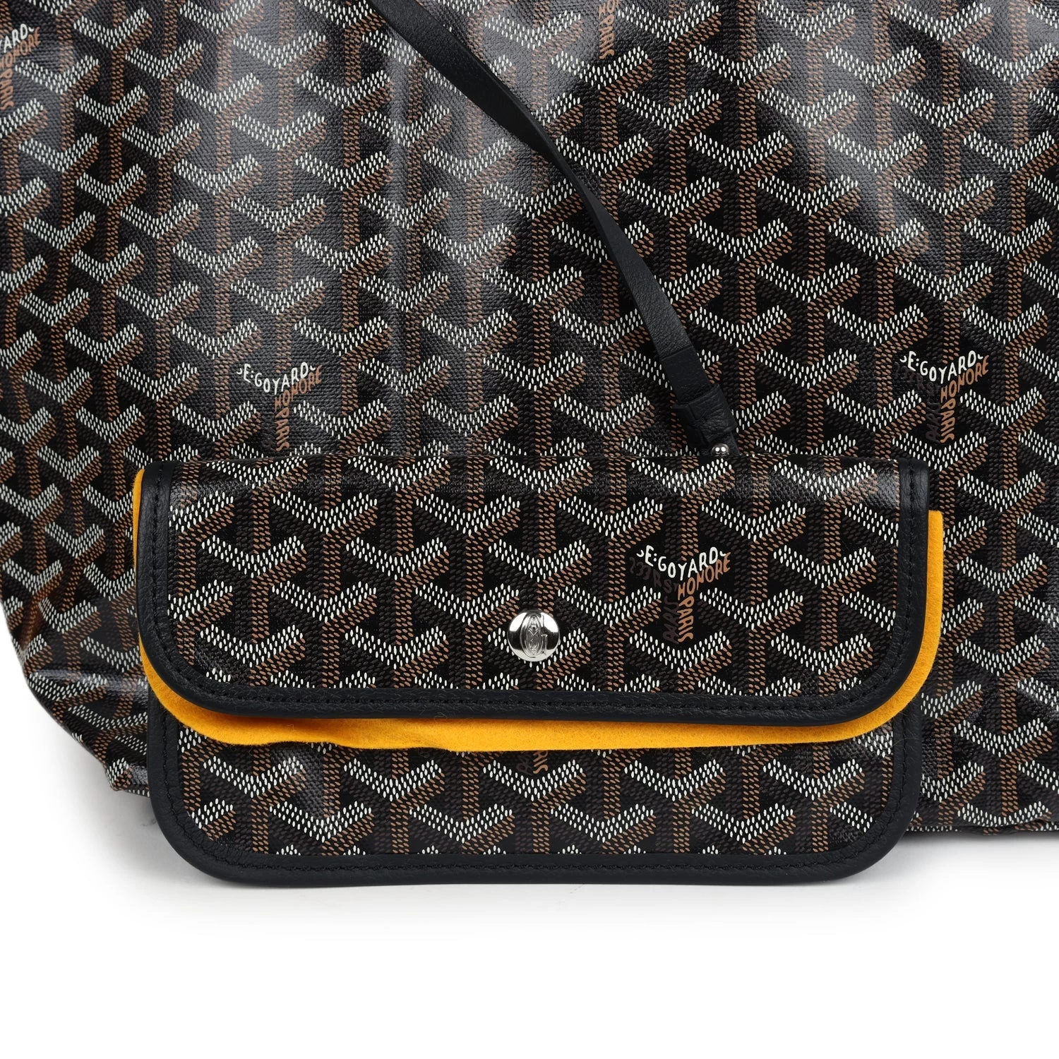 This Goyard Saint Louis PM bag is in black Goyardine canvas and black chevroches calfskin, with palladium hardware, tonal stitching, and has a matching detachable button closure wallet.