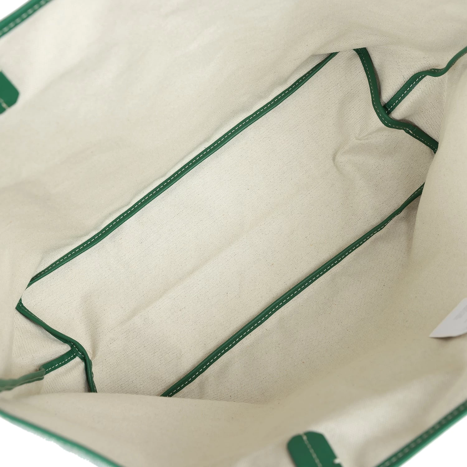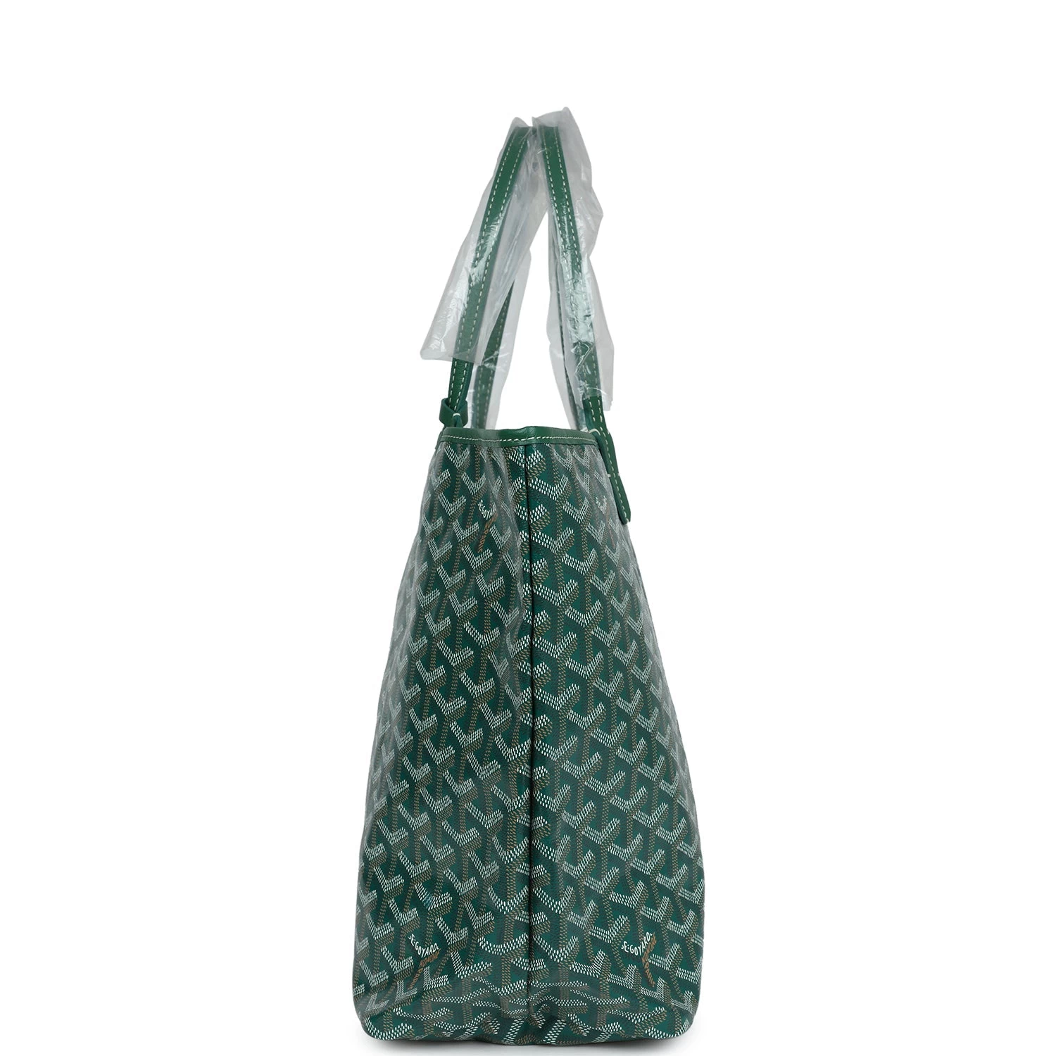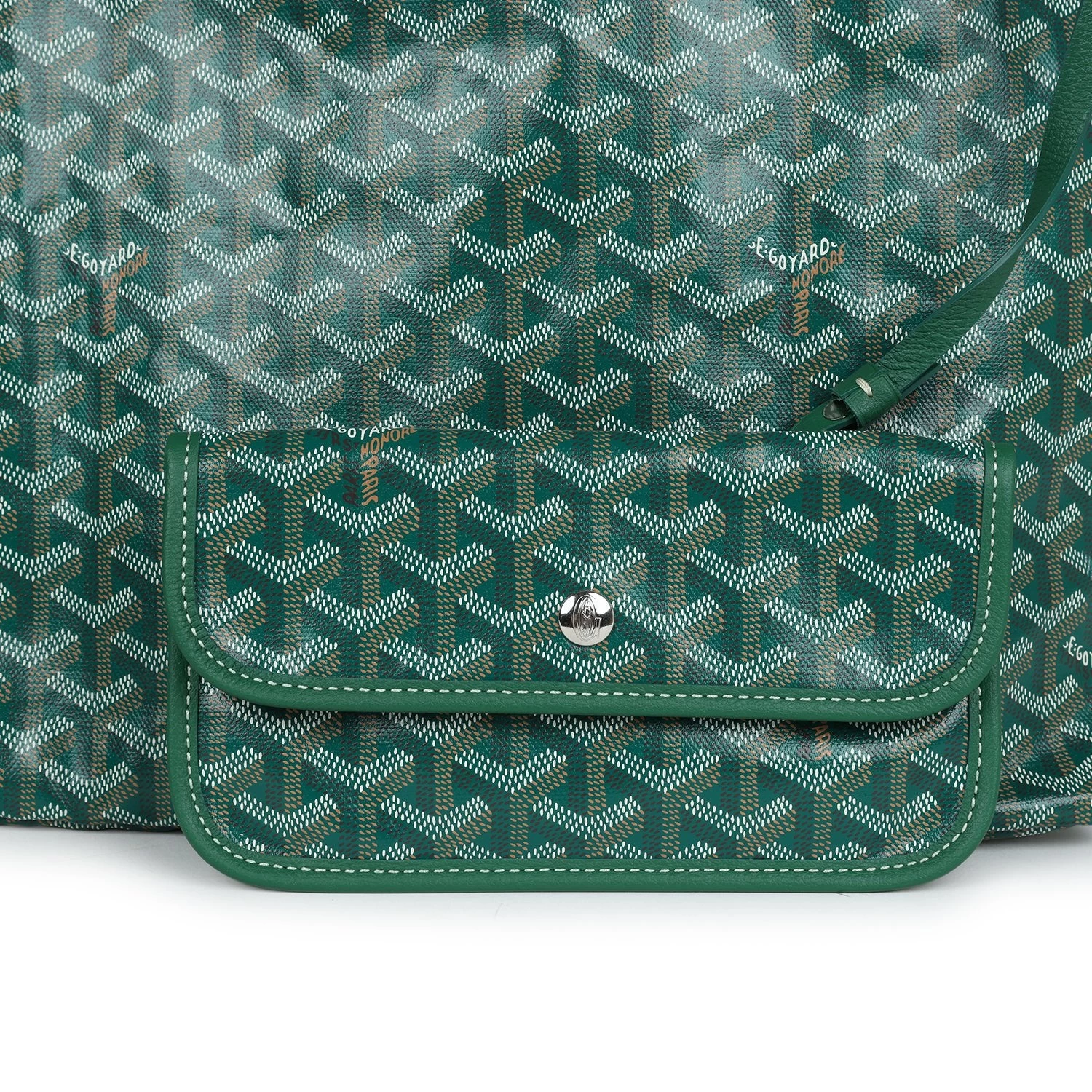 This St. Louis PM tote is of green Goyardine canvas with palladium hardware and features green leather handles and trim, removable pouch and white stitching.