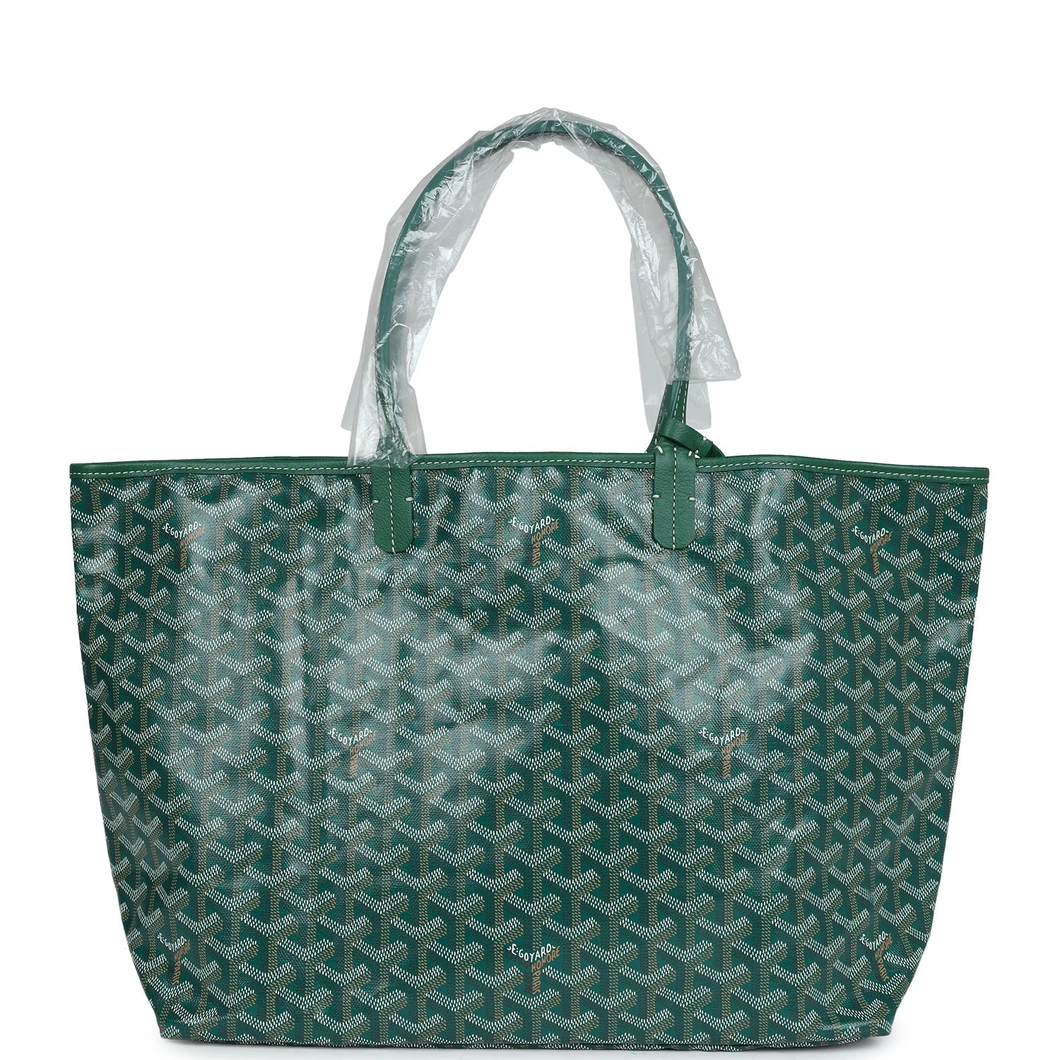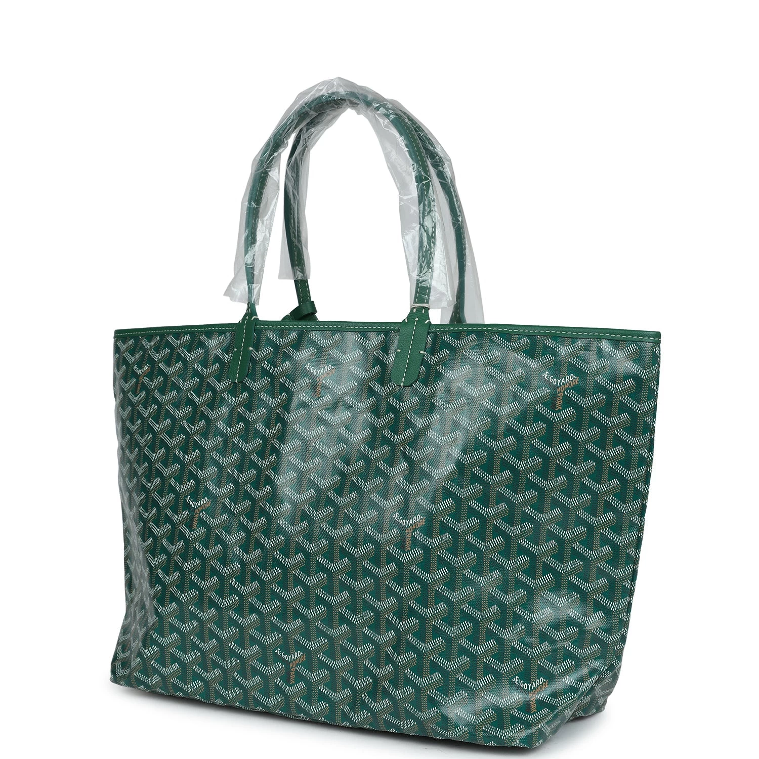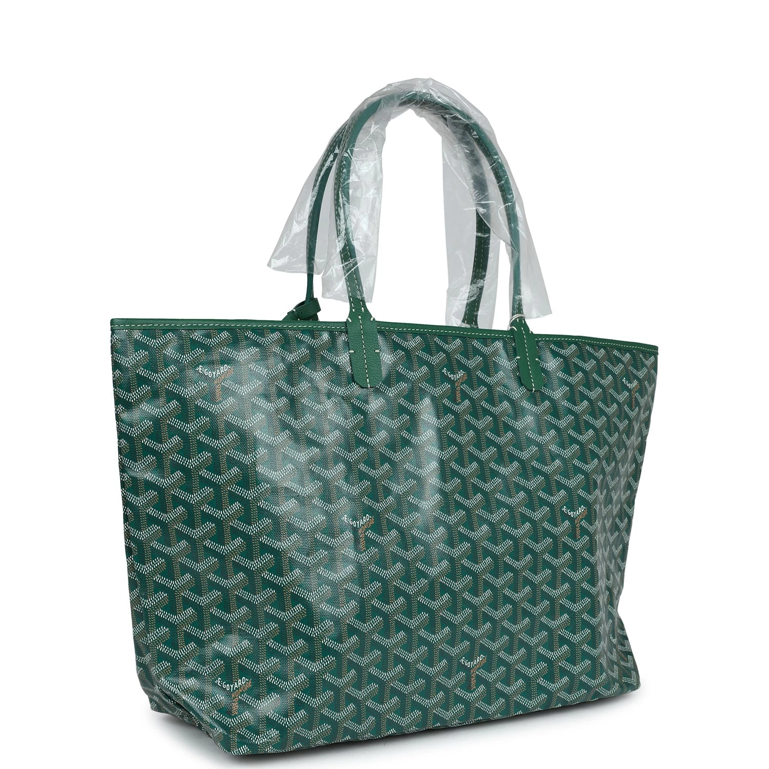 This St. Louis PM tote is of green Goyardine canvas with palladium hardware and features green leather handles and trim, removable pouch and white stitching.