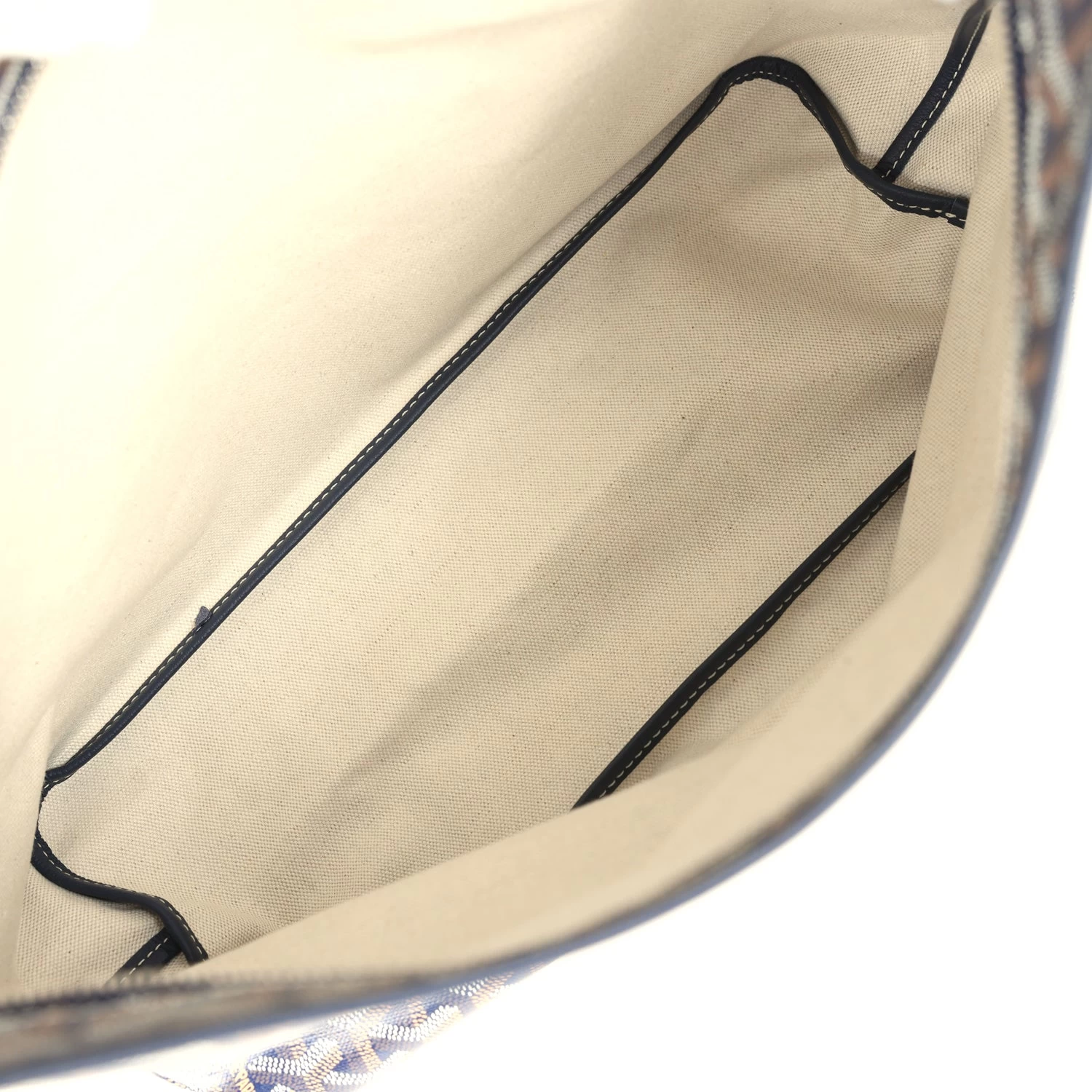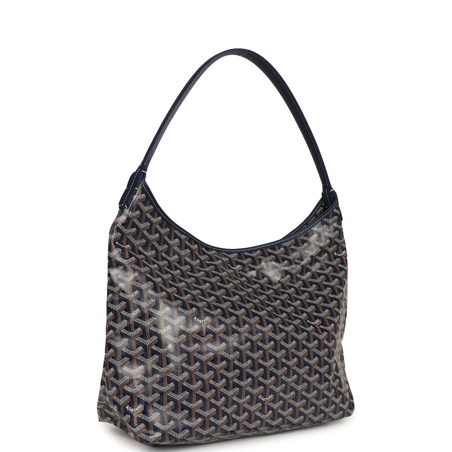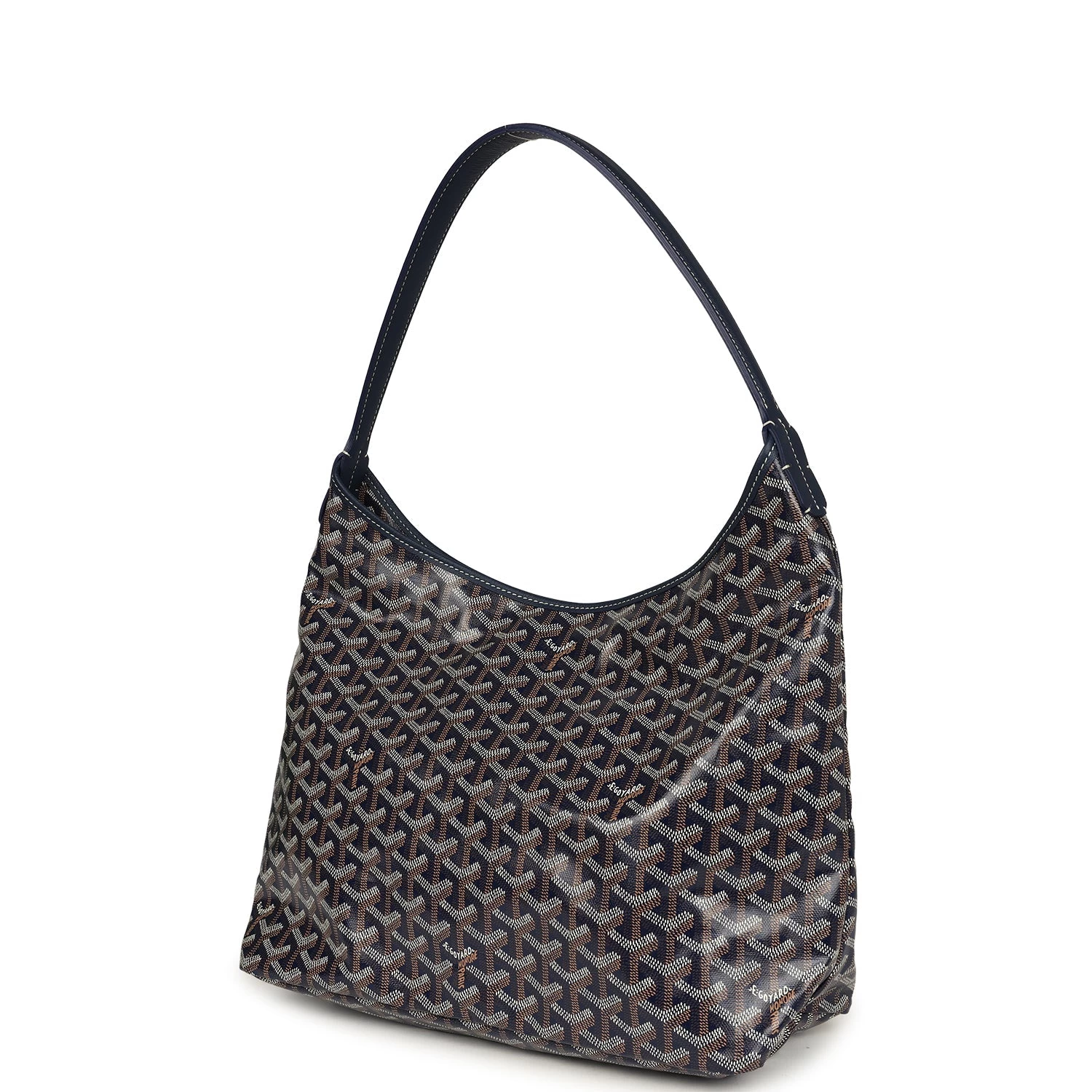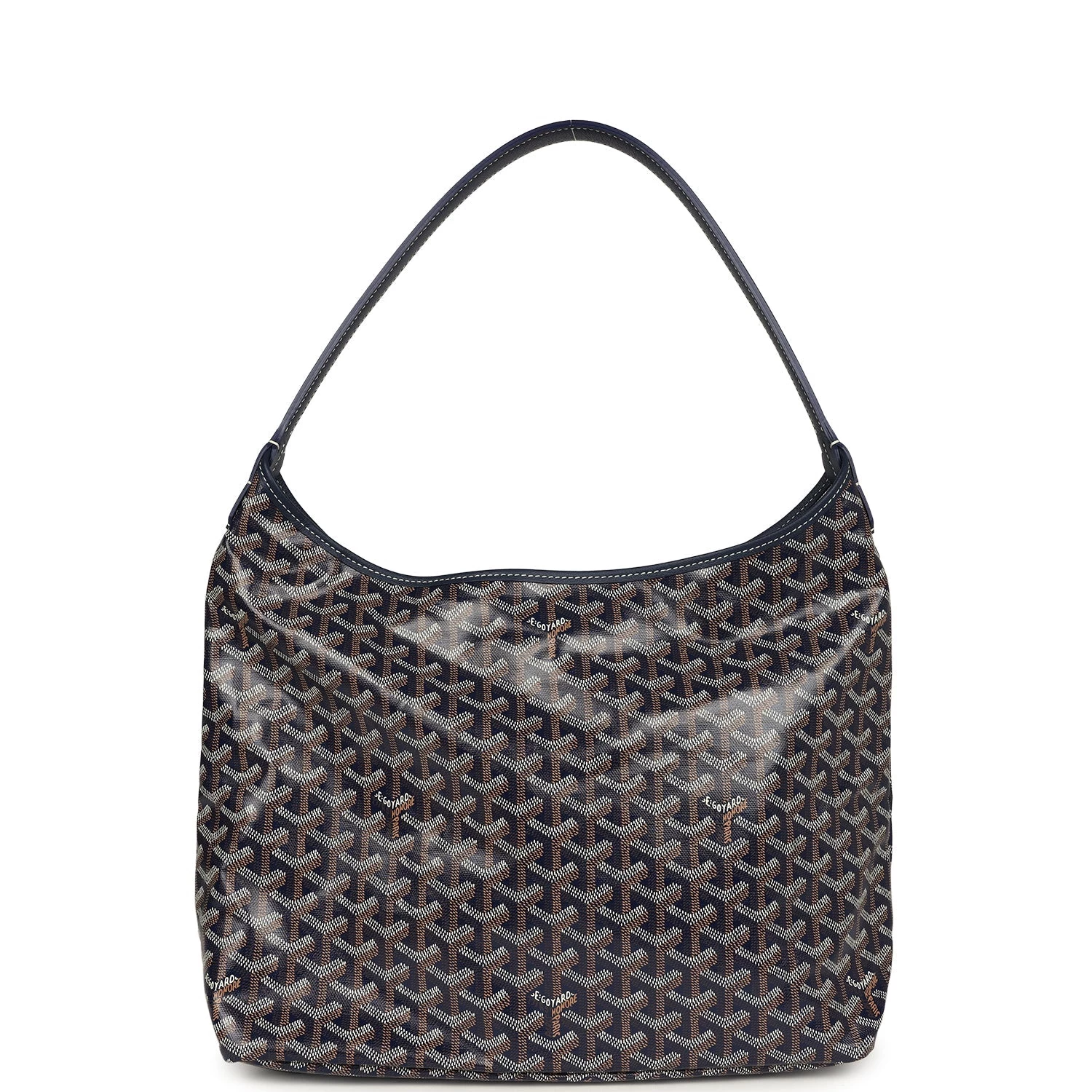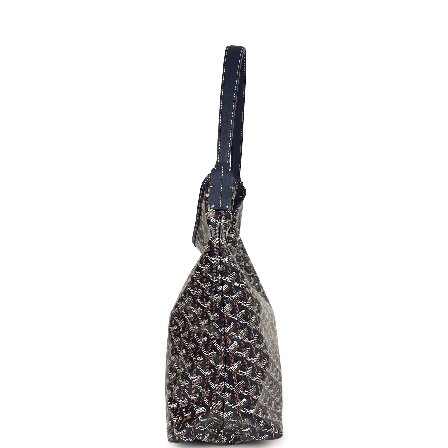 This Boheme Hobo bag is in navy goyardine canvas with palladium hardware, white contrast stitching, chevroches calfskin lining, a zip closure, a detachable pouch, and a shoulder strap.