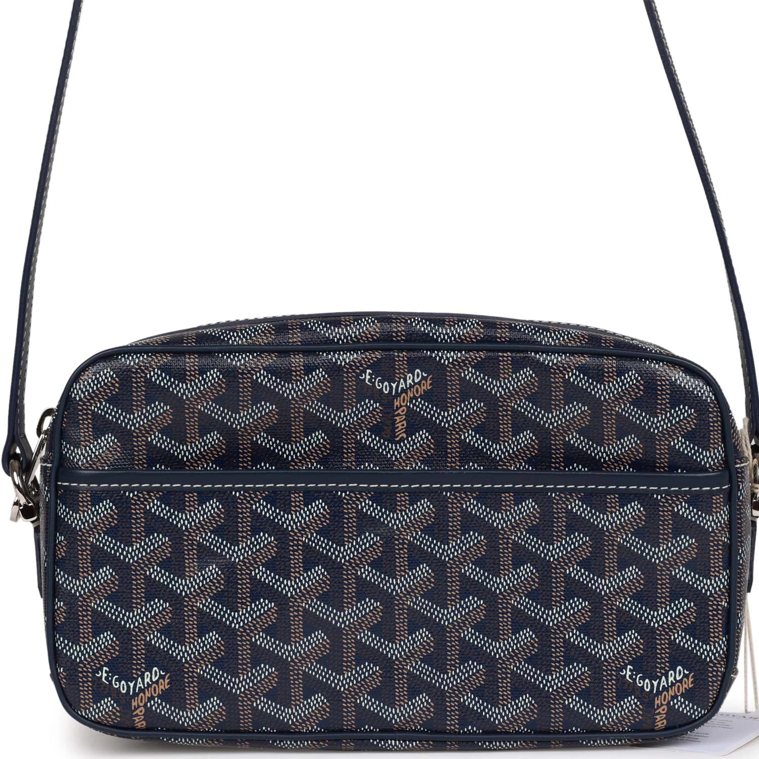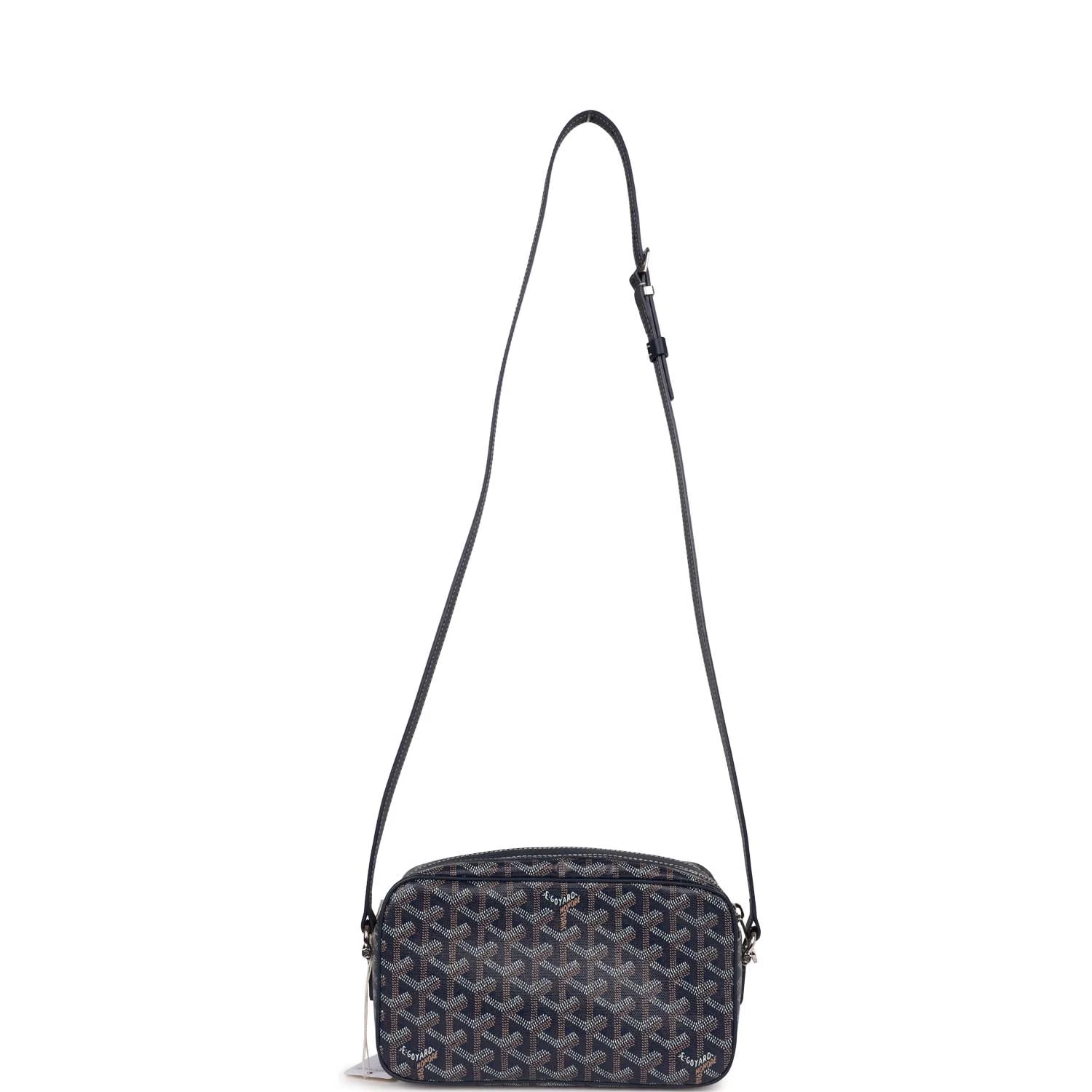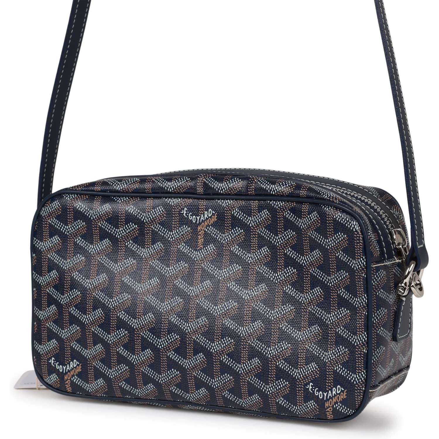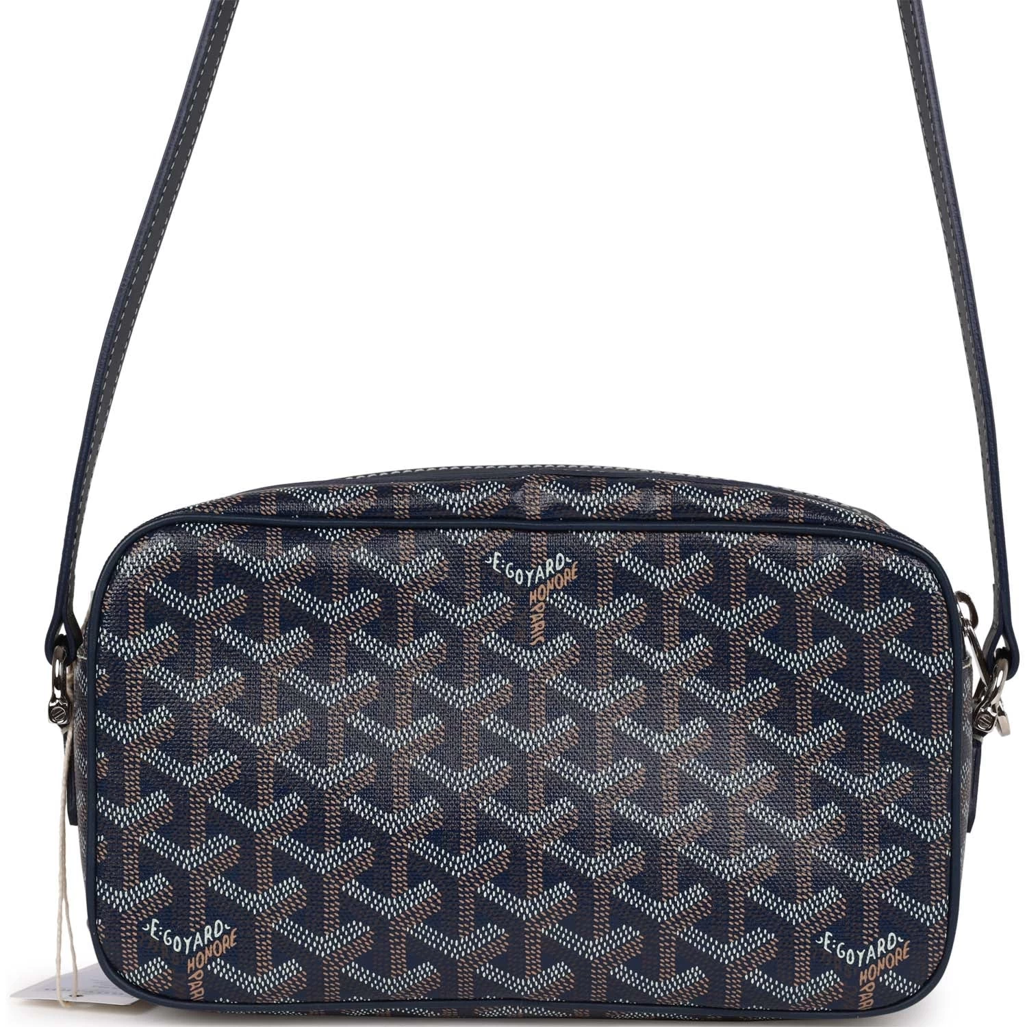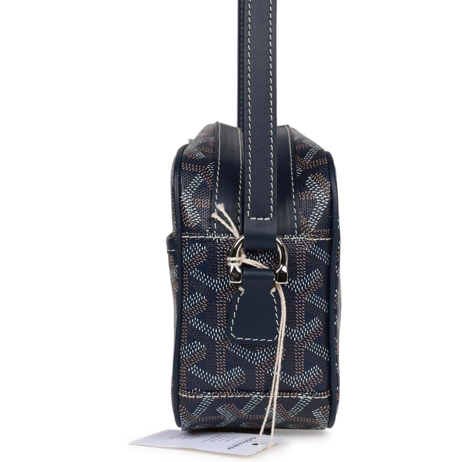 This Cap Vert PM bag is of Navy Goyardine canvas and leather with silver tone hardware and features a navy leather strap and trim, flat front exterior pocket, and white stitching.