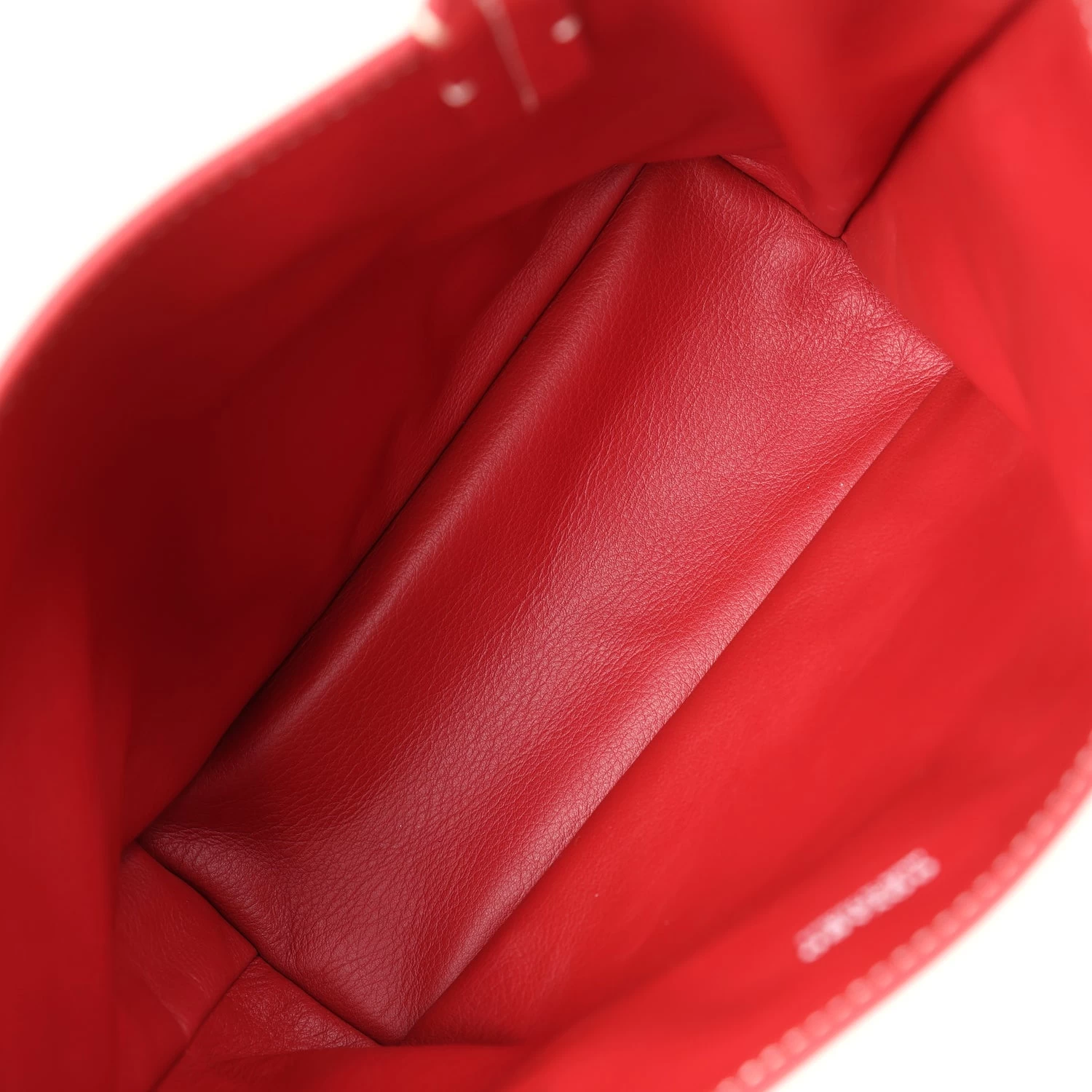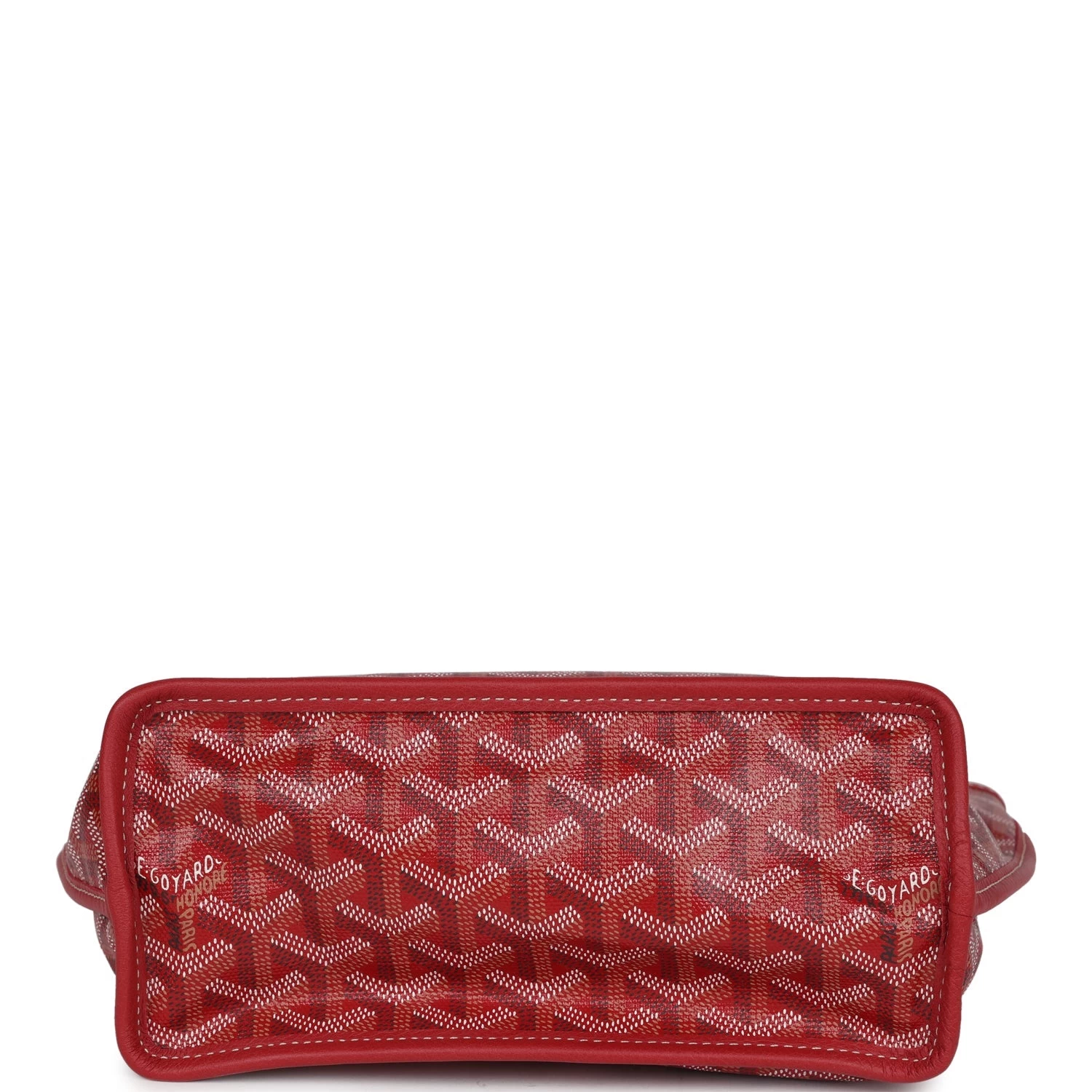This Anjou mini reversible tote is in red goyardine canvas and leather with palladium hardware and features contrast stitching, burgundy leather handles and trim, and a detachable yellow pouch.