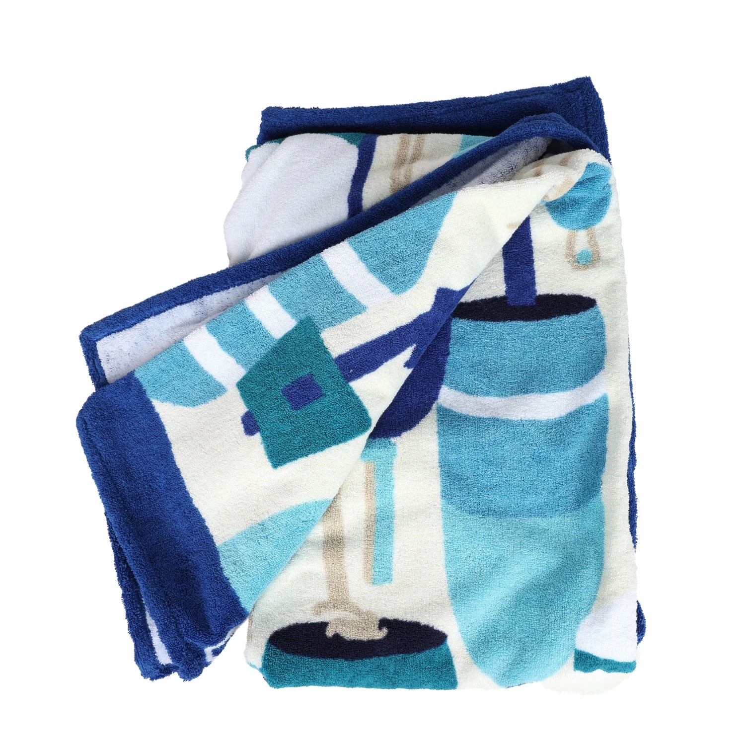 The beach towel included is made of terry cloth and is multicolored with printed floating buoys.