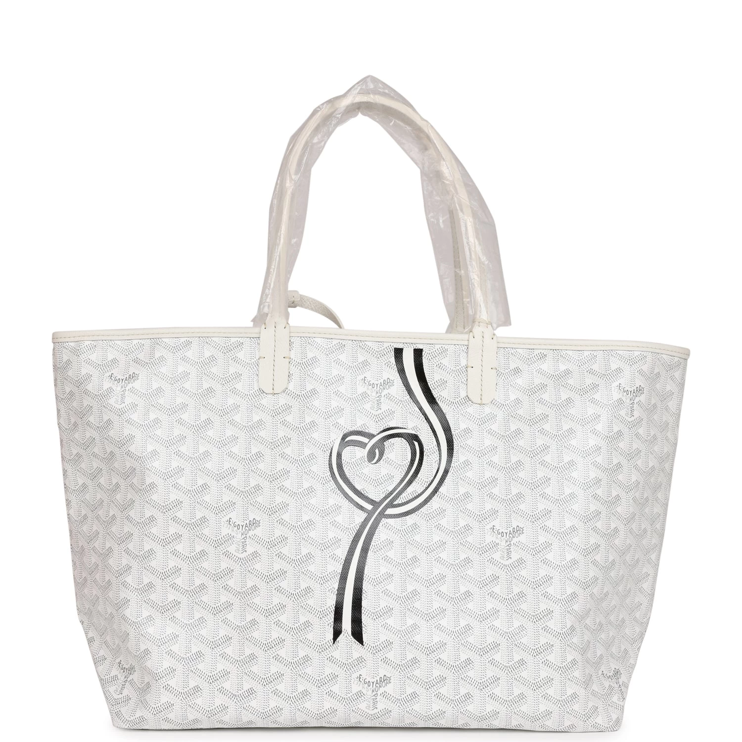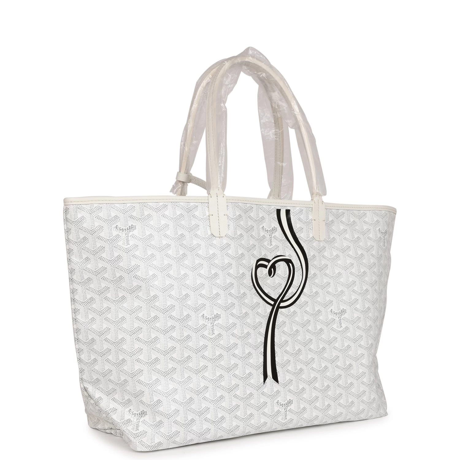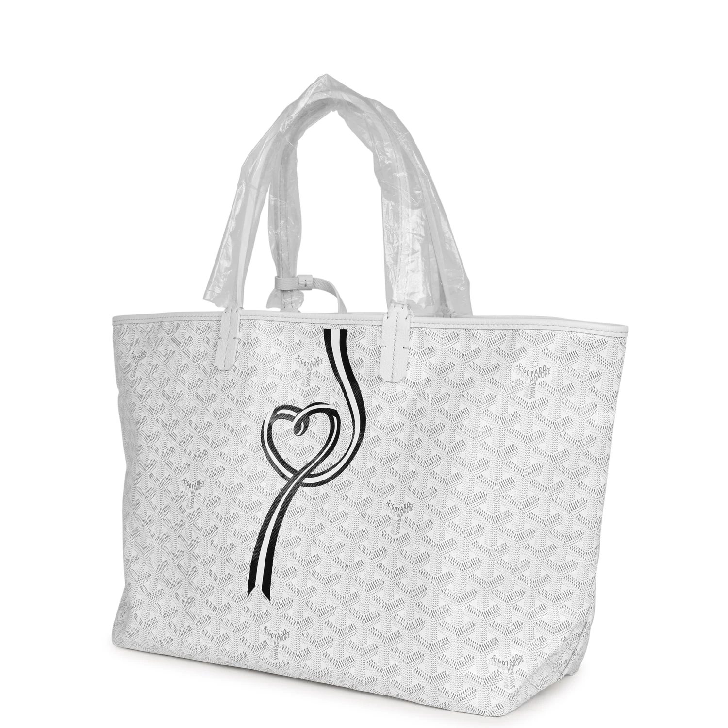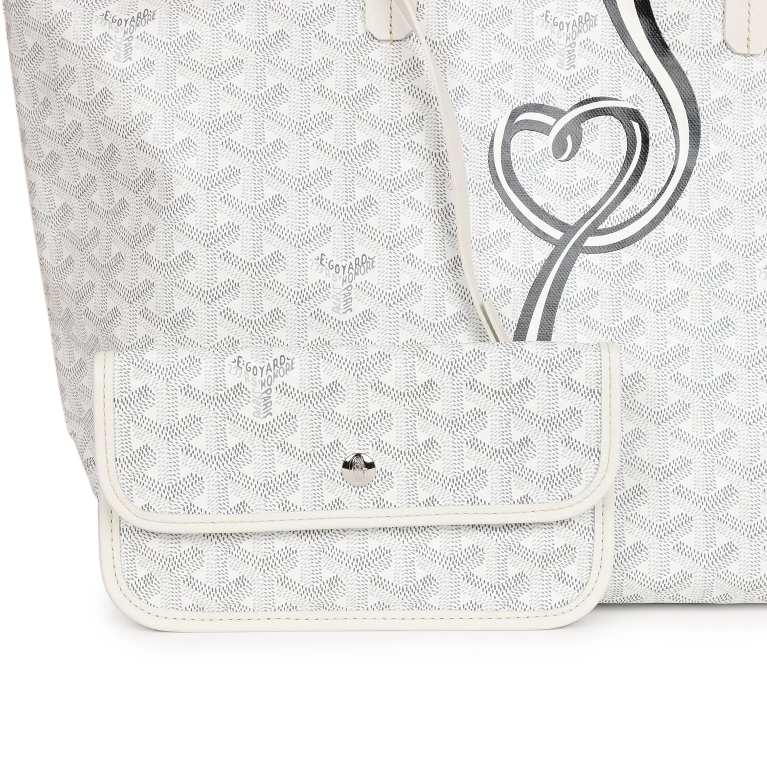 This St. Louis PM tote is in White Goyardine canvas with palladium hardware, featuring a black and white hand-painted coeur ruban motif, contrast stitching, and has a matching detachable button closure wallet.