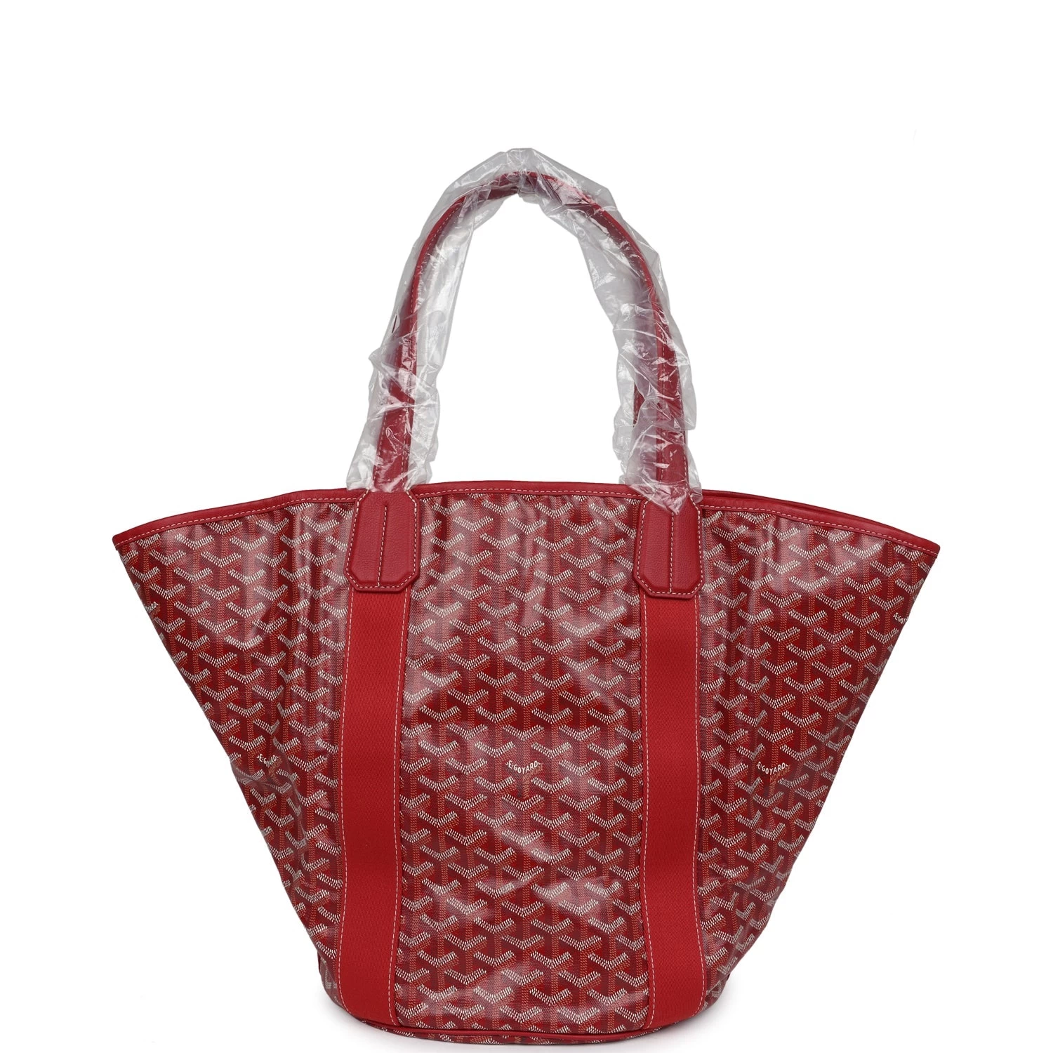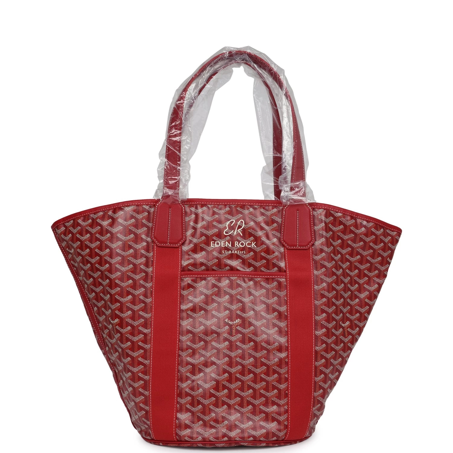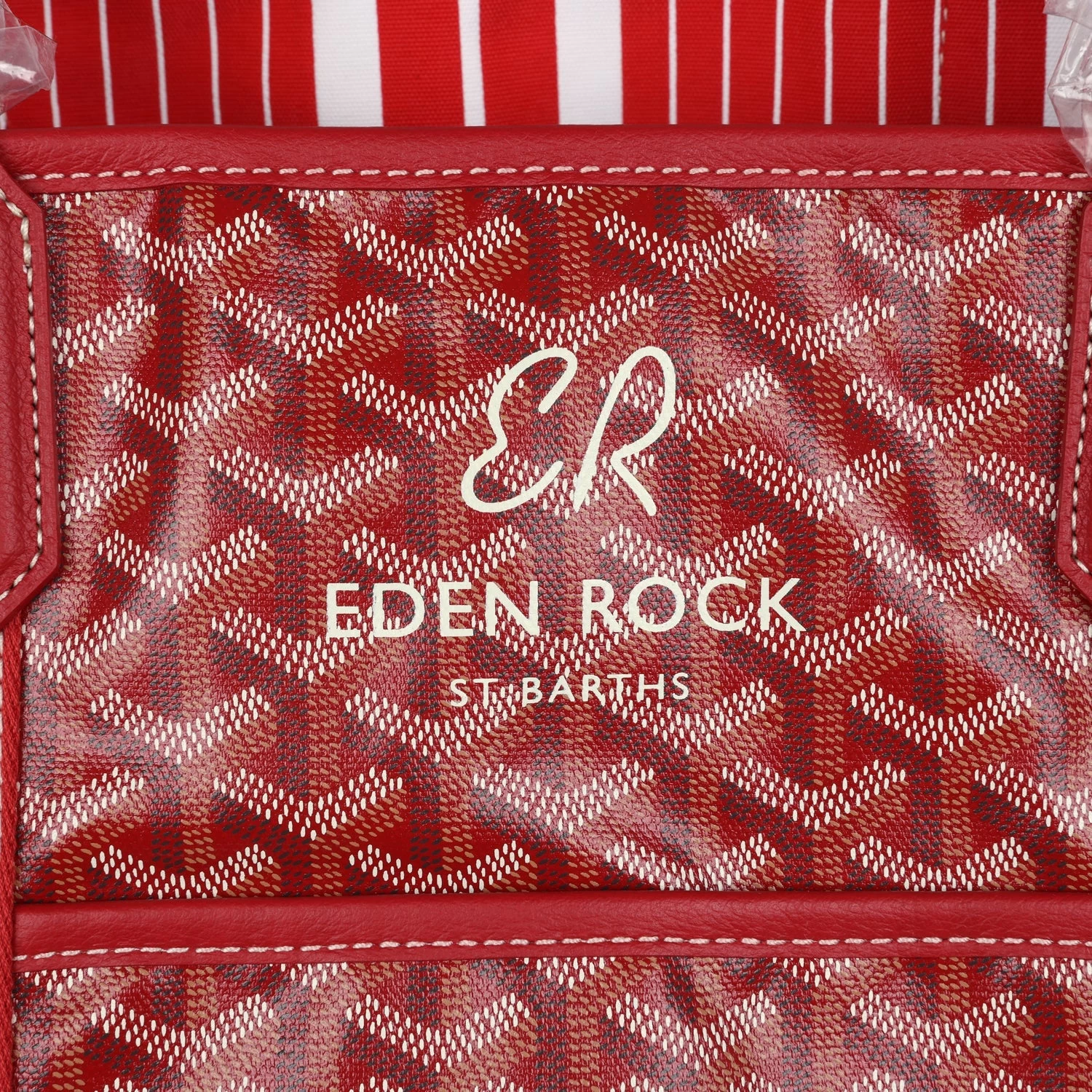 This limited edition reversible Goyard Eden Rock/St Barths Belharra beach bag is in red Goyardine canvas and chevroches calfskin leather, features “ER, Eden Rock, St. Barths” painted on the front, has contrast stitching, red canvas trim down front and back, one single slip pocket on front of bag, two leather top handles.  The interior of the tote bag is lined with striped red and white canvas.