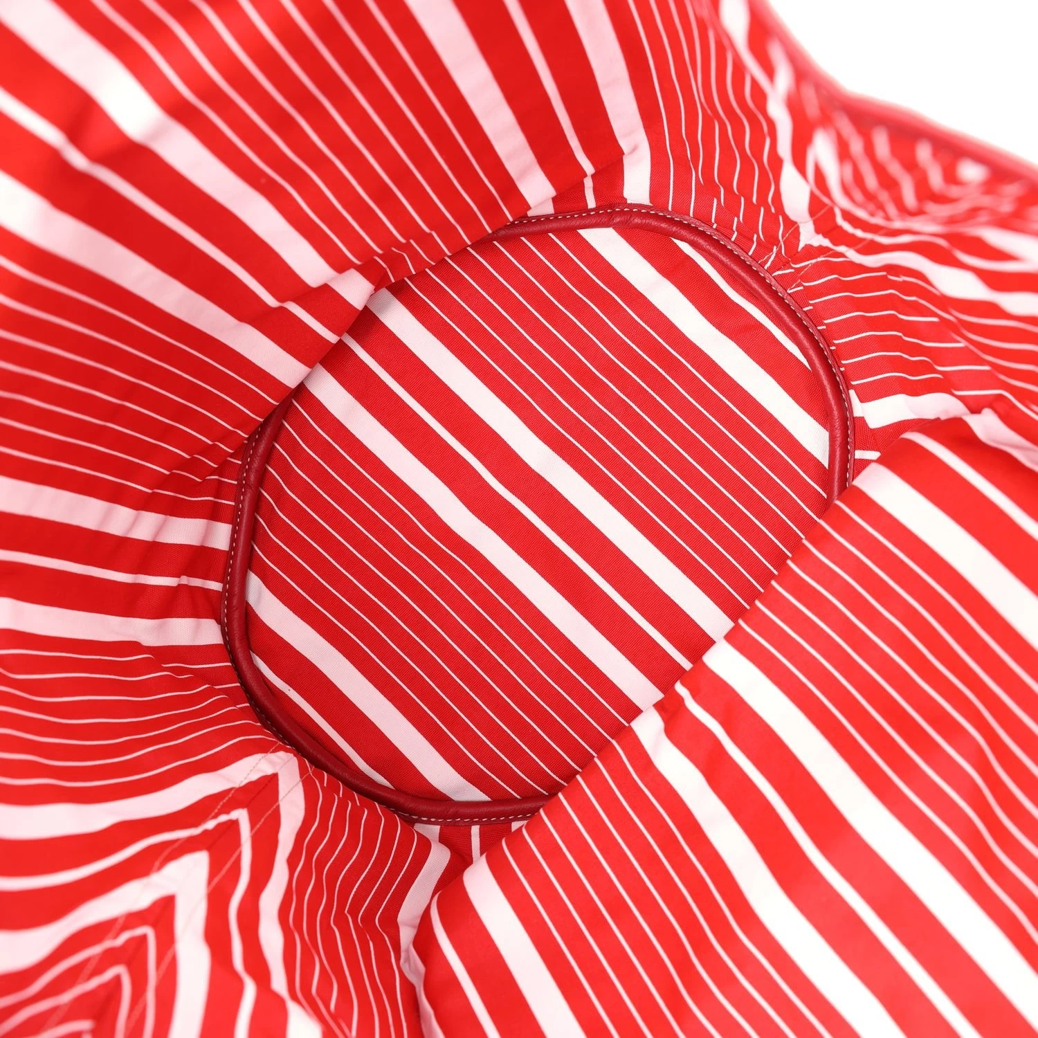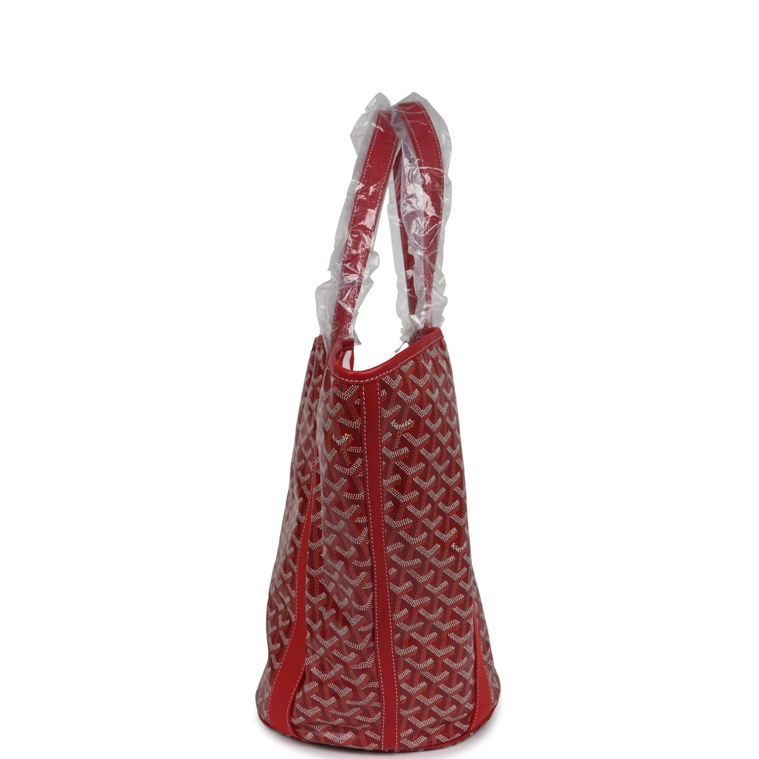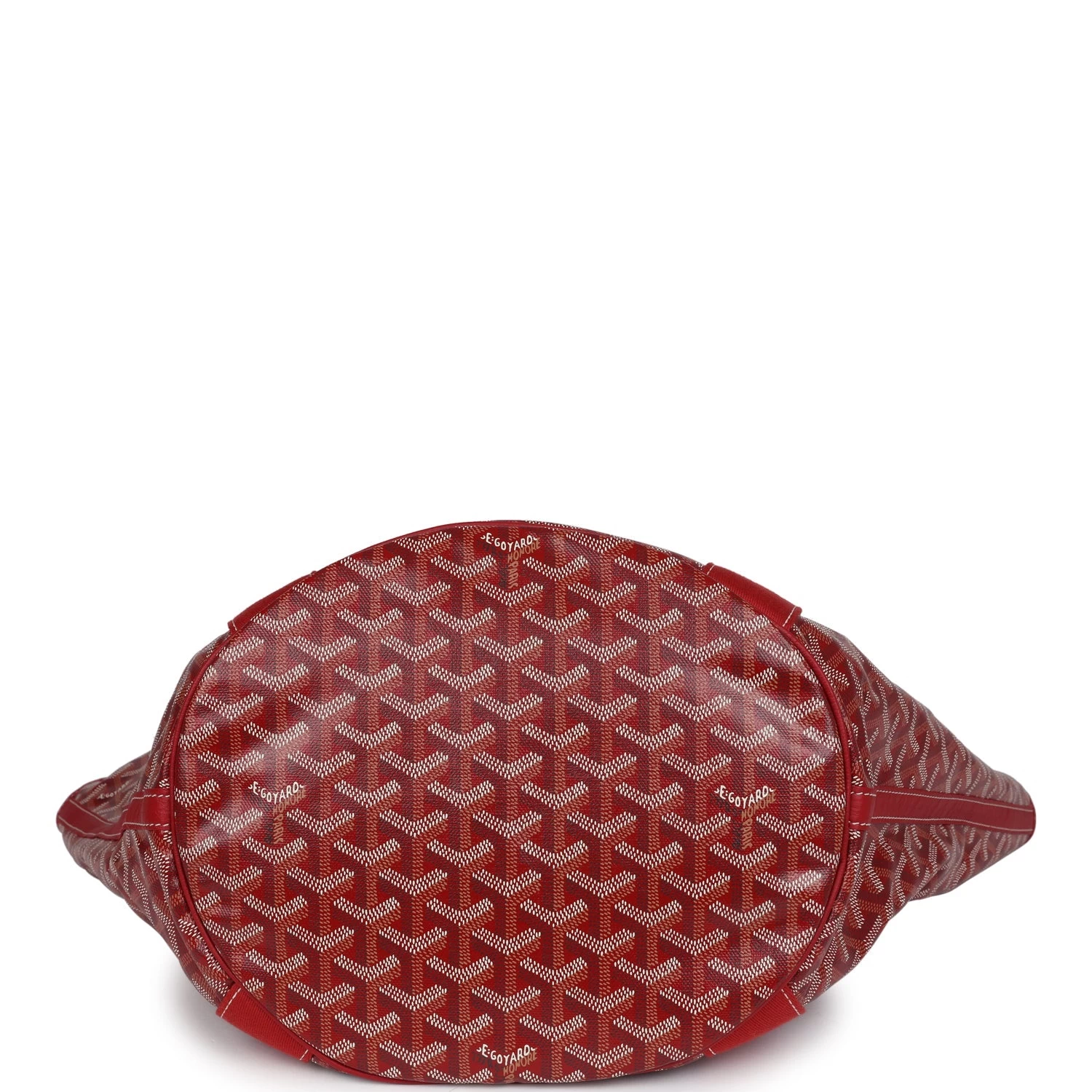 This limited edition reversible Goyard Eden Rock/St Barths Belharra beach bag is in red Goyardine canvas and chevroches calfskin leather, features “ER, Eden Rock, St. Barths” painted on the front, has contrast stitching, red canvas trim down front and back, one single slip pocket on front of bag, two leather top handles.  The interior of the tote bag is lined with striped red and white canvas.