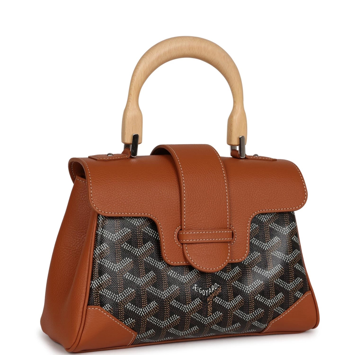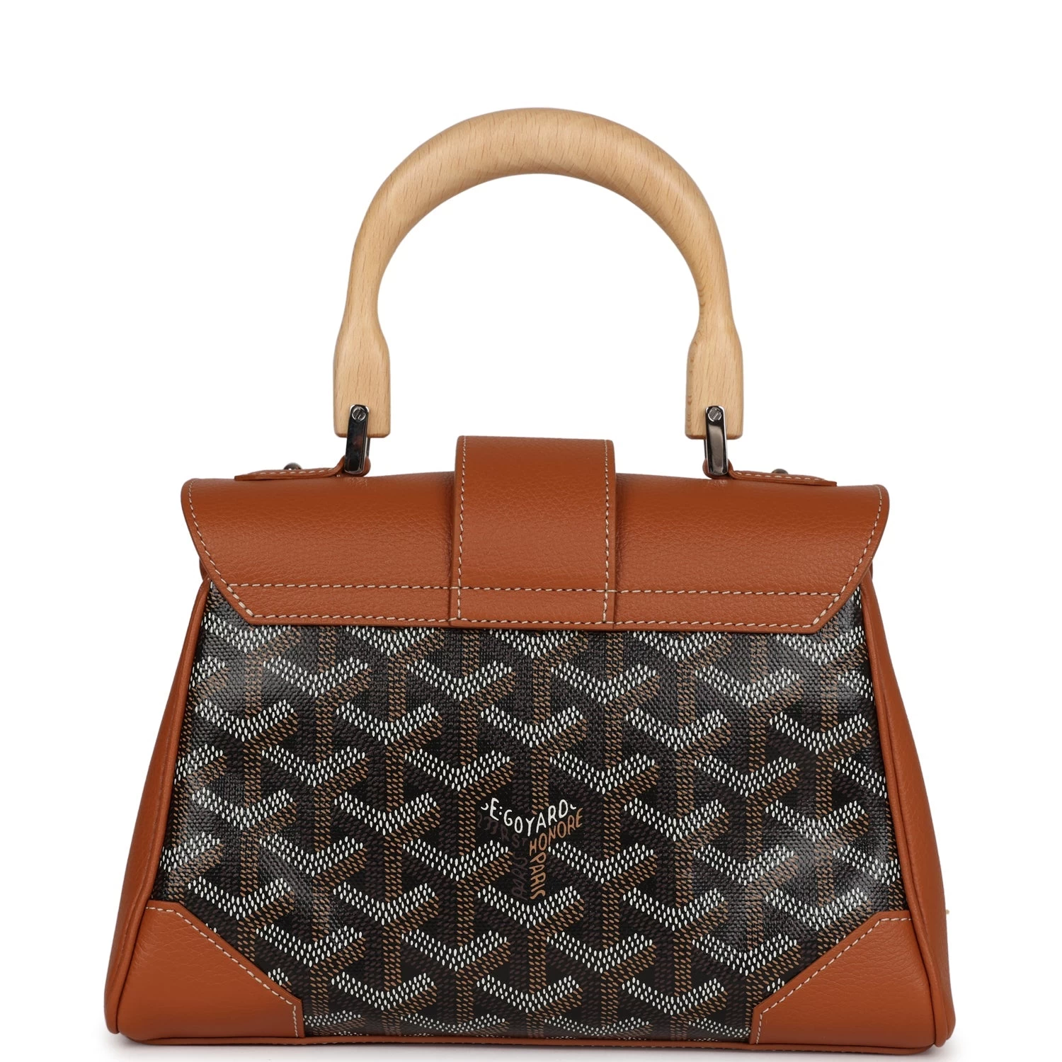 This Saigon Souple Mini is of brown calfskin leather and black goyardine canvas with palladium hardware, features front flap, top handle, removable strap and tonal stitching.