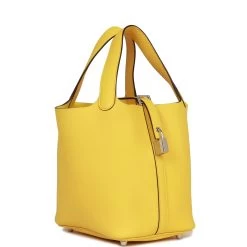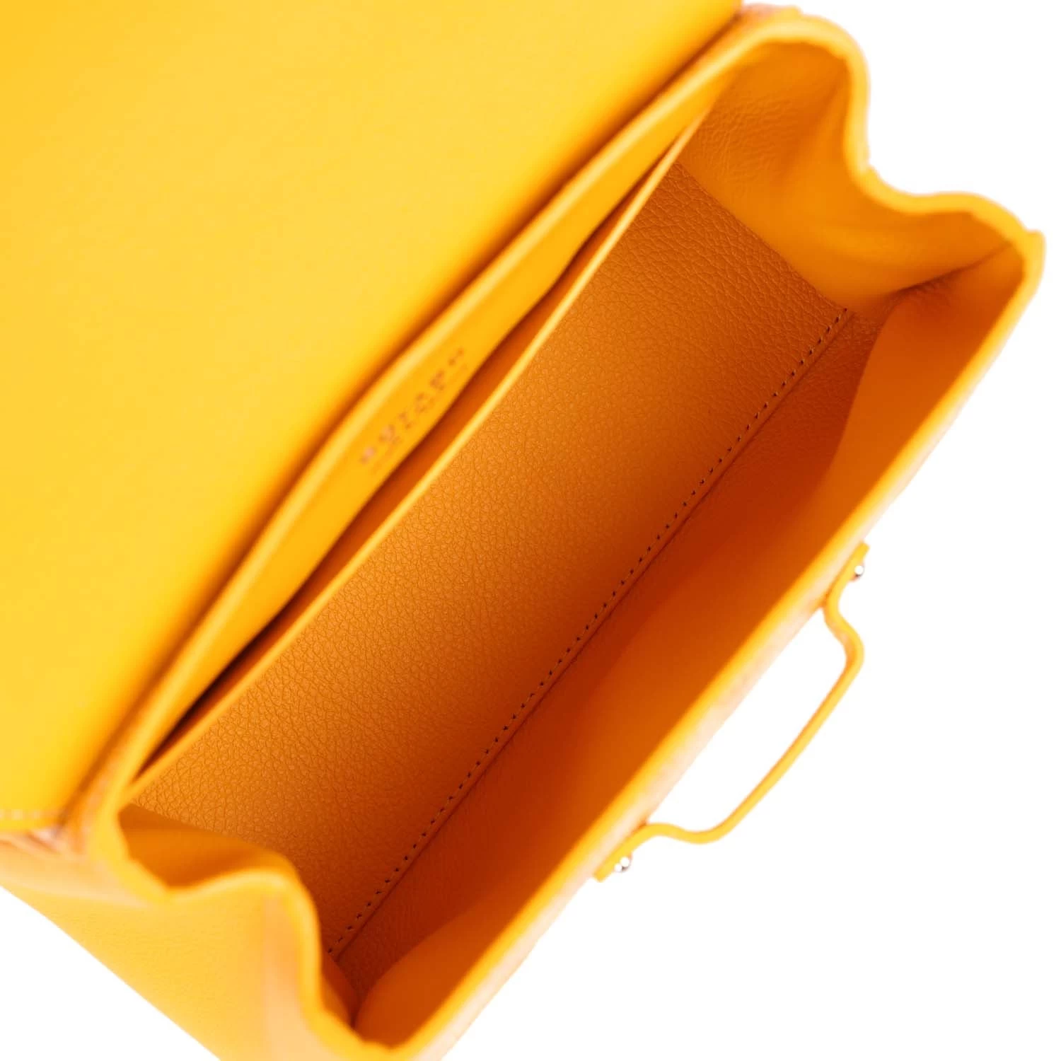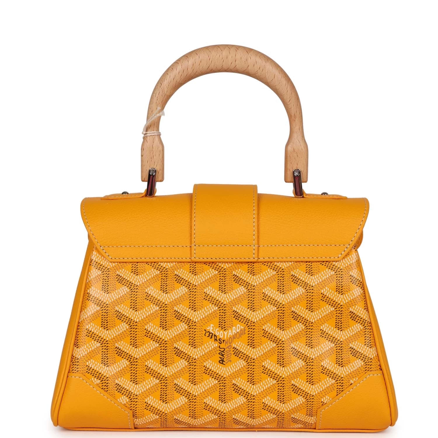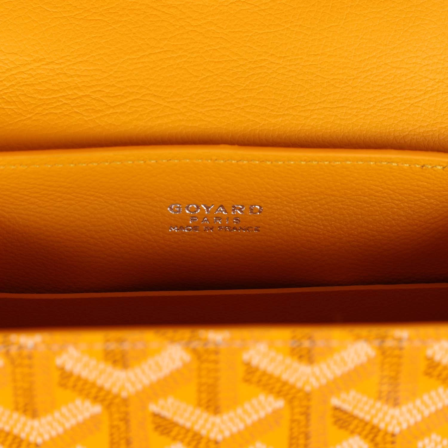 This Saigon Souple Mini is of yellow calfskin leather and goyardine canvas with palladium hardware and features front flap, top handle, removable strap and tonal stitching.